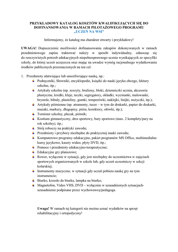 PRZYKŁADOWY KATALOG KOSZTÓW KWALIFIKUJĄCYCH SIĘ DO DOFINANSOWANIA W RAMACH PILOTAśOWEGO PROGRAMU „UCZEŃ NA WSI” Informujemy, Ŝe katalog ma charakter otwarty i przykładowy! UWAGA! Dopuszczenie moŜliwości dofinansowania zakupów dokonywanych w ramach przedmiotowego zapisu traktować naleŜy w sposób indywidualny, odnosząc się do rzeczywistych potrzeb edukacyjnych niepełnosprawnego ucznia wynikających ze specyfiki szkoły, do której uczeń uczęszcza oraz mając na uwadze wymóg racjonalnego wydatkowania środków publicznych przeznaczonych na ten cel. 1. Przedmioty ułatwiające lub umoŜliwiające naukę, np.: Podręczniki, Słowniki, encyklopedie, ksiąŜki do nauki języka obcego, lektury szkolne, itp.; Artykuły szkolne (np. zeszyty, bruliony, bloki, dzienniczki ucznia, akcesoria plastyczne, kredki, kleje, teczki, segregatory, okładki, wycinanki, malowanki, brystole, bibuły, plasteliny, gumki, temperówki, naklejki, linijki, noŜyczki, itp.); Artykuły piśmienne (np. atramenty, tusze – w tym do drukarki, papier do drukarki, mazaki, markery, długopisy, pióra, korektory, ołówki, itp.); Tornister szkolny, plecak, piórnik; Kostium gimnastyczny, dres sportowy, buty sportowe (max. 2 komplety/pary na rok szkolny), itp.; Strój roboczy na praktyki zawodu; Przedmioty i przybory niezbędne do praktycznej nauki zawodu; Komputerowe programy edukacyjne, pakiet programów MS Office, multimedialne kursy językowe, kasety wideo, płyty DVD, itp.; Pomoce i przedmioty edukacyjno-terapeutyczne; Edukacyjne gry planszowe; Rower, wyłącznie w sytuacji, gdy jest niezbędny do uczestnictwa w zajęciach sportowych organizowanych w szkole lub, gdy uczeń uczestniczy w sekcji kolarskiej; Instrumenty muzyczne, w sytuacji gdy uczeń pobiera naukę gry na tym instrumencie; Biurko, krzesło do biurka, lampka na biurko; Magnetofon, Video VHS, DVD – wyłącznie w uzasadnionych sytuacjachuzasadnienie podpisane przez wychowawcę/pedagoga. Uwaga! W ramach tej kategorii nie moŜna uznać wydatków na sprzęt rehabilitacyjny i ortopedyczny! 2. Uczestnictwo w zajęciach mających na celu podniesienie sprawności fizycznej i psychicznej, np.: Zajęcia terapeutyczne; Gimnastyka korekcyjna (zajęcia korekcyjne); Kółka zainteresowań; Zajęcia w szkole muzycznej, ognisku plastycznym, itp.; Basen i odpłatne zajęcia na basenie, np. nauka pływania, itp.; Siłownia, fitness, gimnastyka, itp.; Jazda konna, w tym hippoterapia; Zajęcia w sekcji komputerowej fotograficznej, teatralnej, sportowej, itp.; Obozy, kolonie, zimowiska. Uwaga! Koszt uczestnictwa w zajęciach moŜe obejmować równieŜ koszty dojazdów na zajęcia i powrotu z zajęć do miejsca zamieszkania a takŜe inne uzasadnione koszty bezpośrednio związane z uczestnictwem w zajęciach. Uwaga! W ramach tej kategorii nie moŜna uznać kosztów wizyt lekarskich oraz kosztów turnusów rehabilitacyjnych! 3. Dostęp do Internetu: Instalacja; Abonament za Internet. 4. Kursy doszkalające w zakresie programu nauczania, np.: Kursy językowe; Kursy komputerowe; Prawo jazdy, w przypadku ucznia pobierającego naukę w szkole samochodowej; Kursy naukowo-poznawcze; Korepetycje; Zajęcia z Logopedą. 5. Wyjazdy organizowane w ramach zajęć szkolnych, np.: Wycieczki szkolne (rajdy), itp.; Zielona/biała szkoła; Wyjazdy w ramach praktyk szkolnych; Wyjście do kina, teatru, muzeum, itp.; Wyjazdy w ramach olimpiad szkolnych.