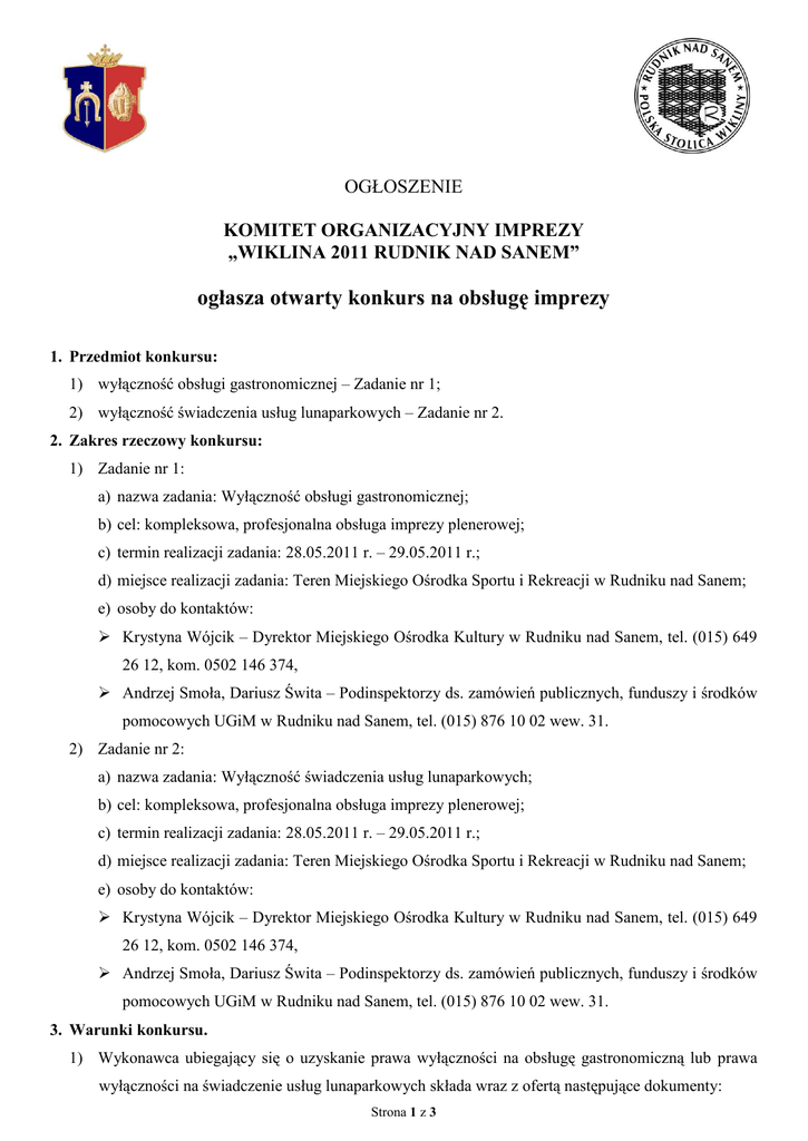 OGŁOSZENIE KOMITET ORGANIZACYJNY IMPREZY „WIKLINA 2011 RUDNIK NAD SANEM” ogłasza otwarty konkurs na obsługę imprezy 1. Przedmiot konkursu: 1) wyłączność obsługi gastronomicznej – Zadanie nr 1; 2) wyłączność świadczenia usług lunaparkowych – Zadanie nr 2. 2. Zakres rzeczowy konkursu: 1) Zadanie nr 1: a) nazwa zadania: Wyłączność obsługi gastronomicznej; b) cel: kompleksowa, profesjonalna obsługa imprezy plenerowej; c) termin realizacji zadania: 28.05.2011 r. – 29.05.2011 r.; d) miejsce realizacji zadania: Teren Miejskiego Ośrodka Sportu i Rekreacji w Rudniku nad Sanem; e) osoby do kontaktów: Krystyna Wójcik – Dyrektor Miejskiego Ośrodka Kultury w Rudniku nad Sanem, tel. (015) 649 26 12, kom. 0502 146 374, Andrzej Smoła, Dariusz Świta – Podinspektorzy ds. zamówień publicznych, funduszy i środków pomocowych UGiM w Rudniku nad Sanem, tel. (015) 876 10 02 wew. 31. 2) Zadanie nr 2: a) nazwa zadania: Wyłączność świadczenia usług lunaparkowych; b) cel: kompleksowa, profesjonalna obsługa imprezy plenerowej; c) termin realizacji zadania: 28.05.2011 r. – 29.05.2011 r.; d) miejsce realizacji zadania: Teren Miejskiego Ośrodka Sportu i Rekreacji w Rudniku nad Sanem; e) osoby do kontaktów: Krystyna Wójcik – Dyrektor Miejskiego Ośrodka Kultury w Rudniku nad Sanem, tel. (015) 649 26 12, kom. 0502 146 374, Andrzej Smoła, Dariusz Świta – Podinspektorzy ds. zamówień publicznych, funduszy i środków pomocowych UGiM w Rudniku nad Sanem, tel. (015) 876 10 02 wew. 31. 3. Warunki konkursu. 1) Wykonawca ubiegający się o uzyskanie prawa wyłączności na obsługę gastronomiczną lub prawa wyłączności na świadczenie usług lunaparkowych składa wraz z ofertą następujące dokumenty: Strona 1 z 3 a) oświadczenie Wykonawcy o dysponowaniu potencjałem technicznym i osobami zdolnymi do wykonania zamówienia (Załącznik nr 2); b) odpis z właściwego rejestru albo zaświadczenie o wpisie do ewidencji działalności gospodarczej; c) kopię aktualnego zezwolenia na sprzedaż napojów alkoholowych (piwo) – dotyczy zadania nr 1, d) w przypadku składania oferty na Zadanie nr 2 należy dołączyć wykaz sprzętu (Załącznik nr 3), który zostanie rozstawiony podczas imprezy wraz z aktualnymi dokumentami potwierdzającymi dobry stan techniczny urządzeń oraz aktualne decyzje dopuszczające urządzenia do eksploatacji. 2) Zamawiający zastrzega sobie prawo wzywania Wykonawców do przedstawienia dodatkowych dokumentów. Dokumenty, o których mowa w ust. 3 pkt 1) lit. b, c należy dołączyć w formie oryginału lub kopii poświadczonej za zgodność przez Wykonawcę. 4. Opis sposobu przygotowania oferty. 1) Wykonawca może złożyć na każde zadanie tylko 1 ofertę. 2) Oferta i wszelkie oświadczenia muszą zawierać: nazwę i adres Wykonawcy oraz podpis i pieczęć osoby upoważnionej do występowania w imieniu Wykonawcy. 3) Oferta musi być sporządzona w języku polskim, w formie pisemnej, na komputerze, maszynie do pisania lub ręcznie długopisem bądź niezmywalnym atramentem. Treść oferty musi odpowiadać treści formularza oferty (Załącznik nr 1). 4) Wszelkie poprawki lub zmiany w ofercie (nie wolno używać korektora) muszą być parafowane przez osobę (osoby) podpisujące ofertę oraz dodatkowo opatrzone datami ich dokonania. 5) Oferta musi być złożona w trwale zamkniętym, nienaruszonym opakowaniu z napisem „Oferta” i tytułem zadania, którego dotyczy. Wszelkie elementy oferty nie opakowane mogą nie być brane pod uwagę podczas otwarcia ofert i oceny ofert. 6) Proponuje się, aby wszystkie zapisane strony oferty wraz z załącznikami były kolejno ponumerowane oraz złączone w sposób trwały. 7) Wszystkie koszty związane z opracowaniem i dostarczeniem oferty obciążają Wykonawcę. 5. Miejsce oraz termin składania i otwarcia ofert. 1) Oferty należy złożyć w budynku Urzędu Gminy i Miasta w Rudniku nad Sanem, ul. Rynek 40, 37 – 420 Rudnik nad Sanem w pokoju nr 7 (Sekretariat) do dnia 18.03.2011 r. do godz. 11:30. Oferty otrzymane po upływie terminu zostaną zwrócone Wykonawcy bez ich otwierania. 2) Otwarcie ofert odbędzie się w dniu 18.03.2011 r. o godz. 12:00 w budynku Urzędu Gminy i Miasta w Rudniku nad Sanem, ul. Rynek 40, 37 – 420 Rudnik nad Sanem w pokoju nr 13 (Sala posiedzeń). Otwarcie ofert jest jawne. 6. Kryteria oraz sposób oceny ofert. 1) Oferty będą oceniane według następujących kryteriów: Strona 2 z 3 Nr: Nazwa kryterium: Waga: 1 Cena 100% 2) Punkty przyznawane za podane w ust. 1 kryteria będą liczone według następującego wzoru: Wzór: Nr kryterium: Liczba punktów = (Cof/ Cmax) x 100 1 – Cena gdzie: - Cmax – najwyższa cena spośród wszystkich ofert, - Cof – cena oferty badanej. 3) W przypadku, gdy nie można będzie dokonać wyboru oferty najkorzystniejszej ze względu na to, że zostały złożone oferty o takiej samej cenie wówczas Wykonawcy, którzy złożyli oferty zawierające takie same ceny zostaną wezwani do złożenia ofert dodatkowych w terminie do 2 dni roboczych. 4) Za najkorzystniejszą zostanie uznana oferta, która uzyska najwyższą liczbę punktów zgodnie – cena z kryterium wskazanym w ust.- Cn 6 pkt 1. najwyższa 7. Formalności przedumowne. 1) Niezwłocznie po wyborze najkorzystniejszej oferty Zamawiający zawiadomi o tym Wykonawców, którzy złożyli oferty oraz udostępni tę informację na stronie internetowej (www.rudnik.pl). 2) Umowa z Wykonawcą, którego oferta zostanie wybrana, zostanie zawarta w terminie 5 dni roboczych od dnia przekazania zawiadomienia o wyborze najkorzystniejszej oferty. 3) Jeżeli Wykonawca, którego oferta została wybrana będzie się uchylał od zawarcia umowy, Zamawiający wybierze ofertę najkorzystniejszą spośród pozostałych ofert, bez przeprowadzania ich ponownej oceny. 8. Informacje dodatkowe: Komitet Organizacyjny informuje, że podczas trwania imprezy: 1) czynna będzie Restauracja „Orle Gniazdo”, w 