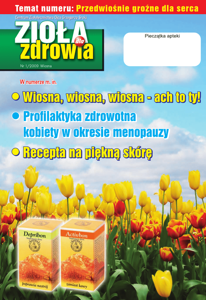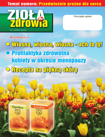 Wiosenne Porządki Na przełomie zimy i wiosny dość często otrzymujemy telefony z prowokacyjnym pytaniem: Czy mają Państwo jakieś cudowne środki, które pomogą mi schudnąć bez ograniczania jedzenia? Rozmówczyni prawdopodobnie spodziewa się, że usłyszy: bardzo nam przykro, ale to niemożliwe. Jakie jest jej zdziwienie, kiedy dowiaduje się, że jednak jest to możliwe. Zatem, co należy zrobić, aby schudnąć nie ograniczając ilości spożywanego jedzenia. Po pierwsze równie ważną sprawą jak ilość jedzenia jest częstotliwość spożywanych pokarmów. Jeżeli tą samą ilość jedzenia ujmiemy w dwóch porcjach w ciągu dnia – przytyjemy, a gdy rozdzielimy to na 4 porcje – schudniemy. Ważnym elementem w odżywianiu jest również to, jak szybko pokarm podnosi poziom glukozy w surowicy krwi. Im pokarm szybciej „osładza” krew, tym gorzej, gdyż prowadzi to do zwyżki wagi. Najszybciej zwiększają stężenie glukozy słodycze, biały chleb, biały ryż, ziemniaki, a zwłaszcza frytki, a najmniej min. owoce, surowe warzywa i o dziwo gorzka czekolada. Wskaźnikiem, który określa, jak szybko dany produkt podnosi poziom glukozy w surowicy krwi jest indeks glikemiczny, im jest on wyższy, tym bardziej sprzyja nadwadze. Wracając do cudownych środków odchudzających, zazwyczaj zalecamy w Centrum Ziołolecznictwa Ojca Grzegorza 2 preparaty – oczywiście nie działają one na zasadzie cudu, ale w bardzo naturalny i racjonalny sposób. Pierwszy z nich to Chitobon, który przyjmujemy 1-2 x dziennie po 3 kaps. pół godziny przed posiłkiem i popijamy szklanką wody. Powoduje on zmniejszenie wchłaniania tłuszczu z przewodu pokarmowego, przez co jest odpowiedni dla posiłków z mięsem i nabiałem. Powoduje on pęcznienie w żołądku, co zmniejsza ilość spożywanych pokarmów. Drugi preparat to Adipobon mono zalecany u osób aktywnych fizycznie. Nie mamy na myśli wyczynów sportowych, wystarczy nawet forsowny spacer, czy bardziej intensywne sprzątanie w domu. Sugerujemy zażywać 2 kapsułki na pół godziny przed planowanym wysiłkiem. Podsumowując, Adipobon mono okaże się szczególnie pomocny przed świątecznymi porządkami, a Chitobon sprawdzi się najlepiej, gdy na Wielkanocnym stole pojawią się smakowite, ale nie zawsze dietetyczne potrawy. Życzenia Radosnych Świąt Wielkanocnych wypełnionych nadzieją budzącej się do życia wiosny i wiarą w sens życia. Pogody w sercu i radości płynącej z faktu Zmartwychwstania Pańskiego oraz smacznego Święconego w gronie rodziny składa Centrum Ziołolecznictwa Ojca Grzegorza Sroki 2 Antybiotyki a skóra C zęsto w Centrum Ziołolecznictwa spotykamy się z pacjentami, którzy zgłaszają się z trądzikiem długotrwale leczonym antybiotykami bez większych efektów. Są to najczęściej ludzie młodzi. Nasze leczenie trądziku zwłaszcza zaognionego jest zupełnie inne i mimo, iż nie jest agresywne jak antybiotykoterapia, to czasami okazuje się bardziej skuteczne. Uważamy, że choroby skóry to często w istocie skórna manifestacja chorób ogólnoustrojowych. Najważniejsza według naszej koncepcji jest normalizacja pracy przewodu pokarmowego, a zwłaszcza odbudowa prawidłowej flory bakteryjnej w jelicie grubym. Problem z trądzikiem zaczyna się często od złego odżywiania (słodycze, fast foody) jak również od stresu, który obniża odporność organizmu na infekcje. Pomijamy przyczyny hormonalne, których w okresie dojrzewania nie da się wyeliminować zatem nie będą one przedmiotem rozważań. Wracając do diety i stresu, klasycznym przykładem może być 20-letnia studentka. Na skutek wymienionych czynników pojawił się u niej trądzik. Początkowo stosowała preparaty kosmetyczne, ale poprawa była niewielka, a dodatkowo pojawiły się ropne krostki, a co najgorsze nadal odżywiała się niewłaściwie i miała „szkolny” stres. Udała się więc do dermatologa, który zaaplikował antybiotyki. Te z kolei obniżyły odporność, zniszczyły florę bakteryjną w jelicie grubym, a to doprowadziło do powstania błędnego koła. Ponieważ im mniej w przewodzie pokarmowym bakterii probiotycznych, tym skóra i odporność mają się gorzej, co z kolei powoduje więcej „zanieczyszczeń” na twarzy. Rozwiązaniem jest przerwanie tego błędnego koła poprzez: 1.Włączenie leków poprawiających stan jelit np. Gastrobonisolu lub Gastrobonu, 2.Wprowadzenie środków poprawiających odporność organizmu: syropu Immunobon i preparatu w kapsułkach Apibon (ten ostatni działa również przeciwbakteryjnie), 3. Stosowanie na skórę Bonidermu, a na ropne krostki kremu Apibon zawierającego propolis i olejki eteryczne. Takie modelowe postępowanie najczęściej poprawia stan skóry i przywraca równowagę w organizmie. • Trądzik • Łuszczyca • Wyprysk alergiczny i niealergiczny • Stany zapalne i ropne skóry • Opryszczka Fundacja Pomocy Dzieciom Fundacja Pomocy Dzieciom działa od 1998 r. i posiada status Organizacji Pożytku Publicznego. Jej głównym celem jest rehabilitacja i edukacja dzieci niepełnosprawnych. Fundacja prowadzi m.in. Centrum Rehabilitacyjno Edukacyjne dla dzieci. www.fpd.ig.pl KRS100243 Fundację Pomocy Dzieciom współtworzył Ojciec Grzegorz i do końca życia był członkiem jej Rady Nadzorczej. 3 Profilaktyka zdrowotna kobiety w okresie menopauzy M 4 enopauza to okres, w którym organizm kobiety ulega dużym zmianom. Zmiany te powodują często przykre dolegliwości, ale także mogą zwiększać niebezpieczeństwo zachorowania na różne, czasami groźne schorzenia. Aby poprawić komfort życia w okresie klimakterium, czasami wystarczy zażywać Klimaktobon, który łagodzi uderzenia gorąca, nadmierną drażliwość, potliwość oraz inne objawy. Efekty działania tego preparatu wywołane są przez ziele pluskwicy i szyszki chmielu, które wykazują działanie podobne do żeńskich hormonów płciowych: estrogenów. Kobiety pragnące zachować zdrowie 