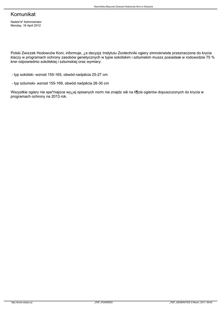 Warmiñsko-Mazurski Zwi±zek Hodowców Koni w Olsztynie Komunikat Nades³a³ Administrator Monday, 16 April 2012 Polski Zwi±zek Hodowców Koni, informuje, ¿e decyzj± Instytutu Zootechniki ogiery zimnokrwiste przeznaczone do krycia klaczy w programach ochrony zasobów genetycznych w typie sokólskim i sztumskim musz± posiadaæ w rodowodzie 75 % krwi odpowiednio sokólskiej i sztumskiej oraz wymiary: - typ sokólski -wzrost 155-165, obwód nadpêcia 25-27 cm - typ sztumski- wzrost 155-169, obwód nadpêcia 26-30 cm Wszystkie ogiery nie spe³niaj±ce wy¿ej opisanych norm nie znajd± siê na li¶cie ogierów dopuszczonych do krycia w programach ochrony na 2013 rok. http://konie.olsztyn.pl _PDF_POWERED _PDF_GENERATED 2 March, 2017, 09:45