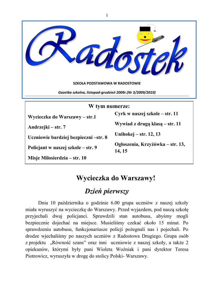 1 SZKOŁA PODSTAWOWA W RADOSTOWIE Gazetka szkolna, listopad-grudzień 2009r.(Nr 3/2009/2010) W tym numerze: Wycieczka do Warszawy – str.1 Cyrk w naszej szkole – str. 11 Wywiad z drugą klasą – str. 11 Andrzejki – str. 7 Uczniowie bardziej bezpieczni –str. 8 Policjant w naszej szkole – str. 9 Unihokej – str. 12, 13 Ogłoszenia, Krzyżówka – str. 13, 14, 15 Misje Miłosierdzia – str. 10 Wycieczka do Warszawy! Dzień pierwszy Dnia 10 października o godzinie 6.00 grupa uczniów z naszej szkoły miała wyruszyć na wycieczkę do Warszawy. Przed wyjazdem, pod naszą szkołę przyjechali dwaj policjanci. Sprawdzili stan autobusu, abyśmy mogli bezpiecznie dojechać na miejsce. Musieliśmy czekać około 15 minut. Po sprawdzeniu autobusu, funkcjonariusze policji pożegnali nas i pojechali. Po drodze wjechaliśmy po naszych uczniów z Radostowa Drugiego. Grupa osób z projektu „Równość szans” oraz inni uczniowie z naszej szkoły, a także 2 opiekunów, którymi były pani Wioleta Woźniak i pani dyrektor Teresa Piotrowicz, wyruszyła w drogę do stolicy Polski- Warszawy. 2 Park Łazienkowski Pierwszym punktem naszej wycieczki było zwiedzenie Parku Łazienkowskiego. Zbudował go ostatni król PolskiStanisław August Poniatowski. Przy wejściu spotkaliśmy się z naszym przewodnikiem. Najpierw obejrzeliśmy Łazienki na mapie. Następnie poszliśmy zobaczyć pałac, w którym król przyjmował gości. Był przyozdobiony wieloma rzeźbami, przedstawiającymi postaci ludzi. Budynek kuchni był ogromny, jak na pomieszczenie dla służby. Na nim była pamiątkowa tablica poświęcona wybuchowi powstania listopadowego. Obok znajdowało się popiersie pułkownika Piotra Wysockiego – organizatora wspomnianego powstania. W końcu doszliśmy do centralnego budynku Łazienek. Był wyjątkowo piękny. Wokół niego stało wiele posągów i rzeźb. Jednak uczestnikom wycieczki najbardziej spodobały się łabędzie i dzikie kaczki. Za życia króla Poniatowskiego były tam: pawie, wiewiórki, łabędzie, sarny, kaczki, jelenie, jeże, żółwie, lisy, a zdarzało się tam nawet spotkać dziki. Naszą grupę zadziwiło także to, że po tym parku spacerowały kiedyś baranki pudrowane na różowo, a do szyi miały przywiązane kokardki z dzwoneczkami. Gdy schodziliśmy z mostku, zobaczyliśmy jednego z pawi. Niektórzy uczniowie próbowali go nawet namówić, żeby rozłożył ogon. Potem udaliśmy się do amfiteatru. Jest to teatr „pod gołym niebem”. „Wspięliśmy” się na najwyższe siedzenia. Potem znaleźliśmy trochę czasu na zabawę z wiewiórkami. 3 Na skraju Parku Łazienkowskiego znajduje się Belweder. Pałac był siedzibą Naczelnika Państwa i Prezydenta II RP do 1926r., ministra spraw wojskowych Józefa Piłsudskiego 1926-1935, niemieckiego gubernatora Warszawy Ludwiga Eischera w latach 19391945, przywódcy PRLBolesława Bieruta do 1945 i siedzibą prezydencką na początku III Rzeczypospolitej. Obecnie Belweder pozostaje własnością Kancelarii Prezydenta RP i jest używany do celów reprezentacyjnych. Pod pałacem Belwederu znajduje się pomnik Józefa Piłsudskiego, przy którym mamy zrobione zdjęcie. Kolejnym ważnym pomnikiem był pomnik Fryderyka Chopina. Pod tym pomnikiem zrobiliśmy wiele fotografii. Idąc do wyjścia oglądaliśmy pałac żony Stanisława Augusta Poniatowskiego. Przed wyjściem z Parku Łazienkowskiego ujrzeliśmy pomnik hetmana Polski-Jana Sobieskiego. Telewizja Polska Kolejnym punktem wycieczki była Telewizja Polska. Przejechaliśmy autobusem pod budynek TVP. Rozebraliśmy się w szatni i spotkaliśmy się z przewodnikiem Michałem Fajkowskim. Kazał nam być cicho i nie biegać. Poszliśmy do studia programu „Gilotyna”. Dowiedzieliśmy się, że w tym samym pomieszczeniu są nagrywane „Domisie”, „Ziarno”, „Budzik”. Poszliśmy także do reporterki. Było to nowocześnie wyposażone pomieszczenie, w którym obraz jest cyfrowo 4 przetwarzany. Innym programem, którego studio udało nam się zwiedzić był „Tydzień” oraz „Kawa czy herbata”. Potem pan Michał Fajkowski nas zaskoczył. Okazało się, że pójdziemy do sławnego programu „Jaka to melodia”. Zdążyliśmy na nagranie i mogliśmy zobaczyć występ grupy tanecznej z Lublina. Zdziwiliśmy się bardzo, że piosenki, które wyglądają jakby były śpiewane „na żywo” są po prostu nagrane wcześniej w studiu radiowym. W studio TVP nagrywa się obraz i dopiero wówczas dopasowuje do dźwięku. Gościliśmy również w studio, gdzie nagrywa się program „Pytanie na śniadanie”. Gwiazdą, którą udało nam się spotkać była prowadząca programu „Pytanie na śniadanie”. Zwiedziliśmy również małe muzeum telewizyjne, które dopiero się rozwija. Po zwiedzeniu Telewizji Polskiej mamy wyobrażenie o tym, jak powstaje program telewizyjny. Miejsce to zauroczyło nas również swym wyglądem. Nie zapomnimy niedużych rozmiarów studia nagrań oraz dobudowanego nowoczesnego obiektu ze szklanymi podłogami. Pałac Kultury i Nauki Musieliśmy potem wejść do podziemi, by wsiąść do metra. Jeździ ono bardzo szybko. Dojechaliśmy nim do centrum Warszawy w kilka minut. Musieliśmy dojść pieszo do Pałacu Kultury i Nauki. Jest to najwyższy budynek w Polsce mieszczący się przy placu Defilad.. Ma 230 m wysokości oraz 42 piętra. W całym budynku znajduje się 3288 pomieszczeń. Pałac Kultury i Nauki został wybudowany w trzy lata i oddany do użytku w 1955 r. Wzniesiony jako dar narodu radzieckiego dla narodu polskiego. W środku zakupiliśmy pamiątki. Na 30 piętro wjechaliśmy najszybszą w Polsce 5 windą. Były tam piękne widoki. Pałac ten to wielki obiekt, dzięki czemu można obejrzeć panoramę Warszawy z lotu ptaka. Jednak wielkim nieszczęściem było to, że jednemu uczniowi potrzaskała się piękna pamiątka szklana kula. Zjeżdżając na dół podzieliliśmy się na kilka grup. Restauracja „Menora” i nocleg Byliśm