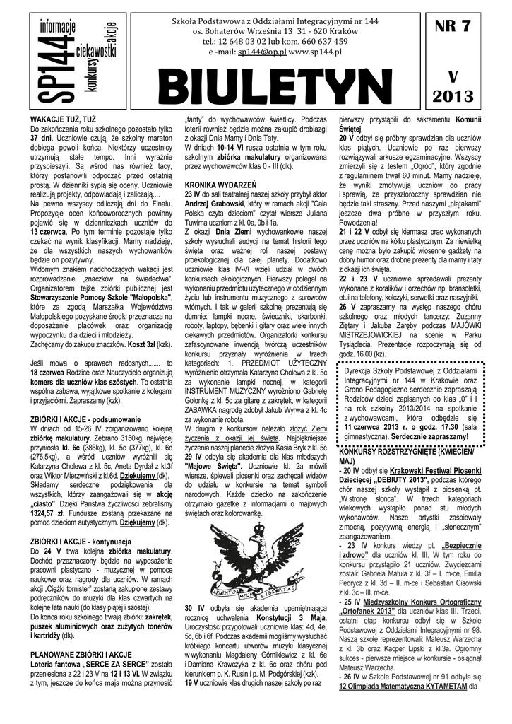 Szkoła Podstawowa z Oddziałami Integracyjnymi nr 144 os. Bohaterów Września 13 31 - 620 Kraków tel.: 12 648 03 02 lub kom. 660 637 459 e -mail: [email protected] www.sp144.pl BIULETYN WAKACJE TUŻ, TUŻ Do zakończenia roku szkolnego pozostało tylko 37 dni. Uczniowie czują, że szkolny maraton dobiega powoli końca. Niektórzy uczestnicy utrzymują stałe tempo. Inni wyraźnie przyspieszyli. Są wśród nas również tacy, którzy postanowili odpocząć przed ostatnią prostą. W dzienniki sypią się oceny. Uczniowie realizują projekty, odpowiadają i zaliczają.... Na pewno wszyscy odliczają dni do Finału. Propozycje ocen końcoworocznych powinny pojawić się w dzienniczkach uczniów do 13 czerwca. Po tym terminie pozostaje tylko czekać na wynik klasyfikacji. Mamy nadzieję, że dla wszystkich naszych wychowanków będzie on pozytywny. Widomym znakiem nadchodzących wakacji jest rozprowadzanie „znaczków na świadectwa". Organizatorem tejże zbiórki publicznej jest Stowarzyszenie Pomocy Szkole "Małopolska", które za zgodą Marszałka Województwa Małopolskiego pozyskane środki przeznacza na doposażenie placówek oraz organizację wypoczynku dla dzieci i młodzieży. Zachęcamy do zakupu znaczków. Koszt 3zł (kzk). Jeśli mowa o sprawach radosnych....... to 18 czerwca Rodzice oraz Nauczyciele organizują komers dla uczniów klas szóstych. To ostatnia wspólna zabawa, wyjątkowe spotkanie z kolegami i przyjaciółmi. Zapraszamy (kzk). ZBIÓRKI I AKCJE - podsumowanie W dniach od 15-26 IV zorganizowano kolejną zbiórkę makulatury. Zebrano 3150kg, najwięcej przyniosła kl. 6c (386kg), kl. 5c (377kg), kl. 6d (276,5kg), a wśród uczniów wyróżnili się Katarzyna Cholewa z kl. 5c, Aneta Dyrdał z kl.3f oraz Wiktor Mierzwiński z kl.6d. Dziękujemy (dk). Składamy serdeczne podziękowania dla wszystkich, którzy zaangażowali się w akcję „ciasto”. Dzięki Państwa życzliwości zebraliśmy 1324,57 zł. Fundusze zostaną przekazane na pomoc dzieciom autystycznym. Dziękujemy (dk). ZBIÓRKI I AKCJE - kontynuacja Do 24 V trwa kolejna zbiórka makulatury. Dochód przeznaczony będzie na wyposażenie pracowni plastyczno - muzycznej w pomoce naukowe oraz nagrody dla uczniów. W ramach akcji „Ciężki tornister” zostaną zakupione zestawy podręczników do muzyki dla klas czwartych na kolejne lata nauki (do klasy piątej i szóstej). Do końca roku szkolnego trwają zbiórki: zakrętek, puszek aluminiowych oraz zużytych tonerów i kartridży (dk). PLANOWANE ZBIÓRKI I AKCJE Loteria fantowa „SERCE ZA SERCE” została przeniesiona z 22 i 23 V na 12 i 13 VI. W związku z tym, jeszcze do końca maja można przynosić „fanty” do wychowawców świetlicy. Podczas loterii również będzie można zakupić drobiazgi z okazji Dnia Mamy i Dnia Taty. W dniach 10-14 VI rusza ostatnia w tym roku szkolnym zbiórka makulatury organizowana przez wychowawców klas 0 - III (dk). KRONIKA WYDARZEŃ 23 IV do sali teatralnej naszej szkoły przybył aktor Andrzej Grabowski, który w ramach akcji "Cała Polska czyta dzieciom" czytał wiersze Juliana Tuwima uczniom z kl. 0a, 0b i 1a. Z okazji Dnia Ziemi wychowankowie naszej szkoły wysłuchali audycji na temat historii tego święta oraz ważnej roli naszej postawy proekologicznej dla całej planety. Dodatkowo uczniowie klas IV-VI wzięli udział w dwóch konkursach ekologicznych. Pierwszy polegał na wykonaniu przedmiotu użytecznego w codziennym życiu lub instrumentu muzycznego z surowców wtórnych. I tak w galerii szkolnej prezentują się dumnie: lampki nocne, świeczniki, skarbonki, roboty, laptopy, bębenki i gitary oraz wiele innych ciekawych przedmiotów. Organizatorki konkursu zafascynowane inwencją twórczą uczestników konkursu przyznały wyróżnienia w trzech kategoriach: 1. PRZEDMIOT UŻYTECZNY wyróżnienie otrzymała Katarzyna Cholewa z kl. 5c za wykonanie lampki nocnej, w kategorii INSTRUMENT MUZYCZNY wyróżniono Gabrielę Golonkę z kl. 5c za gitarę z zakrętek, w kategorii ZABAWKA nagrodę zdobył Jakub Wyrwa z kl. 4c za wykonanie robota. W drugim z konkursów należało złożyć Ziemi życzenia z okazji jej święta. Najpiękniejsze życzenia naszej planecie złożyła Kasia Bryk z kl. 5c 29 IV odbyła się akademia dla klas młodszych "Majowe Święta". Uczniowie kl. 2a mówili wiersze, śpiewali piosenki oraz zachęcali widzów do udziału w konkursie na temat symboli narodowych. Każde dziecko na zakończenie otrzymało gazetkę z informacjami o majowych świętach oraz kolorowankę. 30 IV odbyła się akademia upamiętniająca rocznicę uchwalenia Konstytucji 3 Maja. Uroczystość przygotowali uczniowie klas: 4d, 4e, 5c, 6b i 6f. Podczas akademii mogliśmy wysłuchać krótkiego koncertu utworów muzyki klasycznej w wykonaniu Magdaleny Górnikiewicz z kl. 6e i Damiana Krawczyka z kl. 6c oraz chóru pod kierunkiem p. K. Rusin i p. M. Podgórskiej (kzk). 19 V uczniowie klas drugich naszej szkoły po raz NR 7 V 2013 pierwszy przystąpili do sakramentu Komunii Świętej. 20 V odbył się próbny sprawdzian dla uczniów klas piątych. Uczniowie po raz pierwszy rozwiązywali arkusze egzaminacyjne. Wszyscy zmierzyli się z testem „Ogród”, który zgodnie z regulaminem trwał 60 minut. Mamy nadzieję, że wyniki zmotywują uczniów do pracy i sprawią, że przyszłoroczny sprawdzian nie będzie taki straszny. Przed naszymi „piątakami” jeszcze dwa próbne w przyszłym roku. Powodzenia! 21 i 22 V odbył się kiermasz prac wykonanych przez uczniów na kółku plastycznym. Za niewielką cenę można było zakupić wiosenne gadżety na dobry humor oraz drobne prezenty dla mamy i taty z okazji ich święta. 22 i 23 V uczniowie sprzedawali prezenty wykonane z koralików i orzechów np. bransoletki, etui na telefony, kolczyki, serwetki oraz naszyjniki. 26 V zapraszamy na występ naszego chóru szkolnego oraz młodych tancerzy: Zuzanny Ziętary i Jakuba Zaręby podczas MAJÓWKI MISTRZEJOWICKIEJ na scenie w Pa