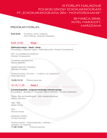III FORUM NAUKOWE POLSKIEJ SZKOŁY ECHOKARDIOGRAFII PT.„ECHOKARDIOGRAFIA 2014- MONITOROWANIE” 29 marca 2014r. hotel marriott, Warszawa program forum: 9.00-9.05 Powitanie, słowo wstępne. Piotr Hoffman, Wojciech Braksator 9.05-10.00 Sesja I Elektrostymulacja – blaski i cienie. Prowadzący: Zbigniew Gąsior, Rafał Dąbrowski, Andrzej Tomaszewski IZW czy dodatkowe struktury? Andrzej Tomaszewski Powikłania mechaniczne. Maciej Sterliński Niedomykalność trójdzielna. Mirosław Kowalski Podsumowanie: Czy echo - w trakcie i po implantacji? Rafał Dąbrowski 10.00-10.15 10.15-11.45 Przerwa kawowa Sesja II Echokardiografista- przyjaciel kardiologa interwencyjnego. Prowadzący: Jarosław D. Kasprzak, Marcin Demkow, Wojciech Braksator Wstęp: Bez echokardiografii - tylko rewaskularyzacja. Marcin Demkow ASD, VSD Marek Konka TAVI Danuta Sorysz Zastawka mitralna Tomasz Kukulski Podsumowanie - dwaj przyjaciele z cathlabu…… Jarosław. D. Kasprzak 11.45-12.00 Przerwa kawowa 12.00-13.15 Sesja III Echokardiografista – przyjaciel kardiochirurga. Prowadzący: Jacek Różański, Tomasz Kukulski, Kazimierz Widenka Wstęp: Bez echokardiografii - tylko rewaskularyzacja. Mariusz Kuśmierczyk Przed-, śród- i pooperacyjne badanie niedomykalności mitralnej. Janusz Bąk Przed-, śród- i pooperacyjne badanie niedomykalności zastawki aortalnej. Katarzyna Mizia–Stec Echo - po każdej operacji serca? Kazimierz Widenka Podsumowanie - obrazowanie na sali operacyjnej – tylko echo? Jacek Różański 13.15-14.00 Lunch 14.00-15.30 Sesja IV Grant edukacyjny firmy Servier Echo – monitorowanie różnych stanów klinicznych – kiedy wskazane? Prowadzenie: Katarzyna Mizia-Stec, Anna Klisiewicz, Jarosław Drożdż Niewydolność serca. Wojciech Kosmala Bezobjawowa wada zastawkowa. Piotr Lipiec Poszerzenie aorty wstępującej. Andrzej Gackowski Nowe metody obrazowania (CMR,CT). Ilona Michałowska, Mateusz Śpiewak 15.30-15.45 Przerwa kawowa 15.45-16.45 Sesja V Grant edukacyjny firmy Actelion Echo – monitorowanie terapii farmakologicznej – czy potrzebne? Prowadzący: Andrzej Szyszka, Piotr Pruszczyk, Piotr Hoffman Wada wrodzona i tętnicze nadciśnienie płucne. Beata Kuśmierczyk Tętnicze nadciśnienie płucne z innych przyczyn. Anna Fijałkowska Stabilna choroba wieńcowa. Zbigniew Gąsior Nadciśnienie tętnicze. Anna Klisiewicz 17.00 Podsumowanie, zakończenie Piotr Hoffman, Wojciech Braksator