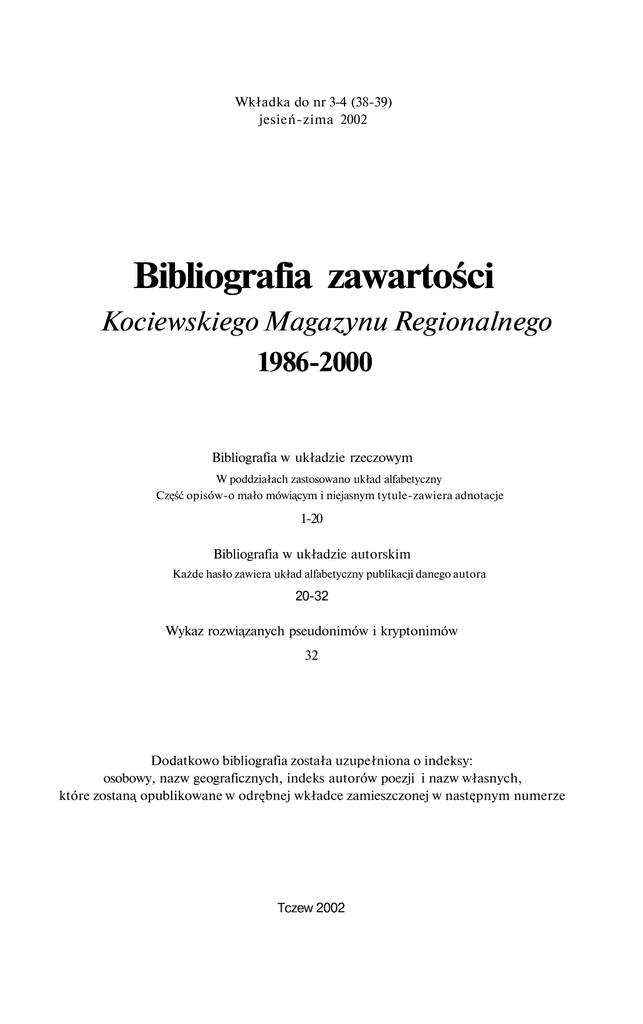 Wkładka do nr 3-4 (38-39) jesień-zima 2002 Bibliografia zawartości Kociewskiego Magazynu Regionalnego 1986-2000 Bibliografia w układzie rzeczowym W poddziałach zastosowano układ alfabetyczny Część opisów-o mało mówiącym i niejasnym tytule-zawiera adnotacje 1-20 Bibliografia w układzie autorskim Każde hasło zawiera układ alfabetyczny publikacji danego autora 20-32 Wykaz rozwiązanych pseudonimów i kryptonimów 32 Dodatkowo bibliografia została uzupełniona o indeksy: osobowy, nazw geograficznych, indeks autorów poezji i nazw własnych, które zostaną opublikowane w odrębnej wkładce zamieszczonej w następnym numerze Tczew 2002 Układ rzeczowy opracowała Katarzyna Waldecker (uzupełnienie 2000 r. Roman Landowski) 1. HISTORIA 1.1. Dział ogólny 1. 23 lutego - 1987, nr 3, s. Utrwalone w wojsk gen. Jana 1807 roku w literaturze / Roman Landowski. 52-55 literaturze wydarzenia z kampanii pomorskiej Henryka Dąbrowskiego. 2. 65 pułk piechoty starogardzki / Lektury naszych przod ków. - 1990, nr 8, s. 16-19 Przedruk z „Księgi pamiątkowej dziesięciolecia Pomorza", wy danej w 1930 roku w Toruniu. 3. Cierpki smak wyzwolenia. W matni dwóch terrorów / Ro man Landowski. - 2000, nr 4 (31), s. 6-8 Dotyczy bolesnej sprawy wywożenia Pomorzan w 1945 roku na Wschód. 4. Czy i o ile jest uzasadniony pewien partykularyzm pomor ski? / Lektury naszych przodków. - 1998, nr 3-4 (22-23), s. 17. Tekst ten pochodzi z 1934 roku, byl zamieszczony w „Dzien niku Starogardzkim". 5. Dlaczego ks. płk Józef Wrycza zerwał współpracę z Tajną Organizacją Wojskową „Gryf Pomorski" / Józef Weltrowski. - 1995, nr 1-2 (11-12), s. 13-14 6. Dzieje pomorskiego patrioty / Grażyna Krużycka-Giełdon. - 1 9 9 7 , nr 1 (16), s. 47 Dzieje „jednego z najwybitniejszych konspiratorów północ nego Pomorza" Jana Szalewskiego. 7. Enklawa Borzechowska / Jerzy Krzyś. - 1991, nr 9, s. 46-49 280-letnia przynależność rejonu zblewsko-borzechowskiego do krzyżackiej komturii w Grudziądzu. 8. Generał wielkiej nadziei / Katarzyna Hellwig, Barbara Krefft, Joanna Rolbiecka. - 1987, nr 3, s. 56 Artykuł napisany przez uczennice Liceum Medycznego w Tcze wie dotyczy sylwetki Jana Henryka Dąbrowskiego. 9. Gryf i orzeł / Andrzej S. Fleming. - 1998, nr 3-4 (22-23), s. 15 Autor odpowiada na pytanie dlaczego gryf i orzeł dominują w heraldyce pomorskiej. 10. Inwentarz zespołu akt TOW „Gryf Pomorski" 1941-1942 / Marcin Westphal. - 2000, nr 2 (29), s. 3-7 Dotyczy dokumentów odnalezionych w 1999 roku w Czarnej Wodzie przez Józefa Weltrowskiego. 11. Inwentarz zespołu akt TOW „Gryf Pomorski" 1941-1942 (dokończenie) / Marcin Westphal. - 2000, nr 3 (30), s. 29-31 Dalszy ciąg tekstu z nr 2. 12. Gwiazdka.... - 1999, nr 3-4 (26-27), s. 70 Jest to wstępny felieton zamieszczony w „Pielgrzymie" w 1910 roku, drukowany z okazji Bożego Narodzenia, zawiera sporo tre ści społeczno-politycznych tamtych lat. 13. Jakub Fankidejski: historyk regionalny / Kazimierz Ickiewicz. Konterfekty. - 1990, nr 8, s. 56-57 Ksiądz Jakub Fankidejski należał do czołowych przedstawicieli polskiego piśmiennictwa naukowego na Pomorzu. 14. Józef Bogdan Jacobson: tytan ducha i pracy / Józef Mi lewski. Konterfekty. - 1990, nr 8, s. 54-57 Wybitny działacz niepodległościowy na Pomorzu z lat 19181920. 15. Józef Wybicki i jego piśmiennictwo w oczach językoznawcy / Edward Breza. - 1991, nr 9, s. 8-13 2 16. Konopacki / Jan A. Kamiński. Konterfekty. - 1988, nr 5, s. 45-46 Historia rodu pomorskiego znanego od 1489 roku. 17. „Wiadomości potoczne" dawnego „Pielgrzyma" z 1910 roku. - 2000, nr 1 (28), s. 47 18. Loże farmazonów / Józef Milewski. - 1995, nr 1-2 (11-12), s. 29-32 Historia masonerii na Pomorzu i Kociewiu. 19. Marsz, marsz Dąbrowski / Czesław Skonka. - 1987, nr 2, s. 12-16 Dzieje kampanii napoleońskiej z 1812 roku i wyzwolenia ziemi pomorskiej przez wojska polskie dowodzone przez gen. Jana Henryka Dąbrowskiego. 20. Monarchowie w Pelplinie / Zdzisław Mrozek. - 1999, nr 3-4 (26-27), s. 14-15 21. Morze huczy i las...: wiersz o Janie III Sobieskim w Rzucewie / Tadeusz Linkner. - 1998, nr 2 (21), s. 19-22 22. Naprawianie etosu. - 2000, nr 3 (30), s. 32 Krytyczny głos o działalności tzw. Zespołu do Spraw Upamięt niania Etosu TOW „Gryf Pomorski". 23. O 30 stycznia i generale Hallerze / Czesław Knopp. - 1999, nr 2 (25), s. 53-54 Tekst na podst. książki gen. J. Hallera „Wspomnienia", wyda nej staraniem syna generała w oficynie „Veritas" w Londynie. 24. O generale Józefie Hallerze / Jan Ejankowski. - 2000, nr 1 (28), s. 22-23 25. O jedność Pomorza: ruch regionalny w Gdańsku i na Pomorzu. Problemy i perspektywy w nowych warunkach ustro jowych / Alicja Słyszewska. - 1999, nr 3-4 (26-27), s. 6-7 26. O pielgrzymce generała raz jeszcze / Czesław Knopp. - 1998, nr 3-4 (22-23), s. 64-66 Artykuł dotyczy pielgrzymki gen. Hallera do Ziemi Świętej i Lo reto. 27. Ostatni dowódca / Ryszard Szwoch - 1989, nr 7, s. 38-40. Dzieje dowódcy 2 Pułku Szwoleżerów Rokitniańskich - Tade usza Lękawskiego z 1939 roku. 28. Pamiętnik generała / Jan Weyssenhoff. - Lektury naszych przodków. - 1987, nr 2, s. 17-18 Fragment tekstu na podst. wydania Gebethnera i Wolffa z 1904 roku, strona 67-72. Dotyczy przebiegu walk wyzwoleńczych legio nów gen. Henryka Dąbrowskiego w 1807 roku na Kociewiu. 29. Pamiętnik starego żołnierza / Antoni Białkowski. - Lektury Naszych Przodków - 1987, nr 2, s. 19-21 Fragment tekstu na podstawie wydania Gebethnera i Wolffa z 1903 roku, strona 23-32. Opowiada o rabunku mającym uka rać miasto Tczew. 30. Piotr z Nowego / Marek Śliwa. - Konterfekty. - 1995, nr 1-2 (11-12), s. 25-28 Piotr z Nowego to najstarszy syn komesa Świecy (Świętosława), wojewody gdańskiego po 1286 roku. Rodzina Święców należała wówczas do jednej z najbardziej wpływowych na Po morzu. 31. Plon kraziewiczowskiej myśli / Józef Milewski. - 1988, nr 5, s. 18-23 Z działalności Kółek Rolniczych i n