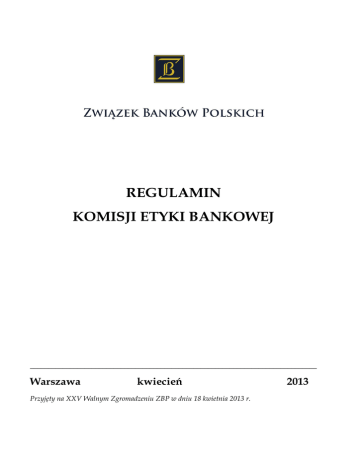 REGULAMIN KOMISJI ETYKI BANKOWEJ _______________________________________________________________________________ Warszawa kwiecień Przyjęty na XXV Walnym Zgromadzeniu ZBP w dniu 18 kwietnia 2013 r. 2013 1. Komisja Etyki Bankowej, zwana dalej „Komisją”, działa przy Związku Banków Polskich i powołana jest do promowania standardów etycznych, jak również do oceny przestrzegania przez banki i ich pracowników oraz przez osoby, za których pośrednictwem banki wykonują czynności bankowe zasad określonych w Kodeksie Etyki Bankowej. Komisja realizuje swoje cele poprzez: • projektowanie i aktualizację najwyższych standardów etycznych w relacjach banków i ich pracowników z Klientami oraz innymi grupami interesariuszy, • promowanie i wyjaśnianie zasad etyki w środowisku bankowym, • ocenę przestrzegania zasad „Kodeksu Etyki Bankowej”. 2. Członkowie Komisji powoływani są przez Walne Zgromadzenie Związku Banków Polskich, spośród osób cieszących się poważaniem i autorytetem w środowisku bankowym. 3. Komisja składa się z 20 – 45 Członków, powoływanych w tajnym głosowaniu przez Walne Zgromadzenie Związków Banków Polskich na wspólną 3-letnią kadencję. 4. W przypadku zmniejszenia się w toku kadencji liczby Członków Komisji poniżej 20, najbliższe Walne Zgromadzenie Związku Banków Polskich dokona uzupełnienia składu Komisji, z zachowaniem trybu określonego w pkt. 5 i 6. 5. Każdy bank – Członek Związku Banków Polskich i Zarząd Związku Banków Polskich mogą zgłosić dowolną liczbę kandydatów na Członka Komisji z uwzględnieniem postanowień pkt. 2 i po uprzednim uzyskaniu pisemnej zgody osoby kandydującej. Wzór zgody stanowi Załącznik nr 1 do Regulaminu. 6. Zgłoszenie, o którym mowa w pkt. 5 może być dokonane przez bank pisemnie do biura Związków Banków Polskich, nie później niż na dwa tygodnie przed terminem Walnego Zgromadzenia Związku Banków Polskich. Wzór pisemnego zgłoszenia kandydata stanowi Załącznik nr 2 do Regulaminu. 7. Każdy Członek Komisji może być powołany na kolejną kadencję. 8. Komisja na prośbę banku zgłaszającego kandydata, na koniec kadencji przekazuje do w/w banku informację o jego aktywności w pracach Komisji Etyki Bankowej. 9. Organami Komisji Etyki Bankowej są: a. Plenarne Posiedzenie Komisji Etyki Bankowej, b. Prezydium Komisji Etyki Bankowej, c. Przewodniczący Komisji Etyki Bankowej. 10. W Plenarnym Posiedzeniu mogą uczestniczyć Członkowie Komisji oraz zaproszeni goście. Plenarne Posiedzenia zwołuje Przewodniczący, za pośrednictwem Sekretariatu, powiadamiając o miejscu, czasie i porządku obrad. 11. Członkowie Komisji wybierają ze swego grona Prezydium, które tworzą Przewodniczący oraz 2 do 4 Zastępców. 12. Prezydium kieruje jej działalnością i reprezentuje Komisję wobec osób trzecich. Prezydium zbiera się w miarę potrzeb. 13. Kompetencje Prezydium obejmują: a. realizację celów Komisji, 2 b. powoływanie Zespołów odpowiedzialnych za realizację działań Komisji, c. przyjmowanie i rekomendowanie Komisji projektów ocen o charakterze ogólnym przygotowanych przez wyznaczony Zespół. 14. Kompetencje Przewodniczącego Komisji obejmują: a. kierowanie pracami Komisji i Prezydium, b. prowadzenie korespondencji z bankami i innymi instytucjami w sprawach z zakresu zadań Komisji, c. zwoływanie posiedzeń Prezydium oraz Komisji, d. nadzór nad pracą Sekretariatu Komisji. 15. Przy Prezydium Komisji działa Sekretariat kierowany przez Sekretarza Komisji. Funkcję Sekretarza Komisji pełni osoba delegowana przez Zarząd Związku Banków Polskich. 16. Do zakresu działania Sekretariatu Komisji należy świadczenie pomocy organizacyjnej i kancelaryjnej przy wykonywaniu zadań Komisji, a w szczególności: a. przygotowywanie posiedzeń Komisji i Prezydium, b. obsługa organizacyjna i protokolarna posiedzeń Komisji i Prezydium, c. przygotowanie korespondencji wpływającej do Komisji i przedstawianie jej na posiedzeniach Prezydium, d. przygotowywanie i wysyłanie korespondencji, e. inne czynności przewidziane w Regulaminie. 17. Do zadań Sekretarza Komisji w szczególności należy: a. organizacja prac Sekretariatu, b. stała współpraca z Przewodniczącym, Prezydium i Zespołami KEB, c. zapewnienie stałej łączności i współpracy Komisji ze Związkiem Banków Polskich, d. podpisywanie, w uzgodnieniu z Przewodniczącym Komisji, pism o charakterze technicznym. 18. Bank zgłaszający kandydata, po powołaniu go przez Walne Zgromadzenie Związku Banków Polskich na Członka Komisji: a. umożliwia udział w pracach Komisji i jej Zespołach, b. pokrywa koszty delegacji związanych z pracą w Komisji, a w przypadku zmiany miejsca pracy, w trakcie kadencji, pokrywa te koszty do najbliższego Walnego Zgromadzenia Związku Banków Polskich, chyba że nowy pracodawca przejmie na siebie ponoszenie tych kosztów. 19. Komisja nie wydaje ocen w zakresie: a. spraw i wniosków dotyczących interpretacji prawnej umów i regulacji wewnętrznych banków, b. indywidualnych skarg i wniosków Klientów banków. 20. Komisja kieruje indywidualne skargi i wnioski Klientów do zainteresowanego Banku z ewentualnym wskazaniem naruszenia zasad zawartych w Kodeksie Etyki Bankowej. Komisja informuje Klienta o tym, iż otrzymała pismo, a zawarte w nim uwagi wykorzysta w swojej pracy na rzecz umacniania dobrych praktyk bankowych. Ponadto, informacja o skierowanym 3 do banku piśmie zostaje przesłana do Klienta. Jeżeli w ocenie Komisji sprawa poruszona w wystąpieniu Klienta będzie się kwalifikowała do rozstrzygnięcia przez Arbitra Bankowego, wskaże Klientowi odpowiedni tryb postępowania. 21. Komisja wydaje oceny o charakterze ogólnym na tle analizy zdarzeń występujących na rynku finansowym, które w opinii Komisji mają istotny wpływ na kształtowanie publicznego wizerunku sektora bankowego, a także na podstawie problemów zgłaszanych w indywidualnych skargach i 