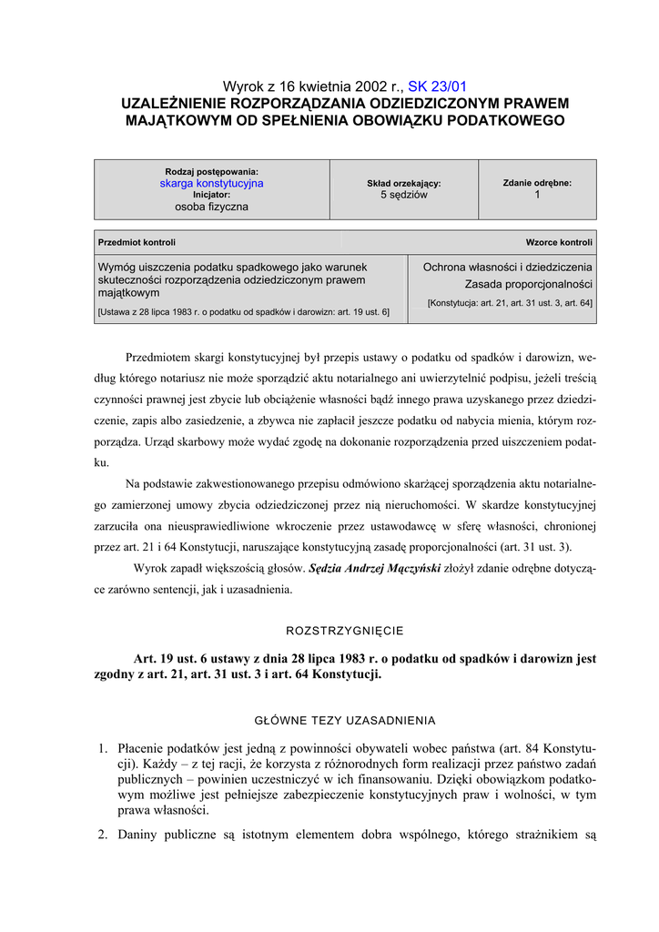 Wyrok z 16 kwietnia 2002 r., SK 23/01 UZALEŻNIENIE ROZPORZĄDZANIA ODZIEDZICZONYM PRAWEM MAJĄTKOWYM OD SPEŁNIENIA OBOWIĄZKU PODATKOWEGO Rodzaj postępowania: skarga konstytucyjna Skład orzekający: 5 sędziów Inicjator: osoba fizyczna Przedmiot kontroli Zdanie odrębne: 1 Wzorce kontroli Wymóg uiszczenia podatku spadkowego jako warunek skuteczności rozporządzenia odziedziczonym prawem majątkowym [Ustawa z 28 lipca 1983 r. o podatku od spadków i darowizn: art. 19 ust. 6] Ochrona własności i dziedziczenia Zasada proporcjonalności [Konstytucja: art. 21, art. 31 ust. 3, art. 64] Przedmiotem skargi konstytucyjnej był przepis ustawy o podatku od spadków i darowizn, według którego notariusz nie może sporządzić aktu notarialnego ani uwierzytelnić podpisu, jeżeli treścią czynności prawnej jest zbycie lub obciążenie własności bądź innego prawa uzyskanego przez dziedziczenie, zapis albo zasiedzenie, a zbywca nie zapłacił jeszcze podatku od nabycia mienia, którym rozporządza. Urząd skarbowy może wydać zgodę na dokonanie rozporządzenia przed uiszczeniem podatku. Na podstawie zakwestionowanego przepisu odmówiono skarżącej sporządzenia aktu notarialnego zamierzonej umowy zbycia odziedziczonej przez nią nieruchomości. W skardze konstytucyjnej zarzuciła ona nieusprawiedliwione wkroczenie przez ustawodawcę w sferę własności, chronionej przez art. 21 i 64 Konstytucji, naruszające konstytucyjną zasadę proporcjonalności (art. 31 ust. 3). Wyrok zapadł większością głosów. Sędzia Andrzej Mączyński złożył zdanie odrębne dotyczące zarówno sentencji, jak i uzasadnienia. ROZSTRZYGNIĘCIE Art. 19 ust. 6 ustawy z dnia 28 lipca 1983 r. o podatku od spadków i darowizn jest zgodny z art. 21, art. 31 ust. 3 i art. 64 Konstytucji. GŁÓWNE TEZY UZASADNIENIA 1. Płacenie podatków jest jedną z powinności obywateli wobec państwa (art. 84 Konstytucji). Każdy – z tej racji, że korzysta z różnorodnych form realizacji przez państwo zadań publicznych – powinien uczestniczyć w ich finansowaniu. Dzięki obowiązkom podatkowym możliwe jest pełniejsze zabezpieczenie konstytucyjnych praw i wolności, w tym prawa własności. 2. Daniny publiczne są istotnym elementem dobra wspólnego, którego strażnikiem są 2 przede wszystkim właściwe organy państwa. Potrzeba realizacji zadań publicznych może prowadzić do ograniczeń w dysponowaniu składnikami majątku podatnika. 3. Ingerowanie w sferę prawa własności i innych praw majątkowych podatników należy do zasadniczej treści instytucji podatku. Przez swoją powszechność podatki stanowią niemal naturalną formę obciążania praw majątkowych konkretnymi zobowiązaniami i są swoistym dopełnieniem tych praw. 4. Treść normatywna pojęcia własności w art. 21 i 64 Konstytucji zawiera w sobie obowiązki, które wynikają z konieczności ponoszenia ciężarów publicznych. 5. Wyrażona w art. 31 ust. 3 Konstytucji zasada proporcjonalności z jednej strony stawia przed prawodawcą każdorazowo wymóg stwierdzenia rzeczywistej potrzeby ingerencji w danym stanie faktycznym w zakres prawa bądź wolności jednostki, z drugiej strony wymaga stosowania takich środków prawnych, które będą skuteczne, a więc będą rzeczywiście służyć realizacji zamierzonych przez prawodawcę celów. Zawsze chodzi tu o środki niezbędne w tym sensie, że służą one realizacji określonych wartości w sposób i w stopniu, który nie mógłby być osiągnięty przy zastosowaniu innych środków, a zarazem środki jak najmniej uciążliwe dla podmiotów, których prawa lub wolności podlegają ograniczeniu. Ingerencja w sferę statusu jednostki musi więc pozostawać w racjonalnej i odpowiedniej proporcji do celów, których ochrona uzasadnia dokonane ograniczenie. 6. Określone w art. 31 ust. 3 Konstytucji cele publiczne, ze względu na które dopuszczalne jest ograniczenie konstytucyjnych praw i wolności, mieszczą się w zakresie treściowym pojęcia „interes publiczny”. Wszystkie one należą do zadań władzy publicznej. Dla realizacji tych zadań konieczne jest zapewnienie w budżecie państwa odpowiednich środków finansowych, pochodzących w pierwszej kolejności z danin publicznych. Znajdują one także umocowanie w art. 1 Konstytucji. 7. Odrębne unormowanie w Konstytucji problematyki ograniczania własności, poprzez wskazanie w art. 64 ust. 3 przesłanek dopuszczających tego rodzaju działania, nie oznacza wyłączenia stosowania w odniesieniu do własności generalnej zasady wyrażonej w art. 31 ust. 3. Unormowanie art. 64 ust. 3 ogranicza się wyłącznie do wskazania przesłanki formalnej (wymóg ustawy) oraz zakreślenia maksymalnej granicy ingerencji (zakaz naruszania istoty prawa własności). Przepis art. 64 ust. 3 nie jest natomiast unormowaniem szczególnym w stosunku do art. 31 ust. 3 w takim sensie, iżby pozwalał na nieuwzględnianie ograniczeń wskazanych w tymże artykule przy określaniu przesłanek ingerencji ustawodawcy w prawo własności. 8. Określonych przez ustawodawcę wymogów formalnych służących zabezpieczeniu obrotu prawnego (np. wymogu zachowania formy aktu notarialnego przy rozporządzaniu prawem własności nieruchomości) nie można uznać za niekonstytucyjne tylko dlatego, że ograniczają swobodę właściciela w rozporządzaniu swoim prawem (ius disponendi). 9. Zaskarżony art. 19 ust. 6 ustawy z dnia 28 lipca 1983 r. o podatku od spadków i darowizn nie zawiera zakazu zbywania ani obciążania rzeczy lub praw majątkowych, a jedynie określa formalne przesłanki możliwości dokonania czynności cywilnoprawnej w przewidzianej przez prawo formie: ustanawia wymóg przedstawienia notariuszowi dokonującemu czynności notarialnej dokumentu stwierdzającego, że właściciel spełnił obowiązek podatkowy albo, że jego spełnienie zostało należycie zabezpieczone. Zapłata podatku nie jest przy tym jedynym środkiem umożliwiającym zbycie majątku 