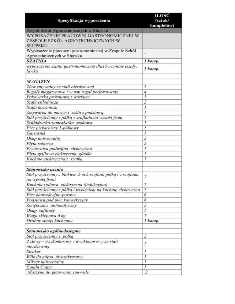 ILOŚĆ (sztuk/ kompletów) Specyfikacja wyposażenia Zespół Szkół Agrotechnicznych w Słupsku WYPOSAŻENIE PRACOWNI GASTRONOMICZNEJ W ZESPOLE SZKÓŁ AGROTECHNICZNYCH W SŁUPSKU Wyposażenie pracowni gastronomicznej w Zespole Szkół Agrotechnicznych w Słupsku SZATNIA wyposażenie szatni gastronomicznej dla15 uczniów (szafy, ławki) MAGAZYN Zlew zmywalny ze stali nierdzewnej Regały magazynowe ( w tym regał perforowany) Pakowarka próżniowa z wózkiem Szafa chłodnicza Szafa mroźnicza Zmywarka do naczyń i szkła z podstawą Stół przyścienny z półką z szuflada na wysoki front Schładzarko-zamrażarka szokowa Piec piekarniczy 5-półkowy Garownik Okap uniwersalny Płyta robocza Frytownica podwójna elektryczna Płyta grillowa elektryczna gładka Kuchnia elektryczna z szafką Stanowisko ucznia Stół przyścienny z blokiem 2-óch szuflad, półką i z szuflada na wysoki front Kuchnia stołowa elektryczna (indukcyjna) Stół przyścienny z półką i wycięciem na kuchnię elektryczną Piec konwekcyjno-parowy Podstawa pod piec konwekcyjny Zmiękczacz automatyczny Okap sufitowy Waga sklepowa 6 kg Drobny sprzęt kuchenny Stanowisko ogólnodostępne Stół przyścienny z półką 2 zlewy – trzykomorowy i dwukomorowy ze stali nierdzewnej Steaker Wilk do mięsa dwuzakresowy Mikser uniwersalny Combi Cutter Maszyna do gotowania sou-vide 1 komp. 1 komp. 1 4 1 2 1 1 2 1 1 1 2 2 1 1 1 7 7 7 6 6 2 7 7 1 komp. 2 2 1 1 1 1 2