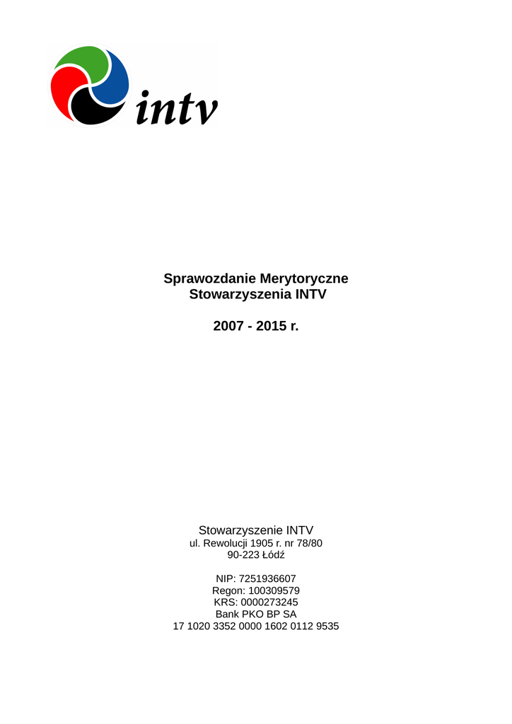 Sprawozdanie Merytoryczne Stowarzyszenia INTV 2007 - 2015 r. Stowarzyszenie INTV ul. Rewolucji 1905 r. nr 78/80 90-223 Łódź NIP: 7251936607 Regon: 100309579 KRS: 0000273245 Bank PKO BP SA 17 1020 3352 0000 1602 0112 9535 TELEWIZJA INTV Stowarzyszenie INTV jest nadawcą programu INTV na podstawie wpisu do rejestru nadawców P-0320/14 KRRiT. Telewizja INTV udostępnia program przez Internet na stronach www.intv.pl Od 2007 r. zrealizowano 151 transmisji i rejestracji TV: z koncertów w Klubie INTV, z wernisaży wystaw plastycznych w Klubie INTV, z koncertów, teatrów, festiwali i targów innych producentów, wywiadów. Fragmenty nagrań są dostępne w kanałach tematycznych: Teatr Muzyka Konie Architektura Art. & Design Literatura Stowarzyszenie prowadzi archiwum dziedzictwa kulturowego udostępniane na stronie www.art.intv.pl Stowarzyszenie posiada: Studio do nagrań Samochód do transmisji TV przez łącze satelitarne Pracownię do montażu filmów Serwery do transmisji TV WYSTAWY PLASTYCZNE W KLUBIE INTV . 1. Wystawa obrazów Włodzisława Siera (Aachen) 11.11.2006 r. 2. Wystawa obrazów Bogdana Kudelskiego (Łódź) 14.04.2007 r. 3. Wystawa pasteli Quo pasa Łukasza Wrońskiego (Meksyk) 26.07.2007 r. 4. Wystawa obrazów Jadwigi Kaczmarek i Andrzeja Kaczmarka (Łódź) 30.09.2007 r. . 5. Wystawa obrazów Sentimentale Anny Marii Poleskiej (Paryż) 16.12.2007 r. 6. Wystawa obrazów Pejzaże włoskie i polskie Józefa Ludwikiewicza (Łódź) 07.03.2008 r. 7. Wystawa Primo Levi w obrazach Renzo Galeottiego (Londyn) 06.09.2008 r. 8. Wystawa Sentimentale 2009 Anny Marii Poleskiej (Paryż) 29.05.2009 r. 9. Wystawa obrazów Les Mysteres Jolanty Graczykowskiej (Paryż) 03.06.2011 r. 10. Wystawa obrazów Marii Hajn (Łódź) 06.09.2013 r. 11. Wystawa obrazów Polska grupa Współczesna (Łódź) 22.11.2013 r. Wystawa grupowa: Andrzej Bartczak, Jan Trojan Andrzej Graczykowski Jacek Nowotarski Anna Maria Poleska Jolanta Graczykowska Małgorzata Wyszogrodzka Muzeum Książki w Łodzi KONCERTY W KLUBIE INTV 1. Koncert zespołów Akademii Muzycznej w Łodzi Rafał Hołub – fortepian Robert Stefański – klarnet Barbara Zdiarska – pierwsze skrzypce Katarzyna Kondziołka – drugie skrzypce Katarzyna Piasecka – altówka Karolina Adamowicz – wiolonczela Aleksandra Łysiał - fortepian 2. Koncert zespołu SAMOKHIN BAND 11.11.2006 r. 18.02.2007 r. Pavel Samokhin - trąbka, wokal Michał Nowak - kontrabas, wokal Wojtek Stępnik - instrumenty klawiszowe, wokal Paweł Stępień - perkusja Gościnnie - Lech Dyblik 3. Koncert fortepianowy Teresy Czekaj (Paryż) 07.09.2007 r. 4. Recital Anny Cymerman (Łódź) 05.10.2007 r. 5. Koncert zespołu Samokhin Band (Łódź) 31.12.2007 r. Pavel Samokhin - trąbka, wokal Michał Nowak - kontrabas, wokal Wojtek Stępnik - instrumenty klawiszowe, wokal Paweł Stępień - perkusja Armen Karapetian – perkusja, wokal 6. Recital Edwarda Hulewicza (Warszawa) 03.01.2008 r. 7. Koncert piosenki poetyckiej Agnieszki Battelli (Łódź) Agnieszka Battelli – śpiew Adam Drzewiecki - instrumenty klawiszowe Wojtek "Guma" Gulis - gitara basowa Grzegorz Sulikowski – instrumenty perkusyjne 8. Dumki, pieśni i romanse kompozytorów ukraińskich XIX i XX wieku (Łódź) 09.05.2008 r. Borys Ławreniw – tenor Mateusz Lasatowicz – fortepian 9. Koncert Ulica Mandelsztama – Sklep z ptasimi piórami (Szczecin) 18.03.2008 r. Ryszard Leoszewski – gitara, śpiew Krzysztof Baranowski – piano, akordeon Robert Jarzębski – gitara elektryczna Lech "Groszek" Grochala – perkusja, instrumenty perkusyjne Szymon Orłowski – gitara basowa Joanna Kraszewska – wiolonczela 06.09.2008 r. 10. Koncert z cyklu Cztery kultury. Borysa Ławreniewa 24.10.2008 r. 11. Koncert Romanse rosyjskie i pieśni wojenne (Kazań) 31.01.2009 r. Julia Ziganszina - śpiew, gitara klasyczna Aleksander Ławrentiew - gitara klasyczna 12. Koncert Trzynastego... Studia Piosenki ProForum (Łódź) pod kierownictwem artystycznym Teresy Stokowskiej-Gajdy. 13.02.2009 r. 13, Koncert Syberyjski bard zaprasza Evgena Malinovskiyego (Warszawa) 18.04.2009 r. 14. Koncert Chopin słowem malowany. (Łódź) 29,05.2009 r. Urszula Kryger – mezzosopran Katarzyna Jankowska – fortepian 15. Koncert Duende w wykonaniu Mateo Gallito (Łódź) 18.09.2009 r. 16. Recital Andrzeja Dyszaka (Łódź) 25.09.2009 r. Przemysław Kowalski - bas Michał Zarych - fortepian Piotr Kolasa - perkusja 17. Koncert Barwy miłości w wykonaniu Emilii Kudry (Łódź) Piotr Kolanowski - fortepian Łukasz Kapuściński - gitara Michał Nowak - gitara basowa Emilian Waluchowski - perkusja Katarzyna Krakowiak, Łukasz Handzel - chórki 09.10.2009 r. 18. Koncert zespołu Mainstreet Quartet (Łódź) : Michał Kobojek – alcista. Marcin Błasiak – basista Emil Waluchowski – perkusista, Witold Janiak – pianista Gościnnie Zbigniew Namysłowski - saksofon 19. Koncert zespołu Orange Note (Łódź) 06.12.2009 r. Małgorzata Hutek - wokal Mateusz Stachura - wokal Adam Ziemiański - puzon Przemysław Kowalski - bas Michał Zarych - klawisze Magdalena Buraczyk - flet Marcin Król - trąbka Jakub Matusiak - saksofon Piotr Kolas - perkusja 20. Koncert Romanse rosyjskie i pieśni wojenne 29.11.2009 r. Julia Ziganszina – śpiew, gitara klasyczna, Aleksander Ławrentiew – gitara klasyczna 30.01.2010 r. 21. Ostatki jazzowe 16.02.2010 r. Krzysztof Raczyński (akordeony) Radosław Bolewski (perkusja) Maciej Latalski (bas) Kuba Raczyński (sax sopran) Andrzej Sajdak (organy Hammonda) 22. Recital Arie z oper Ryszarda Wagnera Tomasza Koniecznego (Dusseldorf) 08.05.2010 r. 23. Recital Nim przyjdzie wiosna Piotra Kuźniaka (Poznań) 21.05.2010 r. 24. Koncert Tango (Argentyna) 04.01.2011 r. Sebastian Posada Eugenia Eberhardt 25. Koncert Ostatki jazzowe w wykonaniu zespołu WALK AWAL (Warszawa) Krzysztof Zawadzki (perkusja) Adam Wendt (saksofony) Zbigniew Jakubek (keyboard) Tomasz Grabowy (gitara basowa) Bernard Maseli (wibrafon) 26. Koncert Ale Jazz! (USA)
