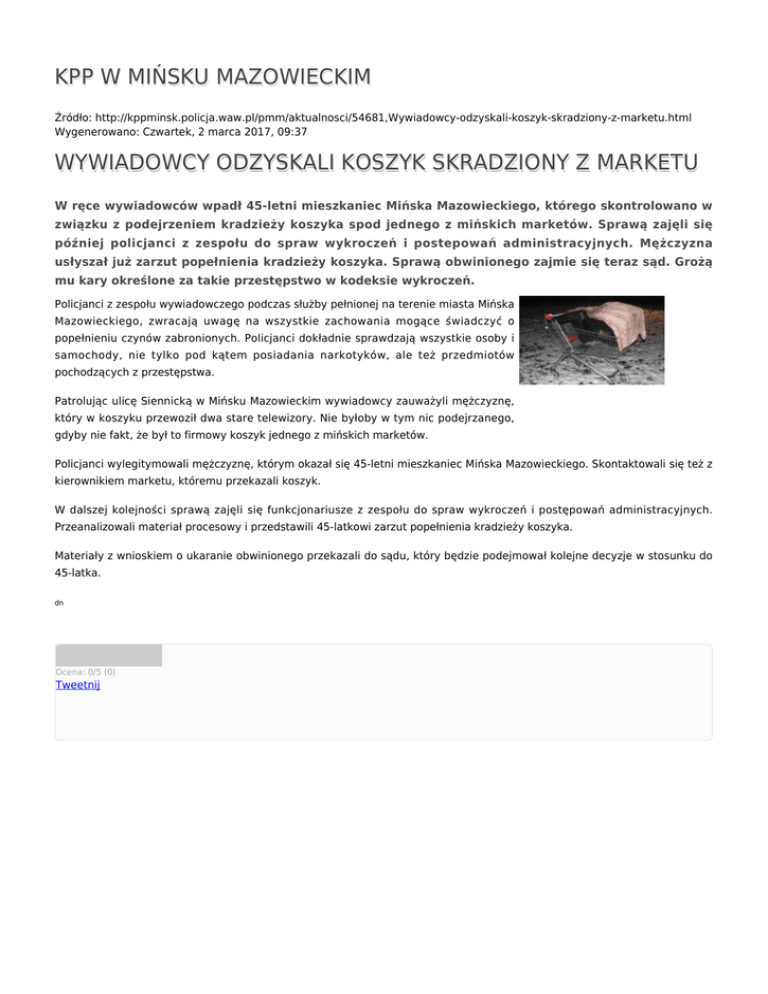 KPP W MIŃSKU MAZOWIECKIM Źródło: http://kppminsk.policja.waw.pl/pmm/aktualnosci/54681,Wywiadowcy-odzyskali-koszyk-skradziony-z-marketu.html Wygenerowano: Czwartek, 2 marca 2017, 09:37 WYWIADOWCY ODZYSKALI KOSZYK SKRADZIONY Z MARKETU W ręce wywiadowców wpadł 45-letni mieszkaniec Mińska Mazowieckiego, którego skontrolowano w związku z podejrzeniem kradzieży koszyka spod jednego z mińskich marketów. Sprawą zajęli się później policjanci z zespołu do spraw wykroczeń i postepowań administracyjnych. Mężczyzna usłyszał już zarzut popełnienia kradzieży koszyka. Sprawą obwinionego zajmie się teraz sąd. Grożą mu kary określone za takie przestępstwo w kodeksie wykroczeń. Policjanci z zespołu wywiadowczego podczas służby pełnionej na terenie miasta Mińska Mazowieckiego, zwracają uwagę na wszystkie zachowania mogące świadczyć o popełnieniu czynów zabronionych. Policjanci dokładnie sprawdzają wszystkie osoby i samochody, nie tylko pod kątem posiadania narkotyków, ale też przedmiotów pochodzących z przestępstwa. Patrolując ulicę Siennicką w Mińsku Mazowieckim wywiadowcy zauważyli mężczyznę, który w koszyku przewoził dwa stare telewizory. Nie byłoby w tym nic podejrzanego, gdyby nie fakt, że był to firmowy koszyk jednego z mińskich marketów. Policjanci wylegitymowali mężczyznę, którym okazał się 45-letni mieszkaniec Mińska Mazowieckiego. Skontaktowali się też z kierownikiem marketu, któremu przekazali koszyk. W dalszej kolejności sprawą zajęli się funkcjonariusze z zespołu do spraw wykroczeń i postępowań administracyjnych. Przeanalizowali materiał procesowy i przedstawili 45-latkowi zarzut popełnienia kradzieży koszyka. Materiały z wnioskiem o ukaranie obwinionego przekazali do sądu, który będzie podejmował kolejne decyzje w stosunku do 45-latka. dn Ocena: 0/5 (0) Tweetnij