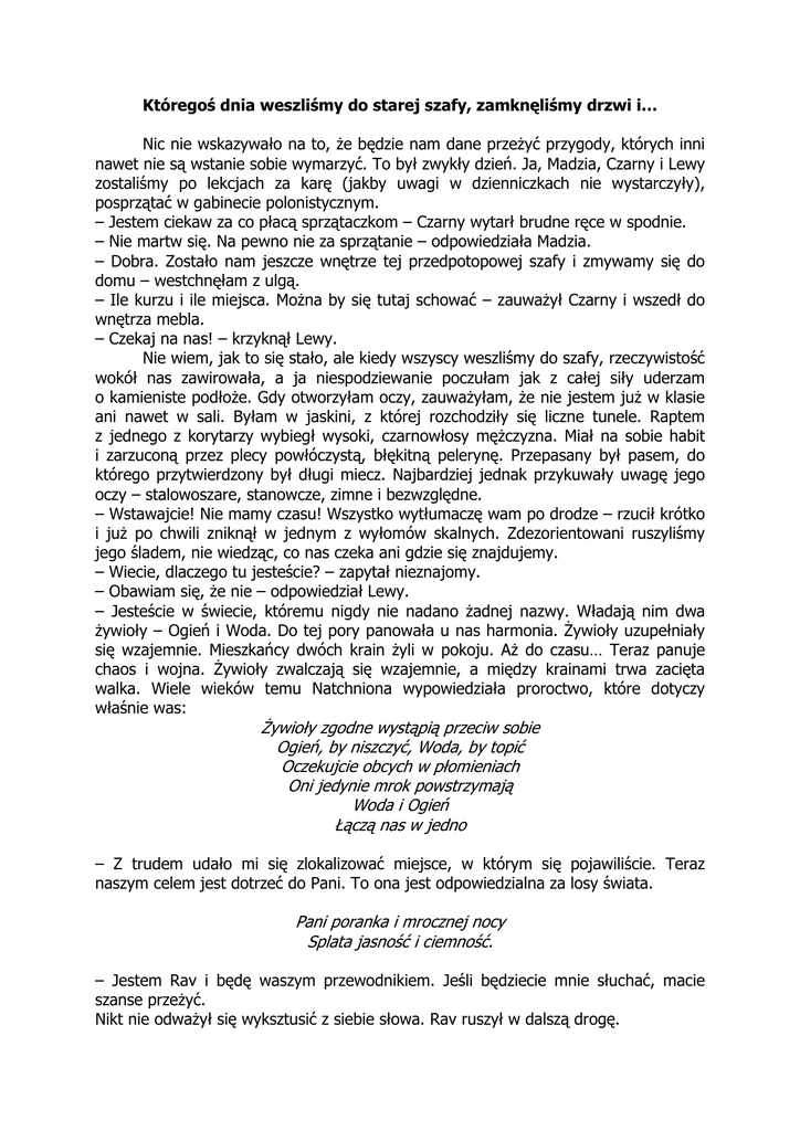 Któregoś dnia weszliśmy do starej szafy, zamknęliśmy drzwi i… Nic nie wskazywało na to, że będzie nam dane przeżyć przygody, których inni nawet nie są wstanie sobie wymarzyć. To był zwykły dzień. Ja, Madzia, Czarny i Lewy zostaliśmy po lekcjach za karę (jakby uwagi w dzienniczkach nie wystarczyły), posprzątać w gabinecie polonistycznym. – Jestem ciekaw za co płacą sprzątaczkom – Czarny wytarł brudne ręce w spodnie. – Nie martw się. Na pewno nie za sprzątanie – odpowiedziała Madzia. – Dobra. Zostało nam jeszcze wnętrze tej przedpotopowej szafy i zmywamy się do domu – westchnęłam z ulgą. – Ile kurzu i ile miejsca. Można by się tutaj schować – zauważył Czarny i wszedł do wnętrza mebla. – Czekaj na nas! – krzyknął Lewy. Nie wiem, jak to się stało, ale kiedy wszyscy weszliśmy do szafy, rzeczywistość wokół nas zawirowała, a ja niespodziewanie poczułam jak z całej siły uderzam o kamieniste podłoże. Gdy otworzyłam oczy, zauważyłam, że nie jestem już w klasie ani nawet w sali. Byłam w jaskini, z której rozchodziły się liczne tunele. Raptem z jednego z korytarzy wybiegł wysoki, czarnowłosy mężczyzna. Miał na sobie habit i zarzuconą przez plecy powłóczystą, błękitną pelerynę. Przepasany był pasem, do którego przytwierdzony był długi miecz. Najbardziej jednak przykuwały uwagę jego oczy – stalowoszare, stanowcze, zimne i bezwzględne. – Wstawajcie! Nie mamy czasu! Wszystko wytłumaczę wam po drodze – rzucił krótko i już po chwili zniknął w jednym z wyłomów skalnych. Zdezorientowani ruszyliśmy jego śladem, nie wiedząc, co nas czeka ani gdzie się znajdujemy. – Wiecie, dlaczego tu jesteście? – zapytał nieznajomy. – Obawiam się, że nie – odpowiedział Lewy. – Jesteście w świecie, któremu nigdy nie nadano żadnej nazwy. Władają nim dwa żywioły – Ogień i Woda. Do tej pory panowała u nas harmonia. Żywioły uzupełniały się wzajemnie. Mieszkańcy dwóch krain żyli w pokoju. Aż do czasu… Teraz panuje chaos i wojna. Żywioły zwalczają się wzajemnie, a między krainami trwa zacięta walka. Wiele wieków temu Natchniona wypowiedziała proroctwo, które dotyczy właśnie was: Żywioły zgodne wystąpią przeciw sobie Ogień, by niszczyć, Woda, by topić Oczekujcie obcych w płomieniach Oni jedynie mrok powstrzymają Woda i Ogień Łączą nas w jedno – Z trudem udało mi się zlokalizować miejsce, w którym się pojawiliście. Teraz naszym celem jest dotrzeć do Pani. To ona jest odpowiedzialna za losy świata. Pani poranka i mrocznej nocy Splata jasność i ciemność. – Jestem Rav i będę waszym przewodnikiem. Jeśli będziecie mnie słuchać, macie szanse przeżyć. Nikt nie odważył się wyksztusić z siebie słowa. Rav ruszył w dalszą drogę. W końcu tunel gwałtownie skręcił w prawo, a naszym oczom ukazała się szeroka, pomarańczowo-czerwona, ognista rzeka lawy, z której bił niemożliwy do zniesienia żar. Staliśmy na skalnej platformie z niedużym pomostem, do którego przymocowano łódkę z dziwnej, stalowej skały. Wpadłam niemal w panikę, gdy dostrzegłam, że Rav jak gdyby nigdy nic wchodzi do łodzi i gestem każe nam zrobić nam to samo. Spojrzałam na Madzię, Lewego i Czarnego, którzy również stali jak wryci. – Mam po was przyjść – warknął Rav. Na to hasło rzuciliśmy się do łódki, bo woleliśmy znaleźć się tam z własnej woli niż zostać przywleczonym przez nieznajomego. Nagle poczułam, jak łódź opada i wznosi się ku górze – to Rav odwiązał cumę i silny prąd ognistej rzeki porwał nas ze sobą. Przepływaliśmy obok rozległych połaci ziemi pooranych wulkanami, z których nieustannie wypływała lawa. Widzieliśmy wodospady ognia. Cała kraina była dzika i nieokrzesana. Wydawało się, że wszystko wokół nas płonie. – Powinienem dać wam je szybciej – powiedział mężczyzna. Podał nam naszyjniki. Rav miał taki sam. Na zwykłym rzemyku powieszono srebrną tabliczkę, na której znajdowały się runy. – Do czego jest to nam potrzebne? – zapytałam. – To symbol łączników czy jak wolicie – kakatów. Od wieków byliśmy odpowiedzialni za negocjacje i pokój pomiędzy poszczególnymi krainami. Jesteśmy już na miejscu. Istotnie. Zbliżaliśmy się do kolejnej platformy, na której stały dwa rogate stwory. Przypominały minotaury. Oba miały koło trzech metrów wysokości, były silnie umięśnione, a ich sierść wyglądała na zwęgloną przez temperaturę. Rav przywitał się z nimi w nieznanym nam języku i rzucił im cumę. Jedno ze stworzeń chwyciło linę i przyciągnęło łódź do przystani. – Chodźcie. Nie mamy wiele czasu – powiedział Rav i zniknął w kolejnym przesmyku między skałami razem ze stworzeniami. Tunel okazał się przedsionkiem do dużej pieczary, w której znajdowała się kuźnia minotaurów. Zanim zdążyliśmy się zorientować, stwory podeszły do nas i zaczęły obwiązywać nas jakimiś sznurami. Lewy zaczął gwałtownie się wyrywać z objęć stworzenia. – Przestań się wyrywać. Muszą wziąć z was miarę – warknął Rav. Przewodnik kazał iść nam do sąsiedniej, mniejszej pieczary i odpocząć. – Co on w ogóle sobie wyobraża? Pomiata nami jak dzieciakami – szeptał Lewy. – Na razie musimy go słuchać. Zorientować się w naszej sytuacji, a potem mu zwiać. Jeśli dobrze go zrozumiałam, to chce nas wpakować w jakieś walki, a ja nie zamierzam ginąć przez widzimisię jakiegoś … – Mogłabyś mówić głośniej? Trochę niedosłyszę – Rav opierał się o wejście do jaskini i nonszalancko przyglądał się nam. – Ładnie to tak spiskować za plecami przewodnika? Za odpowiedź musiały mu starczyć jedynie nasze głupie miny. – Dobrze – zreflektował się. – Uwierzcie mi, nie macie wyboru. Nie wiem, jak moglibyście wrócić do domu. Tylko Pani mogła was tutaj sprowadzić i myślę, że tylko 