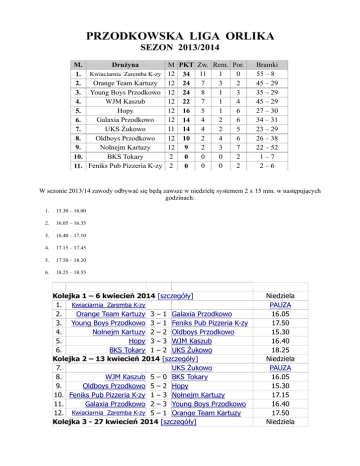 PRZODKOWSKA LIGA ORLIKA SEZON 2013/2014 M PKT Zw. Rem. Por. M. Drużyna 1 0 1. Kwiaciarnia Zaremba K-zy 12 34 11 Orange Team Kartuzy 12 24 7 3 2 2. 8 1 3 3. Young Boys Przodkowo 12 24 WJM Kaszub 12 22 7 1 4 4. Hopy 12 16 5 1 6 5. Galaxia Przodkowo 12 14 4 2 6 6. UKS Żukowo 11 14 4 2 5 7. Oldboys Przodkowo 12 10 2 4 6 8. Nołnejm Kartuzy 12 9 2 3 7 9. BKS Tokary 2 0 0 2 10. 0 0 0 2 11. Feniks Pub Pizzeria K-zy 2 0 Bramki 55 – 8 45 – 29 35 – 29 45 – 29 27 – 30 34 – 31 23 – 29 26 – 38 22 – 52 1–7 2–6 W sezonie 2013/14 zawody odbywać się będą zawsze w niedzielę systemem 2 x 15 min. w następujących godzinach: 1. 15.30 – 16.00 2. 16.05 – 16.35 3. 16.40 – 17.10 4. 17.15 – 17.45 5. 17.50 – 18.20 6. 18.25 – 18.55 Kolejka 1 – 6 kwiecień 2014 [szczegóły] 1. Kwiaciarnia Zaremba K-zy 2. Orange Team Kartuzy 3 – 1 Galaxia Przodkowo 3. Young Boys Przodkowo 3 – 1 Feniks Pub Pizzeria K-zy 4. Nołnejm Kartuzy 2 – 2 Oldboys Przodkowo 5. Hopy 3 – 3 WJM Kaszub 6. BKS Tokary 1 – 2 UKS Żukowo Kolejka 2 – 13 kwiecień 2014 [szczegóły] 7. UKS Żukowo 8. WJM Kaszub 5 – 0 BKS Tokary 9. Oldboys Przodkowo 5 – 2 Hopy 10. Feniks Pub Pizzeria K-zy 1 – 3 Nołnejm Kartuzy 11. Galaxia Przodkowo 2 – 3 Young Boys Przodkowo 12. Kwiaciarnia Zaremba K-zy 5 – 1 Orange Team Kartuzy Kolejka 3 - 27 kwiecień 2014 [szczegóły] Niedziela PAUZA 16.05 17.50 15.30 16.40 18.25 Niedziela PAUZA 16.05 15.30 17.15 16.40 17.50 Niedziela 13. Orange Team Kartuzy Kwiaciarnia Zaremba K-zy 14. Young Boys Przodkowo 15. Nołnejm Kartuzy Galaxia Przodkowo 16. Hopy Feniks Pub Pizzeria K-zy 17. BKS Tokary Oldboys Przodkowo 18. UKS Żukowo WJM Kaszub Kolejka 4 – 11 maj 2014 [szczegóły] 19. WJM Kaszub 20. Oldboys Przodkowo UKS Żukowo BKS Tokary 21. Feniks Pub Pizzeria K-zy 22. Galaxia Przodkowo Hopy 23. Kwiaciarnia Zaremba K-zy Nołnejm Kartuzy 24. Orange Team Kartuzy Young Boys Przodkowo Kolejka 5 – 18 maj 2014 [szczegóły] 25. Young Boys Przodkowo 26. Nołnejm Kartuzy Orange Team Kartuzy Kwiaciarnia Zaremba K-zy 27. Hopy 28. BKS Tokary Galaxia Przodkowo 29. UKS Żukowo Feniks Pub Pizzeria K-zy 30. WJM Kaszub Oldboys Przodkowo Kolejka 6 – 25 maj 2014 [szczegóły] 31. Oldboys Przodkowo 32. Feniks Pub Pizzeria K-zy WJM Kaszub 33. Galaxia Przodkowo UKS Żukowo 34. Kwiaciarnia Zaremba K-zy BKS Tokary 35. Orange Team Kartuzy Hopy 36. Young Boys Przodkowo Nołnejm Kartuzy Kolejka 7 – 1 czerwiec 2014 [szczegóły] 37. Nołnejm Kartuzy 38. Hopy Young Boys Przodkowo 39. BKS Tokary Orange Team Kartuzy Kwiaciarnia Zaremba K-zy 40. UKS Żukowo 41. WJM Kaszub Galaxia Przodkowo 42. Oldboys Przodkowo Feniks Pub Pizzeria K-zy Kolejka 8 – 8 czerwiec 2014 [szczegóły] 43. Feniks Pub Pizzeria K-zy 44. Galaxia Przodkowo Oldboys Przodkowo 45. Kwiaciarnia Zaremba K-zy WJM Kaszub 46. Orange Team Kartuzy UKS Żukowo 47. Young Boys Przodkowo BKS Tokary 48. Nołnejm Kartuzy Hopy Kolejka 9 – 15 czerwiec 2014 [szczegóły] PAUZA 17.15 16.40 16.05 15.30 17.50 Niedziela PAUZA 15.30 16.05 17.15 17.50 16.40 Niedziela PAUZA 17.50 16.40 17.15 16.05 15.30 Niedziela PAUZA 17.50 16 05 17.15 16.40 15.30 Niedziela PAUZA 16 05 17.15 17 05 16.40 15.30 Niedziela PAUZA 15.30 16.40 16.05 17.50 17.15 Niedziela 49. Hopy 50. BKS Tokary 51. UKS Żukowo 52. WJM Kaszub 53. Oldboys Przodkowo 54. Feniks Pub Pizzeria K-zy Nołnejm Kartuzy Young Boys Przodkowo Orange Team Kartuzy Kwiaciarnia Zaremba K-zy Galaxia Przodkowo PAUZA 16.40 17.15 16.05 15.30 17.50 Kolejka 10 – 22 czerwiec 2014 [szczegóły] Niedziela 55. Galaxia Przodkowo 56. Kwiaciarnia Zaremba K-zy Feniks Pub Pizzeria K-zy 57. Orange Team Kartuzy Oldboys Przodkowo 58. Young Boys Przodkowo WJM Kaszub 59. Nołnejm Kartuzy UKS Żukowo 60. Hopy BKS Tokary Kolejka 11 – 29 czerwiec 2014 [szczegóły] 61. BKS Tokary 62. UKS Żukowo Hopy 63. WJM Kaszub Nołnejm Kartuzy 64. Oldboys Przodkowo Young Boys Przodkowo 65. Feniks Pub Pizzeria K-zy Orange Team Kartuzy Kwiaciarnia Zaremba K-zy 66. Galaxia Przodkowo PAUZA 17.50 15.30 16 05 16.40 17.15 Niedziela PAUZA 16 05 16.40 15 30 17.50 17.15