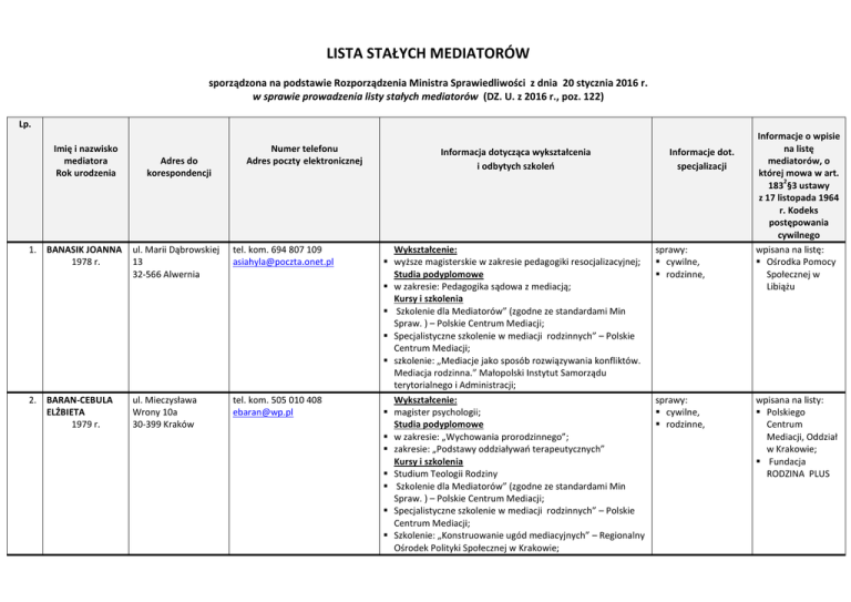 LISTA STAŁYCH MEDIATORÓW sporządzona na podstawie Rozporządzenia Ministra Sprawiedliwości z dnia 20 stycznia 2016 r. w sprawie prowadzenia listy stałych mediatorów (DZ. U. z 2016 r., poz. 122) Lp. Imię i nazwisko mediatora Rok urodzenia Adres do korespondencji Numer telefonu Adres poczty elektronicznej 1. BANASIK JOANNA 1978 r. ul. Marii Dąbrowskiej 13 32-566 Alwernia tel. kom. 694 807 109 [email protected] 2. BARAN-CEBULA B ELŻBIETA A R 1979 r. A N ul. Mieczysława Wrony 10a 30-399 Kraków tel. kom. 505 010 408 [email protected] Informacja dotycząca wykształcenia i odbytych szkoleń Wykształcenie: wyższe magisterskie w zakresie pedagogiki resocjalizacyjnej; Studia podyplomowe w zakresie: Pedagogika sądowa z mediacją; Kursy i szkolenia Szkolenie dla Mediatorów” (zgodne ze standardami Min Spraw. ) – Polskie Centrum Mediacji; Specjalistyczne szkolenie w mediacji rodzinnych” – Polskie Centrum Mediacji; szkolenie: „Mediacje jako sposób rozwiązywania konfliktów. Mediacja rodzinna.” Małopolski Instytut Samorządu terytorialnego i Administracji; Wykształcenie: magister psychologii; Studia podyplomowe w zakresie: „Wychowania prorodzinnego”; zakresie: „Podstawy oddziaływań terapeutycznych” Kursy i szkolenia Studium Teologii Rodziny Szkolenie dla Mediatorów” (zgodne ze standardami Min Spraw. ) – Polskie Centrum Mediacji; Specjalistyczne szkolenie w mediacji rodzinnych” – Polskie Centrum Mediacji; Szkolenie: „Konstruowanie ugód mediacyjnych” – Regionalny Ośrodek Polityki Społecznej w Krakowie; Informacje dot. specjalizacji sprawy: cywilne, rodzinne, sprawy: cywilne, rodzinne, Informacje o wpisie na listę mediatorów, o której mowa w art. 2 183 §3 ustawy z 17 listopada 1964 r. Kodeks postępowania cywilnego wpisana na listę: Ośrodka Pomocy Społecznej w Libiążu wpisana na listy: Polskiego Centrum Mediacji, Oddział w Krakowie; Fundacja RODZINA PLUS 3. BOCIAŃSKAPOTEMPA MARIOLA 1960 r. 4. BOROWIK REGINA ul. Ks. Ściegiennego 1949 r. 64C 30-809 Kraków 5. CYROL TOMASZ 1983 r. ul. Daszyńskiego 14 34-120 Andrychów Al. W. Beliny Prażmowskiego 29/6 31-514 Kraków tel. kom. 608 525 614 [email protected] tel. kom. 604 724 568 [email protected] tel. kom. 607 238 614 [email protected] kurs kwalifikacyjny „Uprawnienia pedagogiczne” dla absolwentów szkół wyższych – Szkoła Wyższa im. Bogdana Jańskiego Wydział Zamiejscowy w Krakowie; „Całościowe szkolenie podyplomowe przygotowujące do uzyskania certyfikatu psychoterapeuty” – Fundacja Krakowskiej Katedry Psychiatrii im. J.J. Haubenstocków w Krakowie; Wykształcenie: magister pedagogiki (pedagogika specjalna, resocjalizacja) Studia podyplomowe w zakresie: Pedagogika sądowa i mediacje; w zakresie: Logopedia Kursy i szkolenia Szkolenie dla Mediatorów” (zgodne ze standardami Min Spraw. ) – Polskie Centrum Mediacji; Szkolenie prawne dla mediatorów w zakresie mediacji cywilnej”- Polskie Centrum Mediacji; Specjalistyczne szkolenie w mediacji rodzinnych” – Polskie Centrum Mediacji; „Specjalistyczne szkolenie w zakresie alternatywnych sposobów rozwiązywania sporów w sprawach gospodarczych” - Fundacja Rozwoju Demokracji Lokalnej Centrum Mazowsze; Wykształcenie: doktor nauk humanistycznych w zakresie psychologii UJ; magister socjologii (patologie społeczne); Kursy i szkolenia „Szkolenie specjalistyczne w zakresie mediacji - Sąd Apelacyjny w Krakowie; szkolenie I stopnia: „Terapia krótkoterminowa ukierunkowana na rozwiązanie problemu” – Ośrodek Terapii Krótkoterminowej w Krakowie; Wykształcenie: wyższe - prawnicze; doktor nauk prawnych zakresie prawa; adwokat wykonujący zawód przy Okręgowej Radzie Adwokackiej w Krakowie; Studia podyplomowe: w zakresie: Mediacje - Alternatywne Metody Rozwiązywania Sporów; sprawy: cywilne, rodzinne, wpisana na listę: Polskiego Centrum Mediacji, Oddział w Krakowie sprawy: cywilne, rodzinne gospodarcze --- sprawy: cywilne, gospodarcze, wpisany na listę: Centrum Alternatywnego Rozwiązywania Sporów przy Wydziale Prawa i Administracji Uniwersytetu Jagiellońskiego 6. CZARNOTA EDYTA ul. K. Wielkiego 29 lok. tel. kom. 668 160 308 1974 r. 201 a [email protected] 32-300 Olkusz (mediacje prowadzone na terenie Krakowa Olkusza) 7. 8. DENIUSZ-JOB KATARZYNA 1974 r. FELIKSIK EWA 1980 r. Młodziejowice 95 32-091 Michałowice ul. Minkiewicza 8 32-300 Olkusz tel. kom. 531 636 955 faks 12 362 46 62 [email protected] tel. kom. 507 270 840 [email protected] Wykształcenie: wyższe – ekonomiczne – o kierunku zarządzanie i marketing; Studia podyplomowe: Mediacje - Alternatywne Metody Rozwiązywania Sporów; Kursy i szkolenia: szkolenie „Twórcze rozwiązywanie problemów” – Małopolska Agencja Rozwoju Regionalnego S.A. w Krakowie; szkolenie ramach projektu: „Propagowanie Alternatywnych Metod Rozwiązywania Sporów” - PM Group Laax Sp. z o.o. Sp. k. na zlecenie Ministerstwa Sprawiedliwości; Wykształcenie: magister pedagogiki opiekuńczo-wychowawczej; Studia podyplomowe w zakresie: Socjoterapia; Kursy i szkolenia „Całościowe szkolenie z zakresu Psychoterapii – Zakład Terapii Rodzin Katedry Psychiatrii Collegium Medicum UJ”; szkolenie i trening: „156 Szkoła Mediacji”- Akademia ADR Warszawa; specjalistyczne warsztaty: ”Konstruowanie ugód w sprawach karnych , nieletnich, cywilnych, rodzinnych i gospodarczych” – Akademia ADR Warszawa; szkolenie w ramach projektu: „Propagowanie alternatywnych metod rozwiązywania sporów” - PM Group Laax Sp. z o.o. Sp. k. na zlecenie Ministerstwa Sprawiedliwości; Wykształcenie: wykształcenie prawnicze; Studia podyplomowe: w zakresie: Mediacje - Alternatywne Metody Rozwiązywania Sporów; Kursy i szkolenia Szkolenie dla Mediatorów” (zgodne ze standardami Min Spraw. ) – Polskie Centrum Mediacji; Specjalistyczne szkolenie w mediacji rodzinnych” – Polskie Centrum Mediacji; „Specjalistyczne szkolenie z mediacji cywilnych i gospodarczych Z elementami 