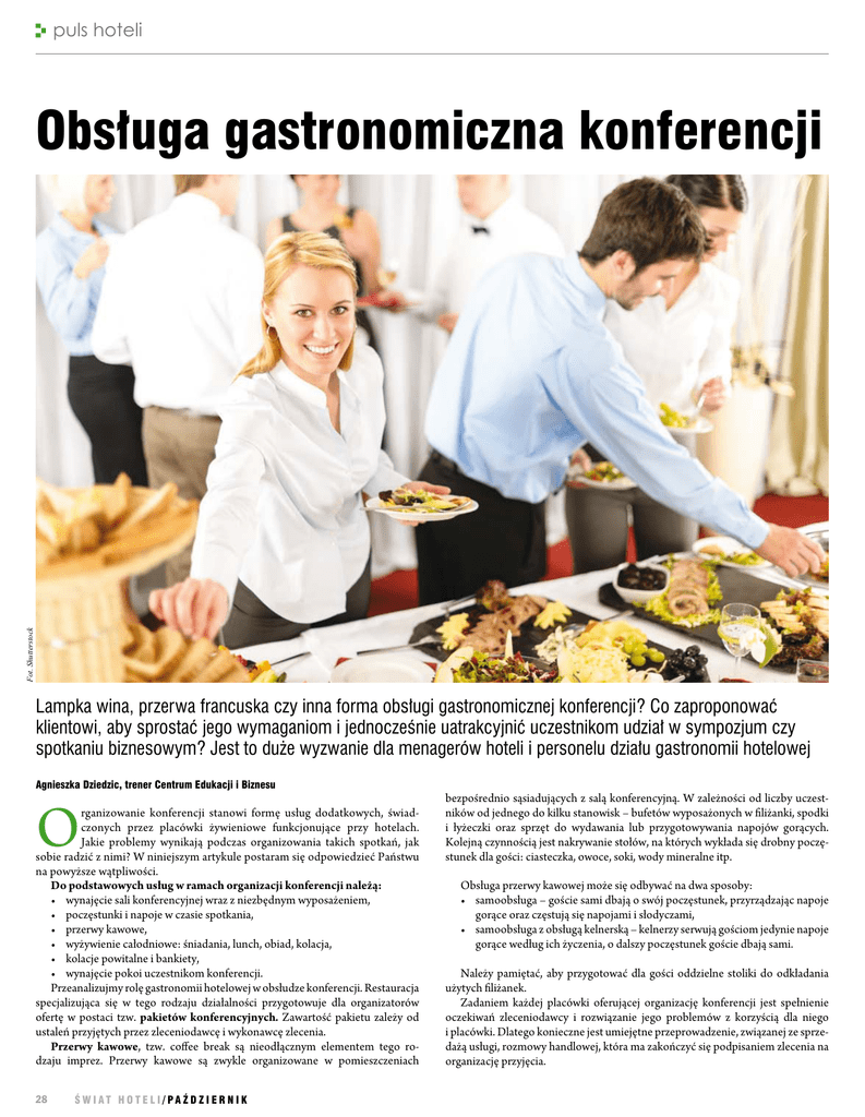 puls hoteli Fot. Shutterstock Obsługa gastronomiczna konferencji Lampka wina, przerwa francuska czy inna forma obsługi gastronomicznej konferencji? Co zaproponować klientowi, aby sprostać jego wymaganiom i jednocześnie uatrakcyjnić uczestnikom udział w sympozjum czy spotkaniu biznesowym? Jest to duże wyzwanie dla menagerów hoteli i personelu działu gastronomii hotelowej Agnieszka Dziedzic, trener Centrum Edukacji i Biznesu O rganizowanie konferencji stanowi formę usług dodatkowych, świadczonych przez placówki żywieniowe funkcjonujące przy hotelach. Jakie problemy wynikają podczas organizowania takich spotkań, jak sobie radzić z nimi? W niniejszym artykule postaram się odpowiedzieć Państwu na powyższe wątpliwości. Do podstawowych usług w ramach organizacji konferencji należą: • wynajęcie sali konferencyjnej wraz z niezbędnym wyposażeniem, • poczęstunki i napoje w czasie spotkania, • przerwy kawowe, • wyżywienie całodniowe: śniadania, lunch, obiad, kolacja, • kolacje powitalne i bankiety, • wynajęcie pokoi uczestnikom konferencji. Przeanalizujmy rolę gastronomii hotelowej w obsłudze konferencji. Restauracja specjalizująca się w tego rodzaju działalności przygotowuje dla organizatorów ofertę w postaci tzw. pakietów konferencyjnych. Zawartość pakietu zależy od ustaleń przyjętych przez zleceniodawcę i wykonawcę zlecenia. Przerwy kawowe, tzw. coffee break są nieodłącznym elementem tego rodzaju imprez. Przerwy kawowe są zwykle organizowane w pomieszczeniach 28 Ś w i at h o t e l i / pa ź d z i e r n i k bezpośrednio sąsiadujących z salą konferencyjną. W zależności od liczby uczestników od jednego do kilku stanowisk – bufetów wyposażonych w filiżanki, spodki i łyżeczki oraz sprzęt do wydawania lub przygotowywania napojów gorących. Kolejną czynnością jest nakrywanie stołów, na których wykłada się drobny poczęstunek dla gości: ciasteczka, owoce, soki, wody mineralne itp. Obsługa przerwy kawowej może się odbywać na dwa sposoby: • samoobsługa – goście sami dbają o swój poczęstunek, przyrządzając napoje gorące oraz częstują się napojami i słodyczami, • samoobsługa z obsługą kelnerską – kelnerzy serwują gościom jedynie napoje gorące według ich życzenia, o dalszy poczęstunek goście dbają sami. Należy pamiętać, aby przygotować dla gości oddzielne stoliki do odkładania użytych filiżanek. Zadaniem każdej placówki oferującej organizację konferencji jest spełnienie oczekiwań zleceniodawcy i rozwiązanie jego problemów z korzyścią dla niego i placówki. Dlatego konieczne jest umiejętne przeprowadzenie, związanej ze sprzedażą usługi, rozmowy handlowej, która ma zakończyć się podpisaniem zlecenia na organizację przyjęcia. puls hoteli Umowa jest rodzajem kontraktu pomiędzy gościem jako zleceniodawcą, a placówką żywieniową jako zleceniobiorcą. Warunki kontraktu określone są w umowie i obowiązują obydwie strony. Aby pozytywnie sfinalizować sprzedaż usługi należy: • zapytać gościa o życzenia, • przedstawić gotowe propozycje placówki, • rozbudzić zainteresowanie gościa przedstawionymi ofertami, • doradzić w wyborze najkorzystniejszej opcji, • ustalić menu na przyjęcie, • zapoznać gościa ze szczegółowymi informacjami dotyczącymi dodatkowych opłat za • wydłużenie czasu pracy personelu, zaangażowanie orkiestry, itp., • doprowadzić do podpisania zlecenia na organizację przyjęcia. W przypadku organizowania wyżywienia dla grup międzynarodowych należy brać pod uwagę również zwyczaje żywieniowe obcokrajowców oraz ich upodobania lub niechęć do niektórych potraw. Dla gości zagranicznych zazwyczaj przygotowuje się menu okazjonalne w obcym języku. Przy dłuższym pobycie gości menu powinno być urozmaicone, przygotowane zgodnie z zaleceniami fachowców od żywienia, a jednocześnie powinno jak najlepiej prezentować wysoki poziom świadczonych usług gastronomicznych. Zlecenie przyjęcia, czy tzw. umowa powinna być sporządzana na specjalnie przygotowanym druku, który musi zawierać następujące informacje: • nazwa placówki, • data imprezy: godzina rozpoczęcia, • rodzaj imprezy: godzina zakończenia, • organizator: liczba osób, • telefon kontaktowy, • pomieszczenie – sala bankietowa, restauracja, • data przyjęcia zlecenia, • rezerwacja sali, • kolejność podawania napojów, • kolejność i sposób podawania potraw: na powitanie, do potraw, przekąski zimne, przekąski gorące, zupa, danie zasadnicze, desery, • limit pieniężny na jedną osobę, • dodatkowe życzenia zleceniodawcy. Przyjmując zamówienie na usługę gastronomiczną kierownik ustala z zamawiającym: • numer lub nazwę rezerwowanej sali, ewentualnie miejsce w sali ogólnej dla małej grupy, • menu. W celu usprawnienia rozmów kierownik powinien posiadać gotowe formularze ze specyfikacją proponowanych usług, ofertę z tzw. pakietami konferencyjnymi, seminaryjnymi itp. oraz przykładowe zestawy menu, które ustala się, biorąc pod uwagę charakter spotkania oraz możliwości techniczne i organizacyjne gastronomii hotelowej związane z wyposażeniem zaplecza kuchennego i liczbą zatrudnionych osób. W przypadku organizowania wyżywienia dla grup międzynarodowych należy brać pod uwagę również zwyczaje żywieniowe obcokrajowców oraz ich upodobania lub niechęć do niektórych potraw. Dla gości zagranicznych zazwyczaj przygotowuje się menu okazjonalne w obcym języku. Przy dłuższym pobycie gości menu powinno być urozmaicone, przygotowane zgodnie z zaleceniami fachowców od żywienia, a jednocześnie powinno jak najlepiej prezentować wysoki poziom świadczonych usług gastronomicznych. Organizacja wyżywienia uczestników konferencji musi być skoordynowana z programem zajęć, posiłki powinny być podawane punktualnie i nie mogą trwać dłużej, niż to zaplanowano. Dlatego do obsł