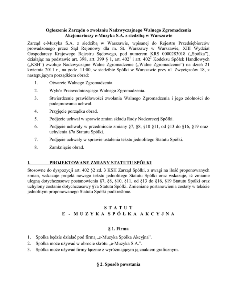 www.e-muzyka.pl w zakładce „Dla Inwestorów” / „Walne Zgromadzenia”.