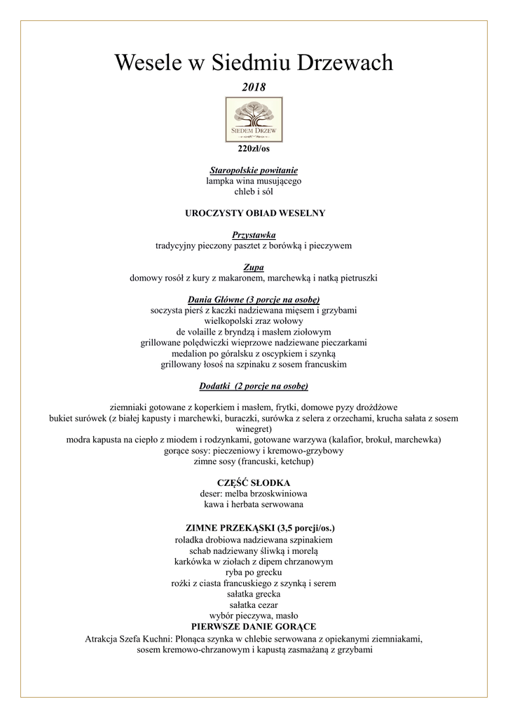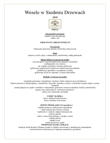 Wesele w Siedmiu Drzewach 2018 220zł/os Staropolskie powitanie lampka wina musującego chleb i sól UROCZYSTY OBIAD WESELNY Przystawka tradycyjny pieczony pasztet z borówką i pieczywem Zupa domowy rosół z kury z makaronem, marchewką i natką pietruszki Dania Główne (3 porcje na osobę) soczysta pierś z kaczki nadziewana mięsem i grzybami wielkopolski zraz wołowy de volaille z bryndzą i masłem ziołowym grillowane polędwiczki wieprzowe nadziewane pieczarkami medalion po góralsku z oscypkiem i szynką grillowany łosoś na szpinaku z sosem francuskim Dodatki (2 porcje na osobę) ziemniaki gotowane z koperkiem i masłem, frytki, domowe pyzy drożdżowe bukiet surówek (z białej kapusty i marchewki, buraczki, surówka z selera z orzechami, krucha sałata z sosem winegret) modra kapusta na ciepło z miodem i rodzynkami, gotowane warzywa (kalafior, brokuł, marchewka) gorące sosy: pieczeniowy i kremowo-grzybowy zimne sosy (francuski, ketchup) CZĘŚĆ SŁODKA deser: melba brzoskwiniowa kawa i herbata serwowana ZIMNE PRZEKĄSKI (3,5 porcji/os.) roladka drobiowa nadziewana szpinakiem schab nadziewany śliwką i morelą karkówka w ziołach z dipem chrzanowym ryba po grecku rożki z ciasta francuskiego z szynką i serem sałatka grecka sałatka cezar wybór pieczywa, masło PIERWSZE DANIE GORĄCE Atrakcja Szefa Kuchni: Płonąca szynka w chlebie serwowana z opiekanymi ziemniakami, sosem kremowo-chrzanowym i kapustą zasmażaną z grzybami TORT WESELNY (we własnym zakresie) DRUGIE DANIE GORĄCE (dwie pozycje do wyboru) Kurczak w kremowym sosie curry z ryżem/ kuleczki z mięsa mielonego w pikantnym sosie z ryżem/pieczone udko z kurczaka marynowane w ziołach z ryżem i marchewką z groszkiem, karkówka z grilla marynowana w ziołach z dipami/golonka po bawarsku z musztardą i chrzanem/szaszłyki z polędwiczkami wieprzowymi i warzywami/ boeuf stroganow wieprzowy z kluseczkami półfrancuskimi TRZECIE DANIE GORĄCE (jedna pozycja do wyboru) Domowy barszcz z grzybowym pasztecikiem/ zupa gulaszowa/żurek na prawdziwym zakwasie z jajkiem i kiełbaską W CENIE MENU WSZYSTKIE NAPOJE BEZALKOHOLOWE kawa i herbata z dodatkami w formie bufetu woda mineralna bez gazu i soki owocowe serwowane w dzbankach bez ograniczeń przez cały czas trwania uroczystości napoje gazowane w butelkach szklanych o pojemności 0,2l bez limitu Oraz Dekoracyjnie wycinane owoce serwowane na paterach lub w formie stolika owocowego We własnym zakresie alkohol tort weselny ciasta (zapraszamy do skorzystania z oferty pysznych naturalnych ciast wypiekanych w „Siedmiu Drzewach”) LISTA DAŃ W trosce o wyjątkowość Państwa uroczystości, stworzyliśmy oryginalną listę dań. Każdą pozycję obiadową można zastąpić potrawą z tej samej kategorii, znajdującą się na liście dań. Jesteśmy ponadto otwarci na wszelkie Państwa sugestie oraz pomysły, gdyż zadowolenie Gości jest dla nas najważniejsze. Przystawki sałatka caprese ze świeżą bazylią schab faszerowany warzywami roladka z kurczaka i papryki na sałacie wytrawny ptyś z pastą z łososia Zupy krem z pomidorów z fetą i świeżą bazylią migdałowy krem z kurczaka krem z białych warzyw z grillowaną szynką szwarcwaldzką krem pieczarkowy z groszkiem ptysiowym Dania główne medalion schabowy panierowany nadziewany serem i szynką sznycelki z kurczaka w cieście ziołowym soczysta karkówka ze smażoną cebulką kieszonka wieprzowa nadziewana brokułami tradycyjny kotlet schabowy pierś z kurczaka nadziewana serem i świeżą bazylią roladka drobiowa z pieczarkami i cebulką potrawka z kurczaka z białym sosie udko z kurczaka faszerowane pieczarkami udko z kurczaka faszerowane warzywami z curry filet z dorsza w ziołowej panierce Dodatki frytki ziołowe, opiekane ziemniaki z ziołami, puree ziemniaczane z koperkiem, ryż, kasza gryczana, kasza jaglana z warzywami Warzywa i surówki mizeria, kapusta zasmażana z grzybami, marchewka z groszkiem, fasolka szparagowa z bułeczką (sezonowo), smażone pieczarki z cebulką Desery lody waniliowe z sosem czekoladowym/toffi lub z owocami, krucha babeczka z bitą śmietaną i owocami, pieczone jabłko z konfiturą, cynamonem i lodami waniliowymi, kremowy sernik z wiśniami, smażone banany w sosie miodowo-pomarańczowym z lodami, sałatka owocowa, szarlotka na ciepło z lodami waniliowymi Bufet roladka schabowa nadziewana pieczarkami, rolada z kurczaka z żółtym serem, roladki z polędwiczki, wieprzowej nadziewane cebulką, tymbaliki drobiowe, schab faszerowany śliwką i morelą, pasztet staropolski z grzybami, jajka faszerowane pieczarkami, jajka faszerowane pastą z tuńczyka, jajka zawijane w szynce ze szczypiorkiem, ruloniki z szynki z musem chrzanowym, pikle: pieczarki, korniszony, papryka, roladka z pstrąga nadziewana brokułami, śledzie z cebulką (rolmopsy), pomidory nadziewane sałatką jarzynową, sałatka meksykańska z ryżem i tuńczykiem, niemiecka sałatka ziemniaczana, mieszane sałaty z miodowym, sosem vinaigrette i bekonem, sałatka caprese, sałatka z paluszków krabowych, pieczona papryka nadziewana fetą i ziołami ATRAKCJE I USŁUGI DODATKOWE Atrakcje i dodatki kulinarne 1. Wyjątkowy sok jabłkowy "Siedem Drzew", tłoczony z jabłek z naszego sadu, dodany do asortymenu soków na weselu bez limitu + 7zł/os. 2. Lemoniada tradycyjna lub kwiatowa w lodowych słojach dodana do bufetu z napojami gazowanymi 80zł/słój 5l 3. Aromatyczne i oryginalne kompozycje ryb wędzonych przez Szefa Kuchni w wędzarni "Siedem Drzew" w dymie z drzew liściastych (m.in. łosoś wędzony z jajkiem w galarecie, sandacz z garnirowany limonką, filet z pstrąga wytrybowany z ości, pstrąg w całości na bufet aromatyzowany czosnkiem niedźwiedzim, paszteciki z wędzoną rybą w chrupiącym cieście, tartaletki z wędzonym łososiem i szpinakiem, tartaletki z sandaczem, kremową śmietaną i koperkiem, babeczki z pastą z makreli) ceny według wyboru 4. Róże z łososia wędzonego z przybrani