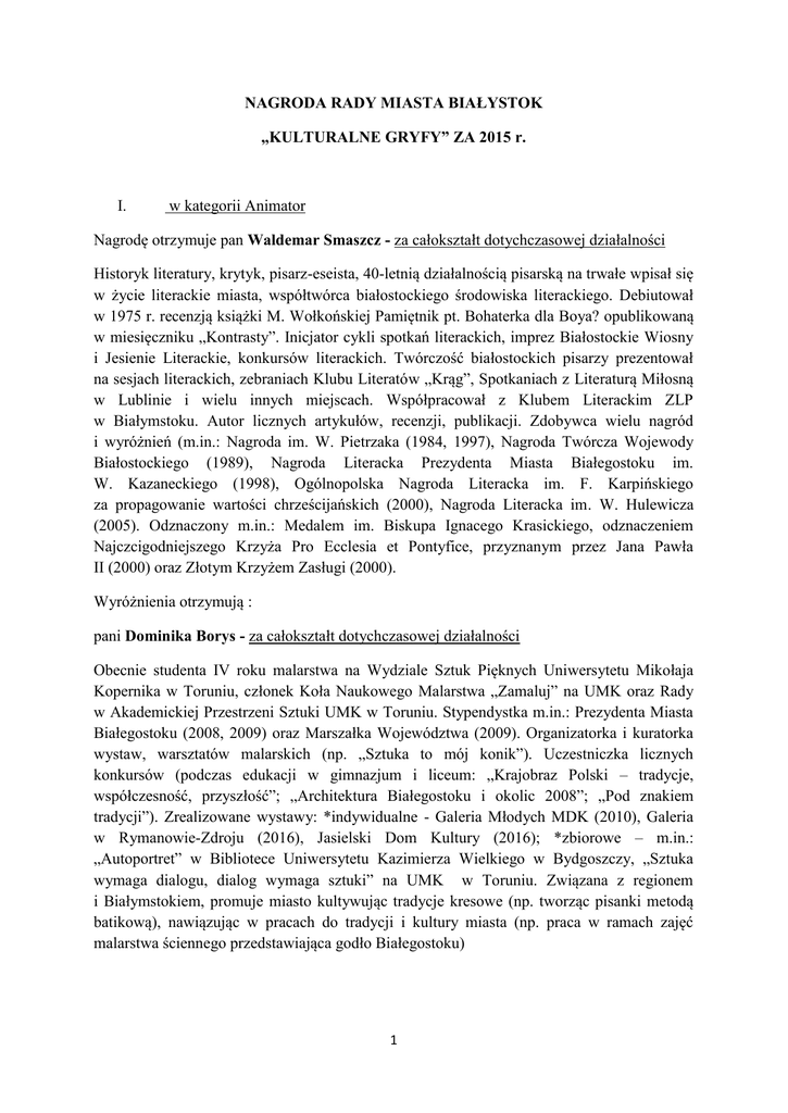 NAGRODA RADY MIASTA BIAŁYSTOK „KULTURALNE GRYFY” ZA 2015 r. I. w kategorii Animator Nagrodę otrzymuje pan Waldemar Smaszcz - za całokształt dotychczasowej działalności Historyk literatury, krytyk, pisarz-eseista, 40-letnią działalnością pisarską na trwałe wpisał się w życie literackie miasta, współtwórca białostockiego środowiska literackiego. Debiutował w 1975 r. recenzją książki M. Wołkońskiej Pamiętnik pt. Bohaterka dla Boya? opublikowaną w miesięczniku „Kontrasty”. Inicjator cykli spotkań literackich, imprez Białostockie Wiosny i Jesienie Literackie, konkursów literackich. Twórczość białostockich pisarzy prezentował na sesjach literackich, zebraniach Klubu Literatów „Krąg”, Spotkaniach z Literaturą Miłosną w Lublinie i wielu innych miejscach. Współpracował z Klubem Literackim ZLP w Białymstoku. Autor licznych artykułów, recenzji, publikacji. Zdobywca wielu nagród i wyróżnień (m.in.: Nagroda im. W. Pietrzaka (1984, 1997), Nagroda Twórcza Wojewody Białostockiego (1989), Nagroda Literacka Prezydenta Miasta Białegostoku im. W. Kazaneckiego (1998), Ogólnopolska Nagroda Literacka im. F. Karpińskiego za propagowanie wartości chrześcijańskich (2000), Nagroda Literacka im. W. Hulewicza (2005). Odznaczony m.in.: Medalem im. Biskupa Ignacego Krasickiego, odznaczeniem Najczcigodniejszego Krzyża Pro Ecclesia et Pontyfice, przyznanym przez Jana Pawła II (2000) oraz Złotym Krzyżem Zasługi (2000). Wyróżnienia otrzymują : pani Dominika Borys - za całokształt dotychczasowej działalności Obecnie studenta IV roku malarstwa na Wydziale Sztuk Pięknych Uniwersytetu Mikołaja Kopernika w Toruniu, członek Koła Naukowego Malarstwa „Zamaluj” na UMK oraz Rady w Akademickiej Przestrzeni Sztuki UMK w Toruniu. Stypendystka m.in.: Prezydenta Miasta Białegostoku (2008, 2009) oraz Marszałka Województwa (2009). Organizatorka i kuratorka wystaw, warsztatów malarskich (np. „Sztuka to mój konik”). Uczestniczka licznych konkursów (podczas edukacji w gimnazjum i liceum: „Krajobraz Polski – tradycje, współczesność, przyszłość”; „Architektura Białegostoku i okolic 2008”; „Pod znakiem tradycji”). Zrealizowane wystawy: *indywidualne - Galeria Młodych MDK (2010), Galeria w Rymanowie-Zdroju (2016), Jasielski Dom Kultury (2016); *zbiorowe – m.in.: „Autoportret” w Bibliotece Uniwersytetu Kazimierza Wielkiego w Bydgoszczy, „Sztuka wymaga dialogu, dialog wymaga sztuki” na UMK w Toruniu. Związana z regionem i Białymstokiem, promuje miasto kultywując tradycje kresowe (np. tworząc pisanki metodą batikową), nawiązując w pracach do tradycji i kultury miasta (np. praca w ramach zajęć malarstwa ściennego przedstawiająca godło Białegostoku) 1 pani Anna Łuszyńska - za całokształt dotychczasowej działalności Od 2011 r. związana z Białostockim Ośrodkiem Kultury. Animatorka kultury, doświadczony organizator. Współorganizowała szereg festiwali i wydarzeń artystycznych z kołami naukowymi i organizacjami pozarządowymi z Białegostoku i Torunia, m.in.: Festiwal Basowiszcza, Dni Białoruskie w Toruniu, Majowy Buum Poetycki. Publikowała m.in. w: Kwartalniku Etnologicznym „Okolice”, Tygodniku Mniejszości Białoruskiej „Niva”. Jest współzałożycielką Stowarzyszenia Kulturalno-Artystycznego w Toruniu. Od 2012 r. kurator i koordynator festiwalu Dni Sztuki Współczesnej, także koordynator Festiwalu Inny Wymiar w 2012 r. Z jej inicjatywy książka „Żydowski Białystok i jego diaspora” doczekała się przekładu na język polski. Jest inicjatorką rozbudowanej formuły wolontariatu przy festiwalach Białostockiego Ośrodka Kultury. Od 2013 r. pełni rolę kuratorki i koordynatorki Małej Galerii BOK. Pomysłodawczyni, koordynatorka i prelegentka cyklu edukacyjnego Białostocki Szlak Kobiet – przypominającego losy najważniejszych dla Białegostoku kobiet z kilku stuleci. pani Anna Olszewska - za całokształt dotychczasowej działalności Dyrygent, chórmistrz, pedagog, kurator ogólnopolskiego programu Akademia Chóralna – Śpiewająca Polska, stypendystka Prezydenta Miasta Białegostoku (2010, 2012). Uhonorowana Medalem Komisji Edukacji Narodowej (2011), laureatka Nagrody I stopnia Rektora UMFC (2013), Nagrody Przewodniczącego Rady Miejskiej Białegostoku dla Nauczycieli – Animatorów Kultury (2011). Jest dyrygentem 3 białostockich chórów, z którymi koncertuje w Polsce i zagranicą (są to: Chór Żeński Zespołu Szkół Muzycznych im. I. Paderewskiego Schola Cantorum Bialostociensis, Międzyszkolny Chór Żeński przy III LO, Chór Kameralny Con Spirito). Prowadzi działalność naukową i pedagogiczną na Uniwersytecie Muzycznym F. Chopina na Wydziale Instrumentalno-Pedagogicznym organizując konferencje, seminaria, warsztaty. Prowadzi intensywną działalność koncertową obejmującą: * występy podczas koncertów i festiwali chóralnych (udział w około 60 konkursach chóralnych), gdzie otrzymuje najwyższe nagrody, m.in.: Grand Prix/Nagrody Główne, I miejsca/Złote Dyplomy, Nagrodę dla najlepszego dyrygenta w III Ogólnopolskim Konkursie Chórów Szkół Muzycznych I i II stopnia w Warszawie, Nagrodę Katedry Chóralistyki i Edukacji Muzycznej Akademii Muzycznej w Bydgoszczy, Bursztynową Aureolę św. Piotra Apostoła w Międzynarodowym Festiwalu Pieśni Chóralnej w Międzyzdrojach; * koncerty zagraniczne (Ukraina, Niemcy, Słowacja, Czechy, Belgia, Litwa, Białoruś, Austria, Włochy, Hiszpania); * współpracę z innymi zespołami chóralnymi, które pod jej kierownictwem wykonały dzieła wokalno-instrumentalne; * rejestrację 6 płyt CD pod jej kierunkiem, m.in.: Bajeczna muzyka, Śpiew jest mową aniołów, Nieznane dzieła S. Ziemianowskiego, Kolędy; * dokonała prawykonań 15 kompozycji a cappella i wokalnoinstrumentalnych; * realizację projektów: Barwy muzyki – a cappella i nie tylko, Disney – bajeczna muzyka dofinansowanych przez Mi