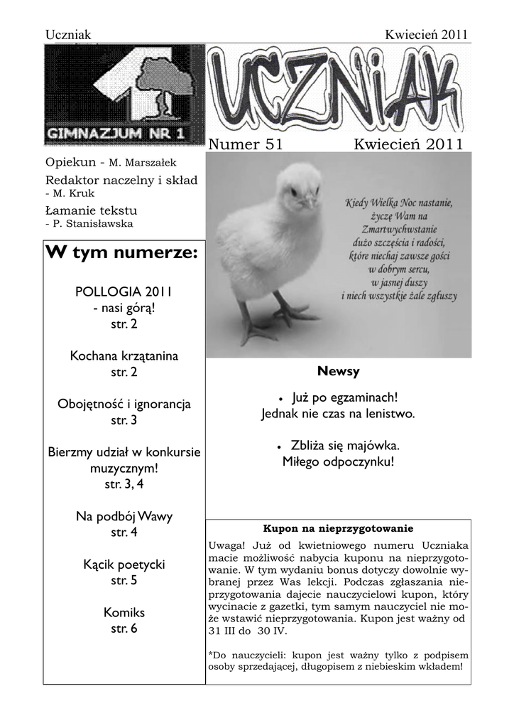 Uczniak Kwiecień 2011 Numer 51 Kwiecień 2011 Opiekun - M. Marszałek Redaktor naczelny i skład - M. Kruk Łamanie tekstu - P. Stanisławska W tym numerze: POLLOGIA 2011 - nasi górą! str. 2 Kochana krzątanina str. 2 Newsy Obojętność i ignorancja str. 3 Już po egzaminach! Jednak nie czas na lenistwo. Bierzmy udział w konkursie muzycznym! str. 3, 4 Na podbój Wawy str. 4 Kącik poetycki str. 5 Komiks str. 6 • • Zbliża się majówka. Miłego odpoczynku! Kupon na nieprzygotowanie Uwaga! Już od kwietniowego numeru Uczniaka macie możliwość nabycia kuponu na nieprzygotowanie. W tym wydaniu bonus dotyczy dowolnie wybranej przez Was lekcji. Podczas zgłaszania nieprzygotowania dajecie nauczycielowi kupon, który wycinacie z gazetki, tym samym nauczyciel nie może wstawić nieprzygotowania. Kupon jest ważny od 31 III do 30 IV. *Do nauczycieli: kupon jest ważny tylko z podpisem osoby sprzedającej, długopisem z niebieskim wkładem! Uczniak Kwiecień 2011 P OLLOGIA to konkurs programistyczny. Polegający na rozwiązywaniu zadań w języku LOGO. Uczniowie z naszej szkoły od lat biorą w nim udział. W tym roku możemy być z nich naprawdę dumni. Pierwszy raz w historii naszego gimnazjum nasi uczniowie przeszli do finału. Ci informatyczni geniusze to Dominika Piechota z IIb oraz Krzysztof Drabik z IIf. Do finału zakwalifikowało się łącznie 28 uczniów z całej Polski. Finał odbędzie się 7 maja w Warszawie. Serdecznie gratulujemy i życzymy dalszych sukcesów! O do lady leci, podbiega i uśmiech do sprzedawczyni i głosik maluteńki i ochki i achki, a Pani Aniu, a czy ta babeczka to świeża? A świeżuteńka, sprzed tygodnieńka! Zachwycona kobiecina, bierze babę i gadkę ucina. Dwie bułeczki, masełko, szyneczka, serek, pół tuzina kabanosków. No to ja, ja tak, ja, moja szansa na zakupy, myśli człek, podchodzi i uśmiech wali, bo przecież kulturalny jest, nie? No to daje warzywka, prosi o więcej, bierze ciasteczka, bierze masełko, ucieka i wraca do tramwaju. Rozluźnienie kulturowe, kobitki stoją, panowie siedzą. Trzęsie jak pierun, wzroki i wzroczki. Przez okno rzucane tchnienia rozpaczy, rozłąka z miastem, z wszystkim. W końcu koniec wojaży, wychodzi się, rozgląda się i wraca się, prostą drogą, szlakową, naokoło drzewka, krzaczki i trawki. Nawet ptaszki, nawet żabki, nawet pszczółki, ale cosik brak, brak szumu, brak spalin, brak betonu. Wchodzi sobie człek do bramy i patrzy i rozmyśla i zdejmuje słuchaweczki z uszek i patrzy i rozmyśla. I wie człek, że jakby zabrakło choćby tej jednej świnki po drodze, to źle by było człeczkowi. Bo człek ten kocha miasto, bo miasto to życie i ludzie. I jakby jeszcze to miasto człeka zapamiętało… XXX Moore d rana wczesnego stara się człowiek skonfrontować z rzeczywistością, która go otacza, opatula, skręca i próbuje unicestwić. Ale nic. Bierze człowiek tabletek tuzin na głowę. Dalej przez Życie, wśród ludzi, niby nienajgorzej, ale ludź też czasem świnia, też czasem baran. Ale oczy zmyślne urządzenia – zamknąć się da. „Tramwajem zwanym pożądaniem” pędzi człek przez miasto i do gromady, wepchnięty, na siłę, bez pardonu, bez ceregieli, jak worek z kartoflami. A kartoflany worek, co? A, no worek, woreczek, koteczek, pieseczek, piteczek. Jego to ze czcią trzeba traktować, w końcu kartofeleczki, pyreczki i skwareczki na obiadek do kefiru. Weźta człeka, mało tu ich? Ale godność się ma, idzie się dalej, bez awantury, bez krzyku. Uśmiech na twarz przyklejony, włosy rozwiane, no to można udawać, że i humorek dopisuje. Leci to człowiek i wpada do sklepiku, do warzywniaczka, zielonego i pachnącego selerem. Idzie wybrać jabłuszka, co by je mógł na talerzyku ułożyć, idzie po gruszeczki, co by je schrupać i marchewkę łapie w locie, leci, leci, leci i stoi i patrzy, i patrzeć się nie napatrzył, bo co, bo kto, bo jak, bo czemu, co, a ja, a co, a kto, a... A pani weszła i oślepła, i stanęła na naszym miejscu w kolebeczce i nóżkami przebiera, 2 Uczniak Kwiecień 2011 C o r a z częściej spotykam ludzi przyjmujących zupełnie pasywną postawę wobec istotnych spraw. Typowego ignoranta najbardziej i właściwie jedynie obchodzi czubek jego nosa. Nie zwraca uwagi na sprawy wagi państwowej, innych lub na obniżenie kultury i inteligencji współczesnych ludzi oraz tego powody. Do czego prowadzi taka postawa? Albo raczej, do czego mogłoby prowadzić zmienienie jej o 180o? Młodych ludzi, mało interesują takie kwestie jak historia Polski, o ile w ogóle w czymkolwiek wyrażają swoją miłość do ojczyzny. Zazwyczaj słyszy się opinie, że ten kraj nie ma przyszłości, że wszystko jest nie tak, że najlepiej wyjechać i nie wracać. Zapomina się o przelanej niegdyś za niego krwi, o wielkich twórcach i patriotach polskich, którzy godnie zapisali się na kartach historii. Próbę promowania postawy, antypatriotycznej można było zaobserwować w popularnym ostatnio programie „Must be the music”. Młody chłopak ze szkoły muzycznej – Piotr Wolwowicz wykonał w nim piosenkę, której tekst wyrażał miłość do Polski. Jury mocno skrytykowało wybór repertuaru, pani Zapendowska wyraziła bardzo otwarcie swoją niechęć do postawy chłopaka słowami „[..]nie śpiewaj takich piosenek. Jakieś bogoojczyźniane, takie patriotyzmy, to jest coś okropnego. Nie daj się w to wciągnąć. Nie idź tą drogą”. Nawiązując do telewizji, dla niektórych stała się ona (wraz z Internetem) jedynym oknem na świat. Biernie przyjmowane informacje z szklanych ekranów na dobre zakorzeniły się w świadomości. Z przykrością musze jednak stwierdzić, iż większość programów nie jest tego warta. Wiele z nich promuje przesadną lekkoduszność w każdym aspekcie życia, agresję lub głupotę. Tak, głupota stała się na niestety powszechna. Ludzie także nie przejmują się polityką, lub robią to na tyle powierzchownie, b