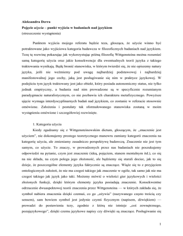 Aleksandra Derra Pojęcie użycia – punkt wyjścia w badaniach nad językiem (streszczenie wystąpienia) Punktem wyjścia mojego referatu będzie teza, głosząca, że użycie winno być potraktowane jako wyjściowa kategoria badawcza w filozoficznych badaniach nad językiem. Tezę tę rozwinę pokazując jak wykorzystując późną filozofię Wittgensteina można rozumieć samą kategorię użycia oraz jakie konsekwencje dla ewentualnych teorii języka z takiego traktowania wynikają. Będę bronić stanowiska, w którym twierdzi się, że nie opiszemy natury języka, jeśli nie weźmiemy pod uwagę najbardziej podstawowej i najbardziej manifestowalnej jego cechy, jaką jest posługiwanie się nim w praktyce językowej. W podejściu tym język traktowany jest jako obiekt, który posiada autonomiczny status, nie tylko jednak empiryczny, a badania nad nim prowadzone są w specyficznie rozumianym paradygmacie naturalistycznym, co nie pozbawia ich charakteru metafizycznego. Powyższe ujęcie wymaga interdyscyplinarnych badań nad językiem, co zostanie w referacie stosownie omówione. Założenia i postulaty tak sformułowanego stanowiska zostaną w moim wystąpieniu omówione i szczegółowiej rozwinięte. 1. Kategoria użycia Kiedy zgadzamy się z Wittgensteinowskim dictum, głoszącym, że „znaczenie jest użyciem”, nie dokonujemy prostego teoretycznego manewru zamiany kategorii znaczenia na kategorię użycia, ale zmieniamy zasadniczo perspektywę badawczą. Znaczenie nie jest tym samym, co użycie. To znaczy, w prowadzonych przez nas badaniach nie poszukujemy odpowiedzi na pytanie, czym jest znaczenie (ideą, pojęciem, stanem mentalnym itd.), co się na nie składa, na czym polega jego złożoność, ale będziemy się starali dociec, jak to się dzieje, że poszczególne elementy języka faktycznie są znaczące. Wiąże się to z przyjęciem ontologicznych założeń, że nie ma czegoś takiego jak znaczenie w ogóle, tak samo jak nie ma czegoś takiego jak język jako taki. Możemy mówić o wielości gier językowych i wielości złożonych funkcji, dzięki którym elementy języka posiadają znaczenie. Konsekwentne odrzucenie dwuaspektowej teorii znaczenia przez Wittgensteina — w których zakłada się, że symbol nabiera znaczenia dzięki czemuś, co go „ożywia” (nazywanego często treścią czy sensem), sam bowiem symbol jest jedynie czymś fizycznym (napisem, dźwiękiem) — prowadzi do postawienia tezy, zgodnie z którą nie istnieje „coś zewnętrznego, pozajęzykowego”, dzięki czemu językowe napisy czy dźwięki są znaczące. Posługiwanie się 1 kategorią użycia w naszej teorii pozwala oddać złożoność funkcji języka także dlatego, że nie próbuje się w niej wyróżnić jego funkcji istotowej. To znaczy takiej najbardziej podstawowej czy kluczowej jego własności, którą ten musiałby posiadać, by być językiem. Wbrew dość ogólnemu metodologicznemu zaleceniu Wittgensteina niebudowania teorii filozoficznych na wzór teorii naukowych, filozoficzne analizy języka można konkretyzować w postaci określonych teorii znaczenia, należy tylko dodać, na wzór jakiej nauki, a tym samym zgodnie z jaką metodologią, budujemy nasze teorie. Będę starała się pokazać, że Wittgenstein miał rację, że formułowanie teorii filozoficznych, tak jak się to robi w naukach przyrodniczych, jest zgubną metodologiczną ścieżką filozofii. Powiedzmy w tym miejscu tylko tyle, że traktowanie znaczenia jako kategorii tylko psychologicznej czy sprowadzanie badania znaczenia tylko do porównań językoznawczych oddala nas od pytań ogólnego, filozoficznego rodzaju. Rozważania gramatyczne prowadzone przez Wittgensteina można rozumieć jako abstrakcyjne rozważania teoretyczne, odwołujące się do faktycznych użyć tylko jako do ilustracji stawianych w nich hipotez. W ten sposób bronimy autonomicznego charakteru języka bez popadania w platonizm ontologiczny, w którym przypisuje się znaczeniom specyficzne, niefizyczne istnienie, oraz bez popadania w taki rodzaj racjonalizmu, gdzie język jest traktowany jako obiekt idealny, badany w oderwaniu od konkretnego, codziennego jego użycia. 2. Status ontologiczny przedmiotu badań. Trudno filozofowi uniknąć odpowiedzi na pytanie, czym jest obiekt, jaki bada on, uprawiając filozofię języka. Jaki jest jego status ontologiczny? Za pomocą jakich narzędzi mamy do niego dostęp? Innymi słowy, czym jest to, co określamy mianem „język” w przeprowadzanych przez nas analizach? Jeżeli przyjmiemy, że język może być badany z różnych perspektyw, pozostaje pytanie o to, jaki charakter ma obiekt, któremu powyżej wymienione własności zostają przypisane. Czy mowa tutaj o języku, jakim posługuje się pojedynczy użytkownik języka, o specyficznym idiolekcie, który poza własnościami wyróżniającymi go spośród innych idiolektów, posiada także własności wspólne wszystkim idiolektom? Czy raczej, mówiąc o komunikatywnej funkcji języka, bierzemy pod uwagę język, jaki daje się wyabstrahować ze wszystkich badanych idiolektów, jakiś abstrakt językowy, rodzaj języka publicznego? Czy język, który nie posiadałby funkcji komunikowania, automatycznie przestawałby być językiem w powyższym ujęciu? Czy bierzemy tutaj pod uwagę jakiś konkretny język etniczny — posługujemy się wszak przykładami z konkretnego języka, najczęściej indoeuropejskiego — czy zakładamy raczej, 2 że istnieje coś wspólnego wszystkim językom, co sprawia, że możemy badać jakiś język uniwersalny? Czy pisząc „język”, mamy na myśli zbiór znaczących już dźwięków lub napisów, czy raczej same te dźwięki lub napisy, które potencjalnie mogą stać się znaczące? Wymienione powyżej pytania, choć po części dosyć szczegółowe, nie są błahe. We wszystkich tego rodzaju pytaniach mamy do czynienia z podstawową trudnością badaczy języka, a mianowicie, z problemem ustalenia