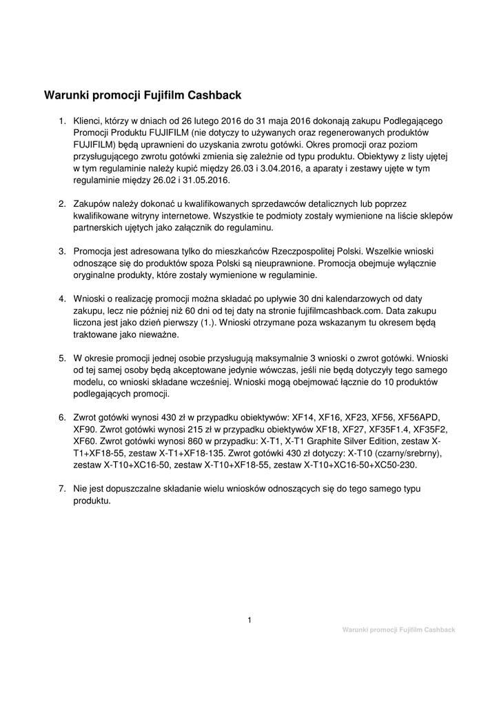 Warunki promocji Fujifilm Cashback 1. Klienci, którzy w dniach od 26 lutego 2016 do 31 maja 2016 dokonają zakupu Podlegającego Promocji Produktu FUJIFILM (nie dotyczy to używanych oraz regenerowanych produktów FUJIFILM) będą uprawnieni do uzyskania zwrotu gotówki. Okres promocji oraz poziom przysługującego zwrotu gotówki zmienia się zależnie od typu produktu. Obiektywy z listy ujętej w tym regulaminie należy kupić między 26.03 i 3.04.2016, a aparaty i zestawy ujęte w tym regulaminie między 26.02 i 31.05.2016. 2. Zakupów należy dokonać u kwalifikowanych sprzedawców detalicznych lub poprzez kwalifikowane witryny internetowe. Wszystkie te podmioty zostały wymienione na liście sklepów partnerskich ujętych jako załącznik do regulaminu. 3. Promocja jest adresowana tylko do mieszkańców Rzeczpospolitej Polski. Wszelkie wnioski odnoszące się do produktów spoza Polski są nieuprawnione. Promocja obejmuje wyłącznie oryginalne produkty, które zostały wymienione w regulaminie. 4. Wnioski o realizację promocji można składać po upływie 30 dni kalendarzowych od daty zakupu, lecz nie później niż 60 dni od tej daty na stronie fujifilmcashback.com. Data zakupu liczona jest jako dzień pierwszy (1.). Wnioski otrzymane poza wskazanym tu okresem będą traktowane jako nieważne. 5. W okresie promocji jednej osobie przysługują maksymalnie 3 wnioski o zwrot gotówki. Wnioski od tej samej osoby będą akceptowane jedynie wówczas, jeśli nie będą dotyczyły tego samego modelu, co wnioski składane wcześniej. Wnioski mogą obejmować łącznie do 10 produktów podlegających promocji. 6. Zwrot gotówki wynosi 430 zł w przypadku obiektywów: XF14, XF16, XF23, XF56, XF56APD, XF90. Zwrot gotówki wynosi 215 zł w przypadku obiektywów XF18, XF27, XF35F1.4, XF35F2, XF60. Zwrot gotówki wynosi 860 w przypadku: X-T1, X-T1 Graphite Silver Edition, zestaw XT1+XF18-55, zestaw X-T1+XF18-135. Zwrot gotówki 430 zł dotyczy: X-T10 (czarny/srebrny), zestaw X-T10+XC16-50, zestaw X-T10+XF18-55, zestaw X-T10+XC16-50+XC50-230. 7. Nie jest dopuszczalne składanie wielu wniosków odnoszących się do tego samego typu produktu. 1 Warunki promocji Fujifilm Cashback 8. Aby wypełnić wniosek należy wprowadzić swoje dane osobowe oraz informacje o zakupie obejmujące: ● Dowód zakupu w postaci faktury lub paragonu wyraźnie wskazujące na datę zakupu, sprzedawcę detalicznego oraz Produkt Podlegający Promocji ● Zdjęcie numeru seryjnego Produktu Podlegającego Promocji, który jest umieszczony na pudełku lub opakowaniu produktu ● W przypadku zakupów online wymagany także będzie dokument dostawy Po przedłożeniu wniosku zgłaszający otrzymuje e-mail z potwierdzeniem. 9. W przypadku poprawnego przedłożenia wniosku, zgłaszający otrzymuje zwrot gotówki na wskazane konto bankowe w ciągu 14 dni kalendarzowych od zatwierdzenia wniosku. Nie są dostępne żadne alternatywne formy realizacji promocji. 10. FUJIFILM będzie informować klientów w przypadku przedłożenia niekompletnych zgłoszeń. Powiadomienia o brakujących elementach zgłoszenia będą przesyłane e-mailem. Klienci będą mieli możliwość poprawienia błędów w ciągu 7 dni kalendarzowych od otrzymania e-maila. 11. Niekompletne, sfałszowane, zmienione lub nieczytelne zgłoszenia będą odrzucane przez FUJIFILM. FUJIFILM zastrzega sobie prawo do zażądania przedstawienia oryginalnego dowodu zakupu. Jeśli wnioskujący zostanie poproszony o przesłanie dowodu zakupu pocztą, wówczas dowód zakupu zostanie mu później zwrócony. 12. Jeśli nastąpi odmowa realizacji wniosku ze względu na niespełnienie kryteriów, to decyzja podjęta przez organizatora promocji jest ostateczna. FUJIFILM zastrzega sobie prawo do wycofania, modyfikacji lub zakończenia promocji bez uprzedzenia. 13. Złożony wniosek zostanie unieważniony, jeśli Produkty Podlegające Promocji zostaną zwrócone do sklepu w celu uzyskania refundacji lub wymiany na inny sprzęt. 14. FUJIFILM nie ponosi odpowiedzialności za awarie i błędy sprzętowe, techniczne, software’owe, związane z serwerami i witrynami internetowymi, będące poza kontrolą prowadzącego promocję, ani za ich skutki, nawet gdyby sytuacje te uniemożliwiały klientom uczestnictwo w promocji. 15. Adres e-mail przeznaczony do korespondencji to: [email protected]; we wszelkiej korespondencji należy podać unikalne ID wnioskującego przedstawione podczas procesu składania wniosku. Więcej informacji można uzyskać na stronie "Kontakt" udostępnionej w niniejszej witrynie internetowej. Adres podmiotu prowadzącego promocję: Fujifilm Europe GmbH Oddział w Polsce. Prosimy nie wysyłać żadnych zgłoszeń na ten adres. 2 Warunki promocji Fujifilm Cashback ZAŁĄCZNIK Lista sklepów partnerskich: Nazwa Miasto ulica FOTOLAND - EXTREME CHORZÓW Wolności 5 FOTOPANORAMA Kraków Westerplatte 18 FOTOS Łańcut Rynek 10 FOTOHURT RZESZÓW Rejtana 1 FOTOZAKUPY.PL TARNOWSKIE GÓRY Krakowska 2 CENTRUM FOTOGRAFII - PIOTR GRZYB TARNÓW Przecznica Strusińska 6 E-OKO WARSZAWA Puławska 10 lok 32 FOTOFORMA WARSZAWA Stacja Metro Centrum lok. 2009b, Plac Defilad 1, 00-110 INTERFOTO WARSZAWA ul. Targowa 20A PROCLUB WARSZAWA Żytnia 15 FOTO-MASTER WROCŁAW Odrzańska 24-29/2 NOTOPSTRYK.PL WROCŁAW Kościerzyńska 10 Lista sieci partnerskich: AB FOTO EURO RTC AGD FOTOJOKER X-KOM CYFROWE.PL FOTO-PLUS SKLEP BEZ NAZWY DIGITAL24.PL 3 Warunki promocji Fujifilm Cashback