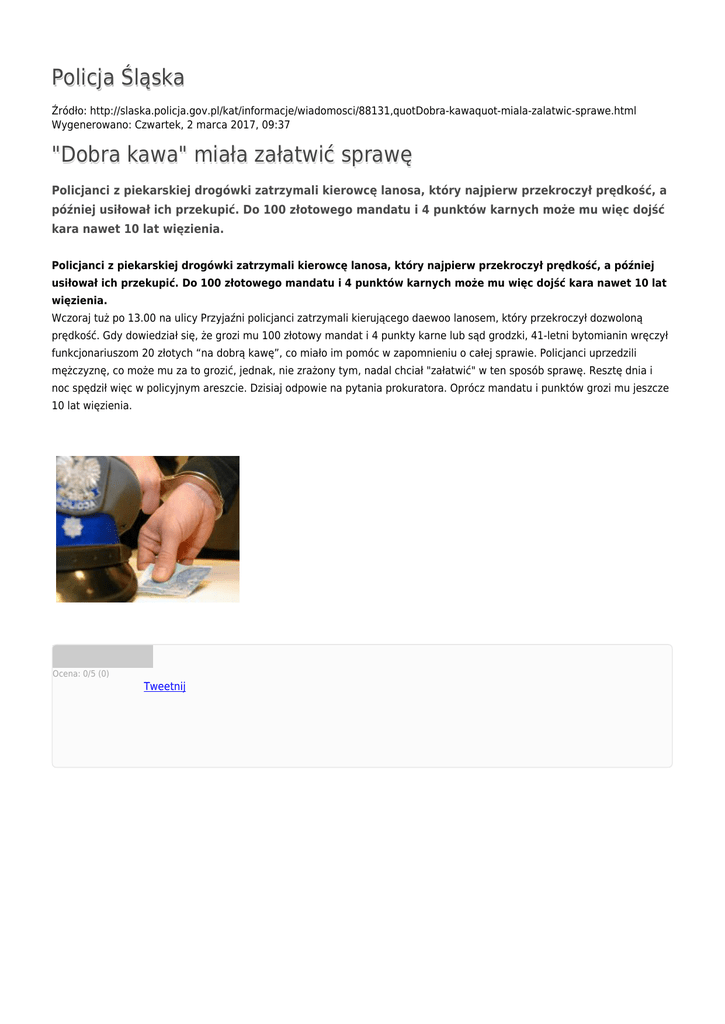 Policja Śląska Źródło: http://slaska.policja.gov.pl/kat/informacje/wiadomosci/88131,quotDobra-kawaquot-miala-zalatwic-sprawe.html Wygenerowano: Czwartek, 2 marca 2017, 09:37 "Dobra kawa" miała załatwić sprawę Policjanci z piekarskiej drogówki zatrzymali kierowcę lanosa, który najpierw przekroczył prędkość, a później usiłował ich przekupić. Do 100 złotowego mandatu i 4 punktów karnych może mu więc dojść kara nawet 10 lat więzienia. Policjanci z piekarskiej drogówki zatrzymali kierowcę lanosa, który najpierw przekroczył prędkość, a później usiłował ich przekupić. Do 100 złotowego mandatu i 4 punktów karnych może mu więc dojść kara nawet 10 lat więzienia. Wczoraj tuż po 13.00 na ulicy Przyjaźni policjanci zatrzymali kierującego daewoo lanosem, który przekroczył dozwoloną prędkość. Gdy dowiedział się, że grozi mu 100 złotowy mandat i 4 punkty karne lub sąd grodzki, 41-letni bytomianin wręczył funkcjonariuszom 20 złotych “na dobrą kawę”, co miało im pomóc w zapomnieniu o całej sprawie. Policjanci uprzedzili mężczyznę, co może mu za to grozić, jednak, nie zrażony tym, nadal chciał "załatwić" w ten sposób sprawę. Resztę dnia i noc spędził więc w policyjnym areszcie. Dzisiaj odpowie na pytania prokuratora. Oprócz mandatu i punktów grozi mu jeszcze 10 lat więzienia. Ocena: 0/5 (0) Tweetnij