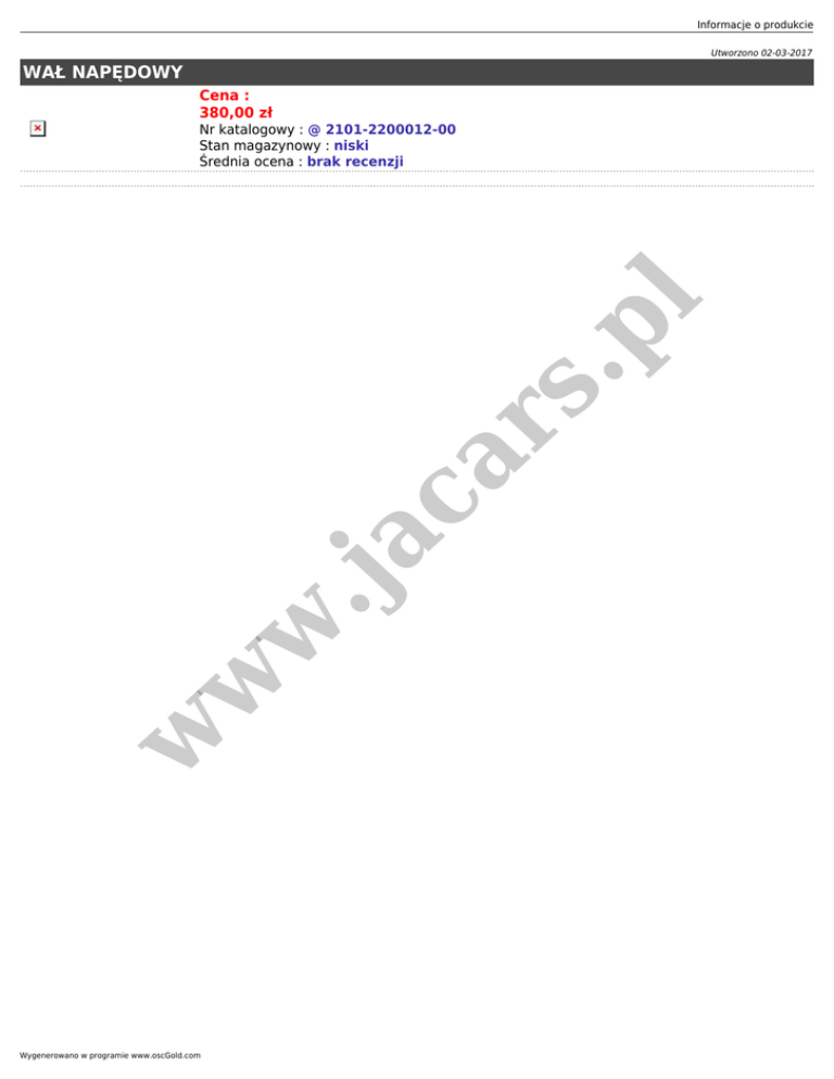 Informacje o produkcie Utworzono 02-03-2017 WAŁ NAPĘDOWY Cena : 380,00 zł w w w .ja ca rs .p l Nr katalogowy : @ 2101-2200012-00 Stan magazynowy : niski Średnia ocena : brak recenzji Wygenerowano w programie www.oscGold.com
