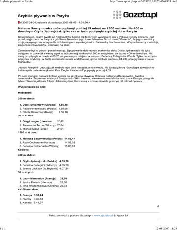 Szybkie pływanie w ParyŜu 1z1 http://www.sport.pl/sport/2029020,65025,4364903.html Szybkie pływanie w ParyŜu rl 2007-08-04, ostatnia aktualizacja 2007-08-05 17:01:26.0 Mateusz Sawrymowicz znów popłynął poniŜej 15 minut na 1500 metrów. Na 400 m dowolnym Otylia Jędrzejczak tylko raz w Ŝyciu popłynęła szybciej niŜ w ParyŜu Sawrymowicz, mistrz świata na 1500 metrów będzie teŜ faworytem wyścigu za rok w Pekinie. Cztery dni temu - tuŜ przed przyjazdem do ParyŜa z gór Sierra Nevada - jego trener Mirosław Drozd mówił "Gazecie", Ŝe jego zawodnicy czują się wymęczeni nowym dla nich treningiem wysokogórskim. Parametry biochemiczne, którymi trenerzy kontrolują zmęczenie zawodników, wariowały na skali. Zawodnicy byli w górach ponad miesiąc. Zgrupowanie dało jednak znakomity efekt. Otylia Jędrzejczak nie tylko osiągnęła w czwartek świetny wynik w jej koronnej konkurencji 200 m motylkiem, ale teŜ na 400 m dowolnym. Na metę przypłynęła w czasie 4,05.20, na pierwszym miejscu ex aequo z Federicą Pellegrini w Włoch. Tylko raz w Ŝyciu popłynęła szybciej - w finale mistrzostw świata w Melbourne, gdzie zdobyła srebro (4,04,23), przegrywając z Laure Manaudou. Jednak Pelegrini i Jędrzejczak nie były tego dnia najszybsze na świecie. Na toczących się równolegle zawodach w Indianapolis dwie Amerykanki: Kate Ziegler i Katie Hoff popłynęły poniŜej 4,05. Po serii kontuzji i operacji kolana wróciła do szybkiego pływania 19-letnia Katarzyna Baranowska, świetna zmiennistka. Trzykrotna mistrzyni Europy na krótkim basenie, wielokrotna medalistka mistrzostw Europy, przegrała tylko z Włoszką Alessią Filippi i Ukrainką Janą Kłoczkową w czasie niewiele gorszym niŜ rekord Ŝyciowy. Wyniki trzeciego dnia: MęŜczyźni: 200 m st mot: 1. Denis Syliantiew (Ukraina) 1.55,48 2. Paweł Korzeniowski (Polska) 1.55,98 3. Nikołaj Skworcow (Rosja) 1.56,18 50 m st klas: 1. Oleg Lisogor (Ukraina) 27,62 2. Alessandro Terrin (Włochy) 27,84 3. Michael Malul (Izrael) 27,94 1500 m st dow: 1. Mateusz Sawrymowicz (Polska) 14.56,47 2. Ryan Cocherane (Kanada) 3. Federico Colbertaldo (Włochy) Kobiety: 14.59,02 15.03,61 400 m st dow: 1. Otylia Jędrzejczak (Polska) 4.05,20 1. Federica Pellegrini (Włochy) 4.05,20 3. Joanne Jackson (W.Brytania) 4.07,24 50 m st grzb: 1. Laure Manaudou (Francja) 28,50 2. Janine Pietsch (Niemcy) 28,60 3. Irina Amszennikowa (Ukraina) 28,73 4x100 m st dow: 1. Francja 3.39,24 2. Niemcy 3.39,53 3. Kanada 3.41,07 rl Tekst pochodzi z portalu Gazeta.pl - www.gazeta.pl © Agora SA 12-08-2007 11:24