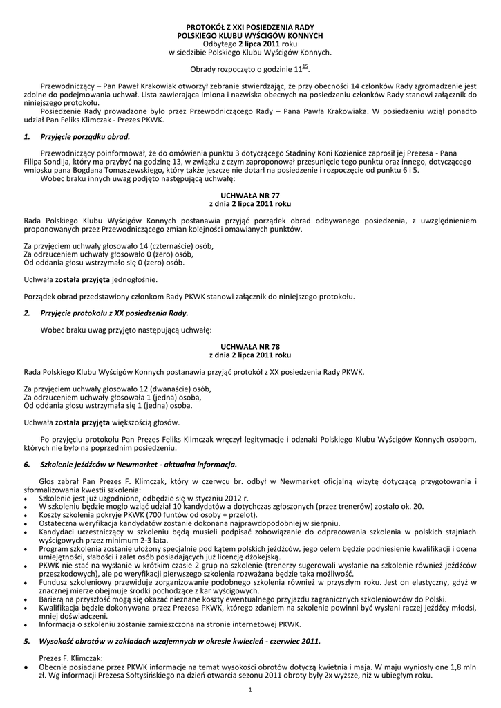 PROTOKÓŁ Z XXI POSIEDZENIA RADY POLSKIEGO KLUBU WYŚCIGÓW KONNYCH Odbytego 2 lipca 2011 roku w siedzibie Polskiego Klubu Wyścigów Konnych. 15 Obrady rozpoczęto o godzinie 11 . Przewodniczący – Pan Paweł Krakowiak otworzył zebranie stwierdzając, że przy obecności 14 członków Rady zgromadzenie jest zdolne do podejmowania uchwał. Lista zawierająca imiona i nazwiska obecnych na posiedzeniu członków Rady stanowi załącznik do niniejszego protokołu. Posiedzenie Rady prowadzone było przez Przewodniczącego Rady – Pana Pawła Krakowiaka. W posiedzeniu wziął ponadto udział Pan Feliks Klimczak - Prezes PKWK. 1. Przyjęcie porządku obrad. Przewodniczący poinformował, że do omówienia punktu 3 dotyczącego Stadniny Koni Kozienice zaprosił jej Prezesa - Pana Filipa Sondija, który ma przybyd na godzinę 13, w związku z czym zaproponował przesunięcie tego punktu oraz innego, dotyczącego wniosku pana Bogdana Tomaszewskiego, który także jeszcze nie dotarł na posiedzenie i rozpoczęcie od punktu 6 i 5. Wobec braku innych uwag podjęto następującą uchwałę: UCHWAŁA NR 77 z dnia 2 lipca 2011 roku Rada Polskiego Klubu Wyścigów Konnych postanawia przyjąd porządek obrad odbywanego posiedzenia, z uwzględnieniem proponowanych przez Przewodniczącego zmian kolejności omawianych punktów. Za przyjęciem uchwały głosowało 14 (czternaście) osób, Za odrzuceniem uchwały głosowało 0 (zero) osób, Od oddania głosu wstrzymało się 0 (zero) osób. Uchwała została przyjęta jednogłośnie. Porządek obrad przedstawiony członkom Rady PKWK stanowi załącznik do niniejszego protokołu. 2. Przyjęcie protokołu z XX posiedzenia Rady. Wobec braku uwag przyjęto następującą uchwałę: UCHWAŁA NR 78 z dnia 2 lipca 2011 roku Rada Polskiego Klubu Wyścigów Konnych postanawia przyjąd protokół z XX posiedzenia Rady PKWK. Za przyjęciem uchwały głosowało 12 (dwanaście) osób, Za odrzuceniem uchwały głosowała 1 (jedna) osoba, Od oddania głosu wstrzymała się 1 (jedna) osoba. Uchwała została przyjęta większością głosów. Po przyjęciu protokołu Pan Prezes Feliks Klimczak wręczył legitymacje i odznaki Polskiego Klubu Wyścigów Konnych osobom, których nie było na poprzednim posiedzeniu. 6. Szkolenie jeźdźców w Newmarket - aktualna informacja. Głos zabrał Pan Prezes F. Klimczak, który w czerwcu br. odbył w Newmarket oficjalną wizytę dotyczącą przygotowania i sformalizowania kwestii szkolenia: Szkolenie jest już uzgodnione, odbędzie się w styczniu 2012 r. W szkoleniu będzie mogło wziąd udział 10 kandydatów a dotychczas zgłoszonych (przez trenerów) zostało ok. 20. Koszty szkolenia pokryje PKWK (700 funtów od osoby + przelot). Ostateczna weryfikacja kandydatów zostanie dokonana najprawdopodobniej w sierpniu. Kandydaci uczestniczący w szkoleniu będą musieli podpisad zobowiązanie do odpracowania szkolenia w polskich stajniach wyścigowych przez minimum 2-3 lata. Program szkolenia zostanie ułożony specjalnie pod kątem polskich jeźdźców, jego celem będzie podniesienie kwalifikacji i ocena umiejętności, słabości i zalet osób posiadających już licencję dżokejską. PKWK nie stad na wysłanie w krótkim czasie 2 grup na szkolenie (trenerzy sugerowali wysłanie na szkolenie również jeźdźców przeszkodowych), ale po weryfikacji pierwszego szkolenia rozważana będzie taka możliwośd. Fundusz szkoleniowy przewiduje zorganizowanie podobnego szkolenia również w przyszłym roku. Jest on elastyczny, gdyż w znacznej mierze obejmuje środki pochodzące z kar wyścigowych. Barierą na przyszłośd mogą się okazad nieznane koszty ewentualnego przyjazdu zagranicznych szkoleniowców do Polski. Kwalifikacja będzie dokonywana przez Prezesa PKWK, którego zdaniem na szkolenie powinni byd wysłani raczej jeźdźcy młodsi, mniej doświadczeni. Informacja o szkoleniu zostanie zamieszczona na stronie internetowej PKWK. 5. Wysokośd obrotów w zakładach wzajemnych w okresie kwiecieo - czerwiec 2011. Prezes F. Klimczak: Obecnie posiadane przez PKWK informacje na temat wysokości obrotów dotyczą kwietnia i maja. W maju wyniosły one 1,8 mln zł. Wg informacji Prezesa Sołtysioskiego na dzieo otwarcia sezonu 2011 obroty były 2x wyższe, niż w ubiegłym roku. 1 Prezes Klimczak na ostatnim spotkaniu z przedstawicielami zarządu TS został poinformowany, że TS podjął decyzję o podpisaniu umów o współpracy z całą siecią bukmacherską (Totolotek, E-Toto), co dałoby możliwośd znacznego podwyższenia obrotów. Przekazał informację do Prezesa TS o konieczności poprawienia systemu gry, dostosowania jej do liczby koni w gonitwie, kumulacji gry itd. Do spotkania z przedstawicielami spółki Traf do tej pory nie doszło (zrezygnował ze stanowiska dotychczasowy jej Prezes). Wnioski z własnych obserwacji podczas pobytu na wyścigach - obroty na poszczególne gry są bardzo słabe. Oczekiwana przez TS renegocjacja umowy dzierżawy uzależniona jest od przedstawionej przez TS i Traf strategii rozwoju zakładów wzajemnych. Na razie nieznane są konkretne posunięcia mające na celu realizację tej strategii. Na torze obroty nie mają szans na znaczący wzrost, jedyną szansą na to jest rozbudowa sieci. W Trafie nie ma osób, które rozumieją rynek gier na wyścigi a ponadto jej pracownicy nie chcą słuchad sugestii tych, którzy się na tym znają. Niezrozumiała jest sytuacja, w której TS, jako właściciel wyniku, od 3 lat nie stara się swoimi działaniami wyjśd z roli głównego sponsora wyścigów i rozpocząd współpracę z profesjonalną firmą bukmacherską (firmami), która zapewni rozwój zakładów i przychody z nich dla TS. Pan W. Bąkowski: W tym roku obroty w stosunku do zeszłego są o ok. 10% wyższe. Rosną obroty głównie na gry proste. Opracowane zostały strategie wyścigów (TS) i zakładów wzajemnych (Traf), które mają zmienid podejście i poprawid motywację do podnoszenia obrotów. So