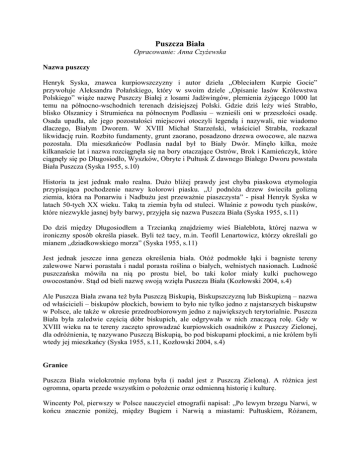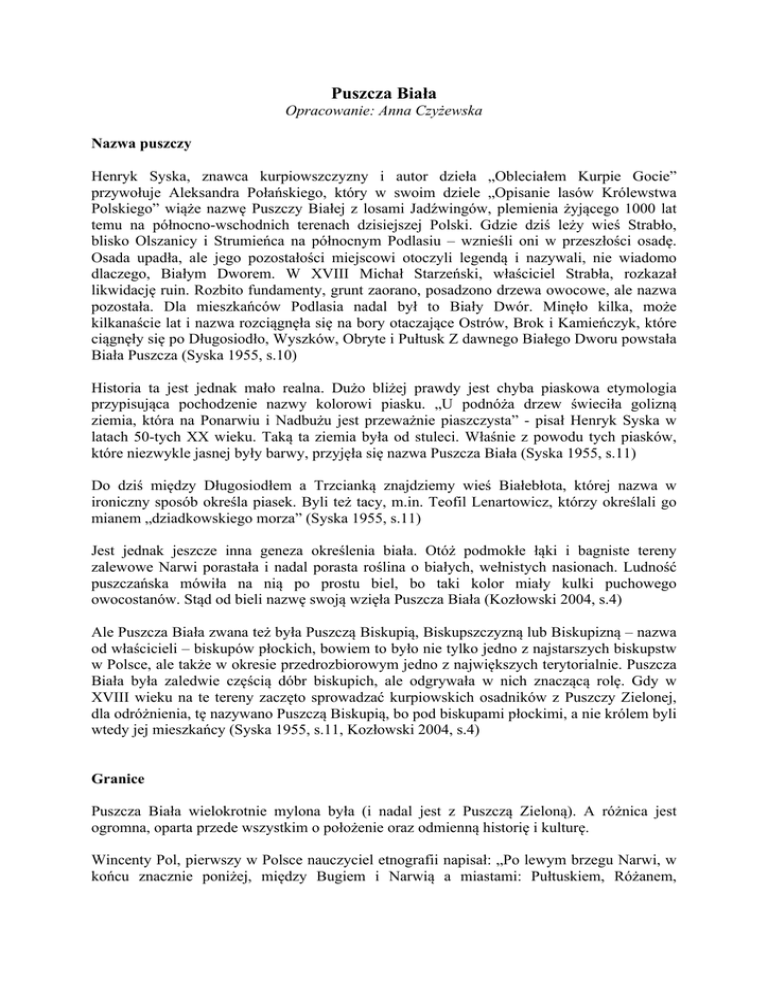 Puszcza Biała Opracowanie: Anna Czyżewska Nazwa puszczy Henryk Syska, znawca kurpiowszczyzny i autor dzieła „Obleciałem Kurpie Gocie” przywołuje Aleksandra Połańskiego, który w swoim dziele „Opisanie lasów Królewstwa Polskiego” wiąże nazwę Puszczy Białej z losami Jadźwingów, plemienia żyjącego 1000 lat temu na północno-wschodnich terenach dzisiejszej Polski. Gdzie dziś leży wieś Strabło, blisko Olszanicy i Strumieńca na północnym Podlasiu – wznieśli oni w przeszłości osadę. Osada upadła, ale jego pozostałości miejscowi otoczyli legendą i nazywali, nie wiadomo dlaczego, Białym Dworem. W XVIII Michał Starzeński, właściciel Strabła, rozkazał likwidację ruin. Rozbito fundamenty, grunt zaorano, posadzono drzewa owocowe, ale nazwa pozostała. Dla mieszkańców Podlasia nadal był to Biały Dwór. Minęło kilka, może kilkanaście lat i nazwa rozciągnęła się na bory otaczające Ostrów, Brok i Kamieńczyk, które ciągnęły się po Długosiodło, Wyszków, Obryte i Pułtusk Z dawnego Białego Dworu powstała Biała Puszcza (Syska 1955, s.10) Historia ta jest jednak mało realna. Dużo bliżej prawdy jest chyba piaskowa etymologia przypisująca pochodzenie nazwy kolorowi piasku. „U podnóża drzew świeciła golizną ziemia, która na Ponarwiu i Nadbużu jest przeważnie piaszczysta” - pisał Henryk Syska w latach 50-tych XX wieku. Taką ta ziemia była od stuleci. Właśnie z powodu tych piasków, które niezwykle jasnej były barwy, przyjęła się nazwa Puszcza Biała (Syska 1955, s.11) Do dziś między Długosiodłem a Trzcianką znajdziemy wieś Białebłota, której nazwa w ironiczny sposób określa piasek. Byli też tacy, m.in. Teofil Lenartowicz, którzy określali go mianem „dziadkowskiego morza” (Syska 1955, s.11) Jest jednak jeszcze inna geneza określenia biała. Otóż podmokłe łąki i bagniste tereny zalewowe Narwi porastała i nadal porasta roślina o białych, wełnistych nasionach. Ludność puszczańska mówiła na nią po prostu biel, bo taki kolor miały kulki puchowego owocostanów. Stąd od bieli nazwę swoją wzięła Puszcza Biała (Kozłowski 2004, s.4) Ale Puszcza Biała zwana też była Puszczą Biskupią, Biskupszczyzną lub Biskupizną – nazwa od właścicieli – biskupów płockich, bowiem to było nie tylko jedno z najstarszych biskupstw w Polsce, ale także w okresie przedrozbiorowym jedno z największych terytorialnie. Puszcza Biała była zaledwie częścią dóbr biskupich, ale odgrywała w nich znaczącą rolę. Gdy w XVIII wieku na te tereny zaczęto sprowadzać kurpiowskich osadników z Puszczy Zielonej, dla odróżnienia, tę nazywano Puszczą Biskupią, bo pod biskupami płockimi, a nie królem byli wtedy jej mieszkańcy (Syska 1955, s.11, Kozłowski 2004, s.4) Granice Puszcza Biała wielokrotnie mylona była (i nadal jest z Puszczą Zieloną). A różnica jest ogromna, oparta przede wszystkim o położenie oraz odmienną historię i kulturę. Wincenty Pol, pierwszy w Polsce nauczyciel etnografii napisał: „Po lewym brzegu Narwi, w końcu znacznie poniżej, między Bugiem i Narwią a miastami: Pułtuskiem, Różanem, Ostrowią, Brokiem i Wyszkowem leży puszcza z dawna Białą Puszczą zwana, częścią w ziemi różańskiej, częścią w łomżyńskiej położna” (za Syska 1955, s.40) „Brzegi Narwi i Pełty były już na początku XIII wieku zasiane licznymi osadami, drobnymi zapewne które wymieniają przywilej Konrada Ks. Mazowieckiego z 1203 roku potwierdzający posiadłości Biskupów Płockich” pisał w „Słowniku Geograficznym” Bronisław Chlebowki. Wymienia też istniejących już w tamtym czasie 17 miejscowości, m.in. Obryte, Bartodzieje, Psary, Drwały, Brańszczyk, Tuchlin, Udrzynek, Naguszewo. Osadnictwo z terenu Puszczy Białej wyprzedza osadnictwo z Puszczy Zielonej o dobrych kilkaset lat (za Syska 1955, s.35). Natomiast w latach sześćdziesiątych XX wieku Maria Żywirska na podstawie prowadzonych przez siebie badań etnograficznych wyznaczyła granicę regionu Puszczy Białej. Na południu opiera się ona o Bug. Zaczynając od Wyszkowa biegnie w górę rzeki. Na wschodzie pomiędzy Gliną i Małkinią odrywa się obejmując Błędnicę, Sumiężne, Kacpury i przez Biel dochodzi do Ostrowi Mazowieckiej. Stąd biegnie na północy przez Sielce, Długosiodło, Rzańce, Wólkę Grodzową Nową Wieś do Narwi. Dalej idzie w dół jej lewym brzegiem. Z prawego brzegu obejmuje jedynie Pułtusk. W okolicach Grabowca odrywa się od rzeki i biegnie przez Grabowiec, Borsuki, Drwały, w pobliżu Zator, Woli Mystkowskiej i Mostowca, do Wyszkowa (Żywirska 1967, s.195). Bardzo bym chciała, aby tutaj była mapka regionu. Mieszkańcy Puszczy Białej Anna Kutrzeba Pojnarowa oraz Maria Żywirska pisały w latach 60-tych XX wieku, że urodzajne ziemie na prawym brzegu Narwi zostały wykarczowane i zasiedlone wcześniej niż ziemie na jej lewym brzegu. „Obszar zaś leżący w widłach Narwi i Bugu, karczowany powoli, dawał przeważnie ziemie lekkie, wymagające wiele pracy, a dające mało plonów. Były to przeważnie szczyrki i mady przeplatane sapem, na których z trudem udawało się żyto i okopowizny”. W XIV wieku prawy brzeg Narwi posiadał wielkie połaci wykarczowanej ziemi, a lewy – gęste bory z rzadka poprzecinane małymi poletkami (Pojnarowa, Żywirska 1969, s.193). Link do nazwy – że mało żyzne gleby i piaski między Narwią a Bugiem. Poddanych biskupstwa płockiego, do których należał obszar Puszczy Białej, mieszkających po obu brzegach Narwi (mimo że jedni mieszkali na ziemiach żyznych, drudzy nie), obejmowały te same przepisy prawne. Jednakże urodzajność gleb narzucała konieczność położenia większego nacisku na rozwój gospodarki rolnej i jej uprzywilejowanie, a we wsiach z lewego brzegu, sąsiadujących z puszczą biskupią, większą opieką władz cieszyli się ludzie leśni uprawiający bartnictwo czy łowiectwo, zatrudnieni