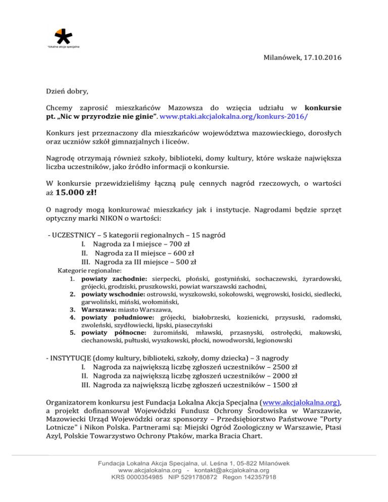 Milanówek, 17.10.2016 Dzień dobry, Chcemy zaprosić mieszkańców Mazowsza do wzięcia udziału w konkursie pt. „Nic w przyrodzie nie ginie”. www.ptaki.akcjalokalna.org/konkurs-‐‑2016/ Konkurs jest przeznaczony dla mieszkańców województwa mazowieckiego, dorosłych oraz uczniów szkół gimnazjalnych i liceów. Nagrodę otrzymają również szkoły, biblioteki, domy kultury, które wskaże największa liczba uczestników, jako źródło informacji o konkursie. W konkursie przewidzieliśmy łączną pulę cennych nagród rzeczowych, o wartości aż 15.000 zł! O nagrody mogą konkurować mieszkańcy jak i instytucje. Nagrodami będzie sprzęt optyczny marki NIKON o wartości: -‐‑ UCZESTNICY – 5 kategorii regionalnych – 15 nagród I. Nagroda za I miejsce – 700 zł II. Nagroda za II miejsce – 600 zł III. Nagroda za III miejsce – 500 zł Kategorie regionalne: 1. powiaty zachodnie: sierpecki, płoński, gostyniński, sochaczewski, żyrardowski, grójecki, grodziski, pruszkowski, powiat warszawski zachodni, 2. powiaty wschodnie: ostrowski, wyszkowski, sokołowski, węgrowski, łosicki, siedlecki, garwoliński, miński, wołomiński, 3. Warszawa: miasto Warszawa, 4. powiaty południowe: grójecki, białobrzeski, kozienicki, przysuski, radomski, zwoleński, szydłowiecki, lipski, piaseczyński 5. powiaty północne: żuromiński, mławski, przasnyski, ostrołęcki, makowski, ciechanowski, pułtuski, wyszkowski, płocki, nowodworski, legionowski -‐‑ INSTYTUCJE (domy kultury, biblioteki, szkoły, domy dziecka) – 3 nagrody I. Nagroda za największą liczbę zgłoszeń uczestników – 2500 zł II. Nagroda za największą liczbę zgłoszeń uczestników – 2000 zł III. Nagroda za największą liczbę zgłoszeń uczestników – 1500 zł Organizatorem konkursu jest Fundacja Lokalna Akcja Specjalna (www.akcjalokalna.org), a projekt dofinansował Wojewódzki Fundusz Ochrony Środowiska w Warszawie, Mazowiecki Urząd Wojewódzki oraz sponsorzy – Przedsiębiorstwo Państwowe "Porty Lotnicze" i Nikon Polska. Partnerami są: Miejski Ogród Zoologiczny w Warszawie, Ptasi Azyl, Polskie Towarzystwo Ochrony Ptaków, marka Bracia Chart. Fundacja Lokalna Akcja Specjalna, ul. Leśna 1, 05-822 Milanówek www.akcjalokalna.org - [email protected] KRS 0000354985 NIP 5291780872 Regon 142357918 Jakie jest zadanie uczestników? 1. Zarejestrować się pod własnym Nickiem na stronie: www.ptaki.akcjalokalna.org/konkurs-‐‑2016/ 2. Jeśli o konkursie dowiedzieli się od lokalnej instytucji kultury – podać jej nazwę 3. Śledzić naszą stronę i odpowiadać na pytania – jest ich 12 4. Pytania będą publikowane od 28 października do 20 listopada 5. Najlepsi z każdej kategorii regionalnej przejdą do Finału… i zawalczą o nagrody. Jakie jest zadanie instytucji kultury? 1. Rozpowszechnić informację o konkursie – można umieścić ją na stronie internetowej szkoły, wydrukować plakat i powiesić na tablicy szkolnej, przekazać informację o konkursie nauczycielom i rodzicom. 2. Informować, że wypełnienie ostatniego punktu w formularzu rejestracyjnym zwiększa szansę na nagrodę w kategorii Instytucje. Serwis internetowy konkursu Specjalnie na potrzeby konkursu został utworzony serwis internetowy -‐‑ www.ptaki.akcjalokalna.org/konkurs-‐‑2016/ Znajdą tam Państwo wszystkie informacje o konkursie, regulamin, bieżące informacje, a przede wszystkim będą tam zamieszczane pytania konkursowe. Prosimy o pomoc w promocji konkursu wśród mieszkańców Państwa gminy i prosimy o kontakt w przypadku jakichkolwiek pytań. Z wyrazami szacunku, Anna Grzegorzewska Prezes Fundacji tel. 508 358 308 mail. [email protected] Fundacja Lokalna Akcja Specjalna, ul. Leśna 1, 05-822 Milanówek www.akcjalokalna.org - [email protected] KRS 0000354985 NIP 5291780872 Regon 142357918