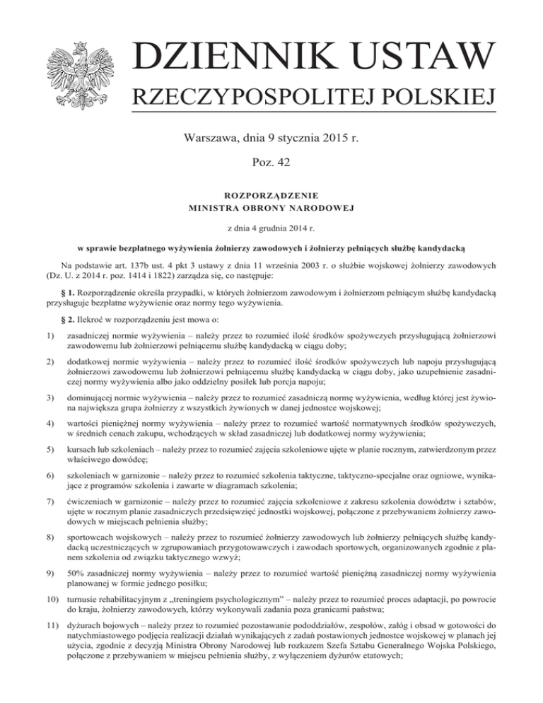 DZIENNIK USTAW RZECZYPOSPOLITEJ POLSKIEJ Warszawa, dnia 9 stycznia 2015 r. Poz. 42 ROZPORZĄDZENIE MINISTRA OBRONY NARODOWEJ z dnia 4 grudnia 2014 r. w sprawie bezpłatnego wyżywienia żołnierzy zawodowych i żołnierzy pełniących służbę kandydacką Na podstawie art. 137b ust. 4 pkt 3 ustawy z dnia 11 września 2003 r. o służbie wojskowej żołnierzy zawodowych (Dz. U. z 2014 r. poz. 1414 i 1822) zarządza się, co następuje: § 1. Rozporządzenie określa przypadki, w których żołnierzom zawodowym i żołnierzom pełniącym służbę kandydacką przysługuje bezpłatne wyżywienie oraz normy tego wyżywienia. § 2. Ilekroć w rozporządzeniu jest mowa o: 1) zasadniczej normie wyżywienia – należy przez to rozumieć ilość środków spożywczych przysługującą żołnierzowi zawodowemu lub żołnierzowi pełniącemu służbę kandydacką w ciągu doby; 2) dodatkowej normie wyżywienia – należy przez to rozumieć ilość środków spożywczych lub napoju przysługującą żołnierzowi zawodowemu lub żołnierzowi pełniącemu służbę kandydacką w ciągu doby, jako uzupełnienie zasadniczej normy wyżywienia albo jako oddzielny posiłek lub porcja napoju; 3) dominującej normie wyżywienia – należy przez to rozumieć zasadniczą normę wyżywienia, według której jest żywiona największa grupa żołnierzy z wszystkich żywionych w danej jednostce wojskowej; 4) wartości pieniężnej normy wyżywienia – należy przez to rozumieć wartość normatywnych środków spożywczych, w średnich cenach zakupu, wchodzących w skład zasadniczej lub dodatkowej normy wyżywienia; 5) kursach lub szkoleniach – należy przez to rozumieć zajęcia szkoleniowe ujęte w planie rocznym, zatwierdzonym przez właściwego dowódcę; 6) szkoleniach w garnizonie – należy przez to rozumieć szkolenia taktyczne, taktyczno-specjalne oraz ogniowe, wynikające z programów szkolenia i zawarte w diagramach szkolenia; 7) ćwiczeniach w garnizonie – należy przez to rozumieć zajęcia szkoleniowe z zakresu szkolenia dowództw i sztabów, ujęte w rocznym planie zasadniczych przedsięwzięć jednostki wojskowej, połączone z przebywaniem żołnierzy zawodowych w miejscach pełnienia służby; 8) sportowcach wojskowych – należy przez to rozumieć żołnierzy zawodowych lub żołnierzy pełniących służbę kandydacką uczestniczących w zgrupowaniach przygotowawczych i zawodach sportowych, organizowanych zgodnie z planem szkolenia od związku taktycznego wzwyż; 9) 50% zasadniczej normy wyżywienia – należy przez to rozumieć wartość pieniężną zasadniczej normy wyżywienia planowanej w formie jednego posiłku; 10) turnusie rehabilitacyjnym z „treningiem psychologicznym” – należy przez to rozumieć proces adaptacji, po powrocie do kraju, żołnierzy zawodowych, którzy wykonywali zadania poza granicami państwa; 11) dyżurach bojowych – należy przez to rozumieć pozostawanie pododdziałów, zespołów, załóg i obsad w gotowości do natychmiastowego podjęcia realizacji działań wynikających z zadań postawionych jednostce wojskowej w planach jej użycia, zgodnie z decyzją Ministra Obrony Narodowej lub rozkazem Szefa Sztabu Generalnego Wojska Polskiego, połączone z przebywaniem w miejscu pełnienia służby, z wyłączeniem dyżurów etatowych; Dziennik Ustaw –2– Poz. 42 12) dyżurach ratowniczych – należy przez to rozumieć planowe pozostawanie w gotowości wydzielonych sił i środków, zgodnie z decyzją Ministra Obrony Narodowej lub rozkazem Szefa Sztabu Generalnego Wojska Polskiego, w celu udzielenia pomocy załogom statków powietrznych, jednostek pływających lub udziału specjalistycznych grup ratowniczych w identyfikacji i likwidacji zdarzeń związanych z uwolnieniem toksycznych środków przemysłowych lub wypadków radiacyjnych i likwidacji ich skutków; 13) zgrupowaniach wojskowych – należy przez to rozumieć każdą formę zgromadzenia sił i środków wojska, powołaną decyzją Ministra Obrony Narodowej lub rozkazem Szefa Sztabu Generalnego Wojska Polskiego, Dowódcy Generalnego Rodzajów Sił Zbrojnych, Dowódcy Operacyjnego Rodzajów Sił Zbrojnych, Dowódcy Garnizonu Warszawa, Szefa Inspektoratu Wsparcia Sił Zbrojnych albo Komendanta Głównego Żandarmerii Wojskowej, w celu realizacji określonego zadania; 14) stołówce wojskowej – należy przez to rozumieć obiekt stacjonarny lub polowy punkt żywienia zbiorowego żołnierzy zawodowych i żołnierzy pełniących służbę kandydacką oraz obiekt żywienia na okręcie, w którym przygotowuje się posiłki według zasadniczych i dodatkowych norm wyżywienia. § 3. 1. Żołnierzom zawodowym i żołnierzom pełniącym służbę kandydacką uprawnionym do bezpłatnego wyżywienia przysługuje ono według następujących norm wyżywienia: 1) zasadniczych: a) żołnierskiej – 010, b) szkolnej – 020, c) specjalnej – 030, d) operacyjnej – 040 lub 044; 2) dodatkowych: a) ogólnej – 110, b) chleba – 111, c) napoju – 160; 3) polowych paczkowanych: a) indywidualnej suchej – S, b) skoncentrowanej lądowej – PS-ląd, c) skoncentrowanej morskiej – PS-m. 2. Skład ilościowy i asortyment środków spożywczych zawartych w zasadniczych oraz dodatkowych normach wyżywienia, o których mowa w ust. 1 pkt 1 i 2, określa załącznik do rozporządzenia. 3. Skład ilościowy i asortyment środków spożywczych zawartych w polowych paczkowanych normach wyżywienia, o których mowa w ust. 1 pkt 3, określają przepisy wydane na podstawie art. 8 ust. 1 ustawy z dnia 12 września 2002 r. o normalizacji (Dz. U. Nr 169, poz. 1386, z późn. zm.1)). 4. Do pobierania próbek żywności w stołówce wojskowej, wydziela się codziennie, na każdy obiekt przygotowujący posiłki w ramach stosowanych norm wyżywienia, środki spożywcze o wartości pieniężnej 150% normy, o której mowa w ust. 1 pkt 2 lit. a. 5. Żołnierze zawodowi i żołnierze pełniący służbę kandydacką mogą otr