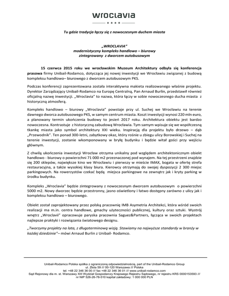 Tu gdzie tradycja łączy się z nowoczesnym duchem miasta „WROCLAVIA” modernistyczny kompleks handlowo – biurowy zintegrowany z dworcem autobusowym 15 czerwca 2015 roku we wrocławskim Muzeum Architektury odbyła się konferencja prasowa firmy Unibail-Rodamco, dotycząca jej nowej inwestycji we Wrocławiu związanej z budową kompleksu handlowo– biurowego z dworcem autobusowym PKS. Podczas konferencji zaprezentowana została interaktywna makieta realizowanego właśnie projektu. Dyrektor Zarządzający Unibail-Rodamco na Europę Centralną, Pan Arnaud Burlin, przedstawił również oficjalną nazwę inwestycji. „Wroclavia” to nazwa, która łączy w sobie nowoczesnego ducha miasta z historyczną atmosferą. Kompleks handlowo – biurowy „Wroclavia” powstaje przy ul. Suchej we Wrocławiu na terenie dawnego dworca autobusowego PKS, w samym centrum miasta. Koszt inwestycji wynosi 220 mln euro, a planowany termin ukończenia budowy to jesień 2017 roku. Architektura obiektu jest bardzo nowoczesna. Kontrastuje z historyczną zabudową Wrocławia. Tym samym wpisuje się we współczesną tkankę miasta jako symbol architektury XXI wieku. Inspiracją dla projektu było drzewo – dąb „Przewodnik”. Ten ponad 300-letni, zabytkowy okaz, który rośnie u zbiegu ulicy Borowskiej i Suchej na terenie inwestycji, zostanie wkomponowany w bryłę budynku i będzie witał gości przy wejściu głównym. Z chwilą ukończenia inwestycji Wrocław otrzyma unikalny pod względem architektonicznym obiekt handlowo - biurowy o powierzchni 71 000 m2 przeznaczonej pod wynajem. Na tej przestrzeni znajdzie się 200 sklepów, największe kino we Wrocławiu i pierwszy w mieście IMAX, bogata w ofertę strefa restauracyjna, a także wysokiej klasy biura. Kierowcy otrzymają do swojej dyspozycji 2 300 miejsc parkingowych. Na rowerzystów czekać będą miejsca parkingowe na zewnątrz jak i kryty parking w środku budynku. Kompleks „Wroclavia” będzie zintegrowany z nowoczesnym dworcem autobusowym o powierzchni 5000 m2. Nowy dworzec będzie przestronny, jasno oświetlony i łatwo dostępny zarówno z ulicy jak i kompleksu handlowo – biurowego. Obiekt został zaprojektowany przez polską pracownię IMB Asymetria Architekci, która wśród swoich realizacji ma m.in. centra handlowe, gmachy użyteczności publicznej, kultury oraz sztuki. Wystrój wnętrz „Wroclavii” opracowuje paryska pracownia Saguez&Partners, łącząca w swoich projektach najlepsze praktyki i rozwiązania światowego designu. „Tworzymy projekty na lata, z długoterminową wizją. Stawiamy na najwyższe standardy w branży w każdej dziedzinie”– mówi Arnaud Burlin z Unibail- Rodamco. Unibail-Rodamco Polska spółka z ograniczoną odpowiedzialnością, part of the Unibail-Rodamco Group ul. Złota 59 /// 00-120 Warszawa /// Polska tel. +48 22 346 36 00 /// fax +48 22 346 36 01 /// www.unibail-rodamco.com Sąd Rejonowy dla m. st. Warszawy XIII Wydział Gospodarczy Krajowego Rejestru Sądowego, nr rejestru KRS 0000153593 /// nr NIP 526-26-78-510 kapitał zakładowy: 1 000 000 PLN Informacje o inwestorze Unibail-Rodamco jest czołową, notowaną na giełdzie, europejską spółką inwestycyjną oraz developerską. Głównym obszarem działalności biznesowej Unibail-Rodamco są duże centra handlowe usytuowane w głównych stolicach i ośrodkach europejskich, a poza tym biura oraz centra konferencyjne i wystawowe, dotychczas realizowane we Francji. Obecnie Unibail-Rodamco jest właścicielem 82 najlepszych obiektów handlowych w największych miastach europejskich. Grupa skupia się na nieruchomościach komercyjnych wysokiej jakości, które odpowiadają zapotrzebowaniu klientów oraz aktualnym oczekiwaniom stawianym przez nowoczesną architekturę i zagospodarowanie urbanistyczne. Firma jest obecna w 12 krajach UE i dysponuje aktywami, których wartość na koniec 2014 roku wyniosła 34,6 miliardów euro. W Polsce do firmy Unibail-Rodamco należą m.in. warszawskie centra handlowe: Arkadia, Galeria Mokotów oraz Galeria Wileńska. Unibail-Rodamco jest również inwestorem w Złotych Tarasach. Więcej informacji o inwestorze www.unibail-rodamco.com Unibail-Rodamco Polska spółka z ograniczoną odpowiedzialnością, part of the Unibail-Rodamco Group ul. Złota 59 /// 00-120 Warszawa /// Polska tel. +48 22 346 36 00 /// fax +48 22 346 36 01 /// www.unibail-rodamco.com Sąd Rejonowy dla m. st. Warszawy XIII Wydział Gospodarczy Krajowego Rejestru Sądowego, nr rejestru KRS 0000153593 /// nr NIP 526-26-78-510 kapitał zakładowy: 1 000 000 PLN