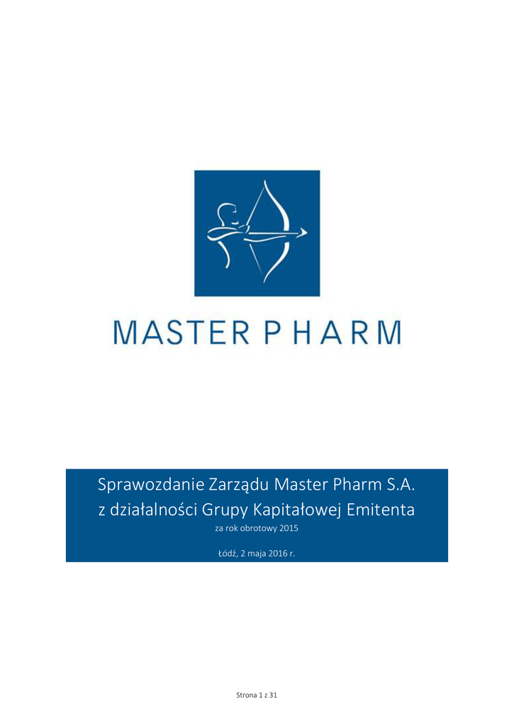 Sprawozdanie Zarządu Master Pharm S.A. z działalności Grupy Kapitałowej Emitenta za rok obrotowy 2015 Łódź, 2 maja 2016 r. Strona 1 z 31 SPRAWOZDANIE ZARZĄDU MASTER PHARM S.A. Z DZIAŁALNOŚCI GRUPY KAPITAŁOWEJ EMTIENTA ZA 2015 ROK Spis treści 1. List Prezesa Zarządu ................................................................ ................................................................................................ ................................................................................................ ................................................................................................ .......................................................................... .......................................... 4 2. Wybrane skonsolidowane dane finansowe ................................................................ ................................................................................................ ................................................................................................ ........................................................................ ........................................ 5 3. Podstawowe informacje na temat jednostki dominującej ................................................................ ................................................................................................ .................................................................................. .................................................. 6 4. Skład Rady Nadzorczej i Zarządu Master Pharm S.A................................. S.A................................................................. ................................................................................................ ........................................................................................... ........................................................... 6 5. Akcjonariat ................................................................ ................................................................................................ ................................................................................................ ................................................................................................ ........................................................................................ ........................................................ 6 6. Charakterystyka polityki w zakresie kierunków rozwoju Grupy Kapitałowej Emitenta ................................................................ ......................................................................... ......................................... 7 7. Omówienie podstawowych wielkości ekonomicznoekonomiczno-finansowych ujawnionych w rocznym sprawozdaniu finansowym....................... 8 8. Charakterystyka struktury aktywów i pasywów skonsolidowanego bilansu, w tym z punktu widzenia płynności Grupy Kapitałowej Emitenta ................................................................ ................................................................................................ ................................................................................................ ................................................................................................ ......................................................................................... ......................................................... 10 9. Opis istotnych pozycji pozabilansowych w ujęciu podmiotowym, przedmiotowym i wartościowym ................................................. ................................................. 12 10. Opis czynników i zdarzeń, w tym o nietypowym charakterze, mających znaczący wpływ na działalność Grupy Kapitałowej Emitenta i osiągnięte przez nią zyski lub poniesione straty wraz z ich oceną i określeniem stopnia ich wpływu na osiągnięty wynik .................. 12 11. Ważniejsze zdarzenia mające znaczący wpływ na działalność oraz wyniki finansowe Grupy Kapitałowej Emitenta w roku obrotowym lub których wpływ jest możliwy w następnych latach ................................................................ ................................................................................................ ....................................................................................... ....................................................... 13 12. Omówienie Omówienie perspektyw rozwoju działalności Emitenta w najbliższym roku obrotowym ................................................................ ................................................................... ................................... 13 13. Informacje o instrumentach finansowych ................................................................ ................................................................................................ ................................................................................................ ........................................................................ ........................................ 13 14. Wskazanie postępowań toczących się przed sądem, organem właściwym dla postępowania arbitrażowego lub organem administracji publicznej publicznej ................................................................ ................................................................................................ ................................................................................................ ................................................................................................ ........................................................................................ ........................................................ 14 15. Informacje o podstawowych produktach, towarach lub usługach wraz z ich określeniem wartościowym i ilościowym oraz udziałem udziałem poszczeg