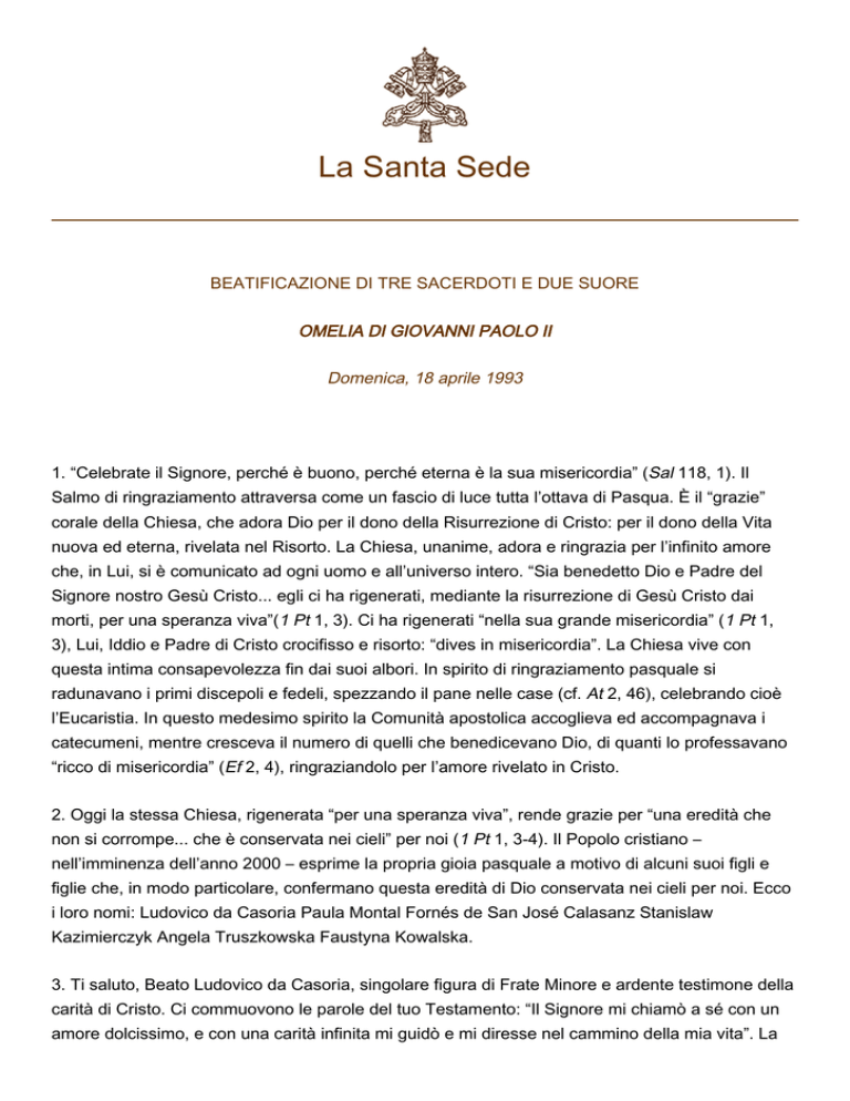 La Santa Sede BEATIFICAZIONE DI TRE SACERDOTI E DUE SUORE OMELIA DI GIOVANNI PAOLO II Domenica, 18 aprile 1993 1. “Celebrate il Signore, perché è buono, perché eterna è la sua misericordia” (Sal 118, 1). Il Salmo di ringraziamento attraversa come un fascio di luce tutta l’ottava di Pasqua. È il “grazie” corale della Chiesa, che adora Dio per il dono della Risurrezione di Cristo: per il dono della Vita nuova ed eterna, rivelata nel Risorto. La Chiesa, unanime, adora e ringrazia per l’infinito amore che, in Lui, si è comunicato ad ogni uomo e all’universo intero. “Sia benedetto Dio e Padre del Signore nostro Gesù Cristo... egli ci ha rigenerati, mediante la risurrezione di Gesù Cristo dai morti, per una speranza viva”(1 Pt 1, 3). Ci ha rigenerati “nella sua grande misericordia” (1 Pt 1, 3), Lui, Iddio e Padre di Cristo crocifisso e risorto: “dives in misericordia”. La Chiesa vive con questa intima consapevolezza fin dai suoi albori. In spirito di ringraziamento pasquale si radunavano i primi discepoli e fedeli, spezzando il pane nelle case (cf. At 2, 46), celebrando cioè l’Eucaristia. In questo medesimo spirito la Comunità apostolica accoglieva ed accompagnava i catecumeni, mentre cresceva il numero di quelli che benedicevano Dio, di quanti lo professavano “ricco di misericordia” (Ef 2, 4), ringraziandolo per l’amore rivelato in Cristo. 2. Oggi la stessa Chiesa, rigenerata “per una speranza viva”, rende grazie per “una eredità che non si corrompe... che è conservata nei cieli” per noi (1 Pt 1, 3-4). Il Popolo cristiano – nell’imminenza dell’anno 2000 – esprime la propria gioia pasquale a motivo di alcuni suoi figli e figlie che, in modo particolare, confermano questa eredità di Dio conservata nei cieli per noi. Ecco i loro nomi: Ludovico da Casoria Paula Montal Fornés de San José Calasanz Stanislaw Kazimierczyk Angela Truszkowska Faustyna Kowalska. 3. Ti saluto, Beato Ludovico da Casoria, singolare figura di Frate Minore e ardente testimone della carità di Cristo. Ci commuovono le parole del tuo Testamento: “Il Signore mi chiamò a sé con un amore dolcissimo, e con una carità infinita mi guidò e mi diresse nel cammino della mia vita”. La 2 forza di questo amore spinse te, valido studioso e insegnante, a dedicarti ai più poveri: ai sacerdoti ammalati, agli immigrati africani, ai muti, ai ciechi, ai vecchi, agli orfanelli. Beato Ludovico, grande figlio della Chiesa di Napoli, hai fatto tuo il carisma di Francesco d’Assisi e l’hai vissuto nella società del tuo tempo, nel Meridione d’Italia del secolo scorso, assumendo attiva responsabilità nei confronti delle più gravi forme di povertà, calandoti con cristiana compassione nella concretezza della storia della tua gente e dei suoi drammi quotidiani. L’ampiezza del raggio d’azione del tuo apostolato ci lascia quasi increduli, e ci viene spontaneo domandarti: Come hai potuto farti prossimo a tante miserie, con tanta “fantasia” nella promozione umana? E ancora ci rispondono le tue parole: “L’amore di Cristo aveva ferito il mio cuore” (Testamento). Ti chiediamo di insegnare anche a noi a vivere per gli altri e ad essere costruttori di autentiche comunità ecclesiali, nelle quali la carità fiorisca in letizia ed in speranza operosa. “I poveri li avete sempre con voi” (Mt 26, 11), ci ha detto Gesù. Aiutaci, Beato Ludovico, a scoprirli, ad amarli, a servirli con quell’ardore che in te ha compiuto meraviglie. 4. La nueva beata, Paula Montal de San José de Calasanz, fue durante toda su vida un abnegado apóstol de la promoción cultural, humana y cristiana de la mujer. En total entrega a la voluntad de Dios y contando sólo “ con cuarenta reales en el bolsillo ” – como dice la historia – abrió la primera escuela de niñas para enseñarles, sobre todo, el amor de Dios y la dignidad de la mujer, como futura madre de familia. “ Quiero salvar las familias ”, repetía insistentemente. Con este objetivo fundó la congregación de Hijas de María, Religiosas de las Escuelas Pías, viviendo de lleno la espiritualidad calasancia y haciendo un cuarto voto de dedicarse exclusivamente a la enseñanza. El carisma de la beata Paula Montal vive en vosotras, amadas Religiosas Escolapias, y su exaltación hoy al honor de los altares representa una apremiante invitación que el Señor os dirige para que renovéis, como almas consagradas, vuestro fecundo servicio eclesial en fidelidad a su carisma, en favor de la dignidad de la mujer y de la familia. Quiera Dios que por su intercesión y ejemplo la acción educativa de la Iglesia con la niñez y la juventud reciba un decidido impulso, que dé nueva vitalidad a las raíces cristianas de la noble Nación española, representada aquí por un nutrido grupo de Obispos, Autoridades, sacerdotes, religiosos – particularmente Escolapios – religiosas y numerosos fieles, a quienes saludo con particular afecto. Ecco le parole del Papa in una nostra traduzione in italiano. 4. La nuova Beata, Paula Montal de San José de Calasanz, è stata per tutta la sua vita un generoso apostolo della promozione culturale, umana e cristiana della donna. In un dono totale alla volontà di Dio e con solo “quaranta reali nelle tasche” – come dice la storia – aprì la prima scuola per bambine per insegnar loro, soprattutto, l’amore di Dio e la dignità della donna, come futura madre di famiglia. “Voglio salvare le famiglie”, ripeteva insistentemente. Con questo obiettivo fondò la congregazione delle Figlie di Maria, Religiose delle Scuole Pie, vivendo pienamente la spiritualità di Calasanz e facendo un quarto voto di dedicarsi esclusivamente all’insegnamento. Il carisma della Beata Paula Montal vive in voi, amate Religiose Scolopie, e la sua elevazione oggi all’onore degli altari rappresenta una pressante esortazione che il Signore vi 3 rivolge affinché rinnoviate, come anime consacrate, il vostro fecondo servi