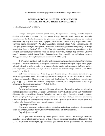 Jan Paweł II, Homilia wygłoszona w Fatimie 13 maja 1991 roku HOMILIA PODCZAS MSZY ŚW. ODPRAWIONEJ 13 MAJA NA PLACU PRZED SANKTUARIUM 1. „Oto Matka twoja" (J 19,27). Liturgia dzisiejsza roztacza przed nami, drodzy bracia i siostry, szeroki horyzont dziejów człowieka i świata. Poprzez słowa Księgi Rodzaju myśl wraca od początku wszechrzeczy do dzieła stworzenia. Od pierwszej księgi biblijnej przechodzimy do ostatniej, do Apokalipsy, aby wzrokiem wiary oglądać „niebo nowe i ziemię nową, bo pierwsze niebo i pierwsza ziemia przeminęły" (Ap 21, 1). A zatem: początek i kres, Alfa i Omega (Ap 21,6). Kres jest jednak nowym początkiem, albowiem stanowi wypełnienie wszystkiego w Bogu: „przybytek Boga z ludźmi" (Ap 21,3). Tak oto pomiędzy pierwszym początkiem a tym nowym, ostatecznym początkiem toczą się dzieje człowieka, którego Bóg stworzył „na swój obraz", jak o tym mówi Słowo Boże: „Stworzył więc Bóg człowieka na swój obraz, na obraz Boży go stworzył: stworzył mężczyznę i niewiastę" (Rdz 1,27). 2. W samym centrum tych dziejów człowieka i świata znajduje się krzyż Chrystusa na Golgocie. Człowiek stworzony mężczyzną i niewiastą odnajduje w tym krzyżu samą głębią własnej tajemnicy, która wyraża się w słowach Męża boleści skierowanych do Matki stojącej pod krzyżem: „Niewiasto, oto syn Twój"; a potem do umiłowanego ucznia: „Oto Matka twoja" (J 19, 26-27). Człowiek stworzony na obraz Boga jest koroną całego stworzenia. Zdumiony jego wielkością psalmista woła: „Uczyniłeś go niewiele mniejszym od istot niebieskich, chwałą i czcią go uwieńczyłeś. Obdarzyłeś go władzą nad dziełami rąk Twoich; złożyłeś wszystko pod jego stopy (...). O Panie, nasz Boże, (...) czym jest człowiek, że o nim pamiętasz, i czym - syn człowieczy, że się nim zajmujesz?" (Ps 8, 6-7.2.5.). Czymże jest człowiek? Pytanie psalmisty musi zabrzmieć jeszcze większym zdumieniem wobec tej tajemnicy, która znajduje swój szczyt na Golgocie: Czymże jest człowiek, skoro Słowo-Syn współistotny Ojcu stał się człowiekiem, Synem Człowieczym, rodząc się z Dziewicy Maryi za sprawą Ducha Świętego? Czymże jest człowiek... skoro ten sam Syn Boży, a zarazem prawdziwy Człowiek przyjął na siebie grzechy wszystkich ludzi i poniósł je na ołtarz krzyża jako Mąż boleści, jako Baranek Boży, który gładzi grzechy świata? Czymże jest człowiek? Zdumienie psalmisty nad tajemniczą wielkością człowieka, zrodzone z kontemplacji dzieła stworzenia, zostaje przewyższone w kontemplacji dzieła Odkupienia. Czymże jest człowiek? 3. Od początku ustanowiony został panem ziemi, panem widzialnego kosmosu. Jednakże jego wielkość nie wyraża się w tym tylko, że ziemię czyni sobie poddaną (por. Rdz l, 28). Wymiarem właściwym jego wielkości jest chwała Boża: jak napisze św. Ireneusz, „chwałą Bożą jest człowiek postawiony pośrodku świata stworzeń widzialnych i niewidzialnych, które wszystkie są przeniknięte chwałą Stwórcy: głoszą Jego chwałę. I tak, poprzez dzieje widzialnego (i niewidzialnego) kosmosu wznosi się jakby niezmierzona Świątynia, zarys wiecznego królestwa Boga. Człowiek - mężczyzna i kobieta od początku został postawiony pośrodku tej świątyni. On sam stał się centralnym jej wymiarem, prawdziwym „przybytkiem Boga z ludźmi", albowiem z miłości do człowieka Bóg wstąpił w stworzony wszechświat. Drodzy bracia, przybytek Boga z ludźmi osiąga swój szczyt w Chrystusie. On jest „nowym Jeruzalem" (por. Ap 21,2) wszystkich ludzi i ludów, bo wszyscy w Nim zostali wybrani do wiecznych przeznaczeń w Bogu. On też jest początkiem wiecznego królestwa Boga w dziejach człowieka, a królestwo to - w Nim i przez Niego - jest ostateczną rzeczywistością nieba i ziemi. Jest „nową ziemią i nowym niebem", w którym pierwsza ziemia i pierwsze niebo znajdą swe wypełnienie. 4. Świadczy o tym krzyż na Golgocie, który jest krzyżem naszego Odkupienia. W tym krzyżu opowiedziane są całe dzieje człowieka, a są to zarazem dzieje grzechu i cierpienia. Są naznaczone łzami i śmiercią, jak świadczy Księga Apokalipsy: ileż tych łez w ludzkich oczach, ileż żałoby, krzyku, trudu człowieczego! (por. Ap 21, 4). A u kresu ziemskiego bytowania - śmierć. To ona jest miarą przemijania „pierwszego nieba i pierwszej ziemi", naznaczonych dziedzictwem grzechu. Czyż nie taka jest prawda całej historii? Czyż nie potwierdza tej prawdy w sposób szczególny nasze stulecie, które przybliża się ku zakończeniu wraz z drugim milenium dziejów po Chrystusie? 5. Krzyż Chrystusa nie przestaje dawać o tym świadectwa! Równocześnie on jeden ten Chrystusowy krzyż - trwa poprzez dzieje człowieka jako znak pewności Odkupienia. Poprzez krzyż swojego Syna Bóg powtarza z pokolenia na pokolenie swoją prawdę o stworzeniu: „Oto czynię wszystko nowe" (Ap 21, 5). Pierwsze niebo i pierwsza ziemia wciąż przemijają. Pozostaje wobec nich Chrystus bezbronny, wyniszczony do ostatka w śmiertelnej kaźni, Syn Człowieczy ukrzyżowany! A jednocześnie nie przestaje On być znakiem zwycięskiej pewności życia. Przez Jego śmierć rzucone zostało w ziemię ziarno niezwyciężonej mocy nowego życia. Jego śmierć jest początkiem Zmartwychwstania. „Gdzież jest, o śmierci, twoje zwycięstwo? Gdzież jest, o śmierci, twój oścień? (l Kor 15, 55). Poprzez krzyż na Golgocie zstępuje od Boga w dzieje ludzkości, w dzieje każdego stulecia „Miasto Święte -Jeruzalem Nowe (...) jak oblubienica zdobna w klejnoty dla swego męża" (Ap 21,2). 6. Jako pielgrzym, poruszony do głębi serca przedziwnym planem stworzenia i zbawienia, który Bóg powziął, aby spełnić to wszystko, do czego nas powołał, podążam wraz z wami do Nowej Jerozolimy. Wzywam was, drodzy bracia i siostry, byście przyjęli łaskę i orędzie, w tym miejscu szczególnie namacalne i wyra