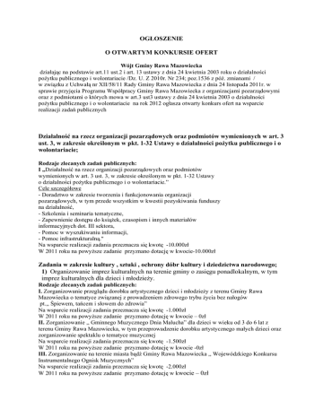 OGŁOSZENIE O OTWARTYM KONKURSIE OFERT Wójt Gminy Rawa Mazowiecka działając na podstawie art.11 ust.2 i art. 13 ustawy z dnia 24 kwietnia 2003 roku o działalności pożytku publicznego i wolontariacie /Dz. U. Z 2010r. Nr 234; poz.1536 z póź. zmianami / w związku z Uchwałą nr XII/58/11 Rady Gminy Rawa Mazowiecka z dnia 24 listopada 2011r. w sprawie przyjęcia Programu Współpracy Gminy Rawa Mazowiecka z organizacjami pozarządowymi oraz z podmiotami o których mowa w art.3 ust3 ustawy z dnia 24 kwietnia 2003 o działalności pożytku publicznego i o wolontariacie na rok 2012 ogłasza otwarty konkurs ofert na wsparcie realizacji zadań publicznych Działalność na rzecz organizacji pozarządowych oraz podmiotów wymienionych w art. 3 ust. 3, w zakresie określonym w pkt. 1-32 Ustawy o działalności pożytku publicznego i o wolontariacie; Rodzaje zlecanych zadań publicznych: I ,,Działalność na rzecz organizacji pozarządowych oraz podmiotów wymienionych w art. 3 ust. 3, w zakresie określonym w pkt. 1-32 Ustawy o działalności pożytku publicznego i o wolontariacie.” Cele szczegółowe - Doradztwo w zakresie tworzenia i funkcjonowania organizacji pozarządowych, w tym przede wszystkim w kwestii pozyskiwania funduszy na działalność, - Szkolenia i seminaria tematyczne, - Zapewnienie dostępu do książek, czasopism i innych materiałów informacyjnych dot. III sektora, - Pomoc w wyszukiwaniu informacji, - Pomoc infrastrukturalną." Na wsparcie realizacji zadania przeznacza się kwotę -10.000zł W 2011 roku na powyższe zadanie przyznano dotację w kwocie-10.000zł Zadania w zakresie kultury , sztuki , ochrony dóbr kultury i dziedzictwa narodowego; 1) Organizowanie imprez kulturalnych na terenie gminy o zasięgu ponadlokalnym, w tym imprez kulturalnych dla dzieci i młodzieży. Rodzaje zlecanych zadań publicznych: I. Zorganizowanie przeglądu dorobku artystycznego dzieci i młodzieży z terenu Gminy Rawa Mazowiecka o tematyce związanej z prowadzeniem zdrowego trybu życia bez nałogów pt.,, Śpiewem, tańcem i słowem do zdrowia” Na wsparcie realizacji zadania przeznacza się kwotę -1.000zł W 2011 roku na powyższe zadanie przyznano dotację w kwocie – 0zł II. Zorganizowanie ,, Gminnego Muzycznego Dnia Malucha” dla dzieci w wieku od 3 do 6 lat z terenu Gminy Rawa Mazowiecka, w tym przeprowadzenie dorobku artystycznego małych dzieci oraz zorganizowanie spektaklu o tematyce muzycznej Na wsparcie realizacji zadania przeznacza się kwotę -1.500zł W 2011 roku na powyższe zadanie przyznano dotację w kwocie -0zł III. Zorganizowanie na terenie miasta bądź Gminy Rawa Mazowiecka ,, Wojewódzkiego Konkursu Instrumentalnego Ognisk Muzycznych” Na wsparcie realizacji zadania przeznacza się kwotę -2.000zł W 2011 roku na powyższe zadanie przyznano dotację w kwocie – 0zł 2) Organizacja przedsięwzięć promocyjnych o charakterze ponadlokalnym w zakresie rozwoju kultury i ochrony dziedzictwa kulturowego, promocji twórczości i tradycji ludowej, edukacji i oświaty. Rodzaje zlecanych zadań publicznych: I . Zorganizowanie ,,VII Spotkań Zespołów i Kapel Ludowych na Majówce w Wilkowicach” mające na celu promowanie regionalnej kultury ludowej. Cele szczegółowe Wspieranie przedsięwzięcia w zakresie rozwoju kultury i dziedzictwa kulturowego, promocji twórczości kulturalnej i ludowej poprzez zorganizowanie spotkania w ramach którego odbędzie się przegląd i jarmark ludowy wspieranie amatorskiego ruchu artystycznego, twórczości ludowej, działania na rzecz odnowy i propagowania kultur ludowych, wspieranie wszelkich form edukacji kulturalnej dzieci i młodzieży . Na wsparcie realizacji zadania przeznacza się kwotę - 10.000zł W 2011 roku na powyższe zadanie przyznano dotację w kwocie-14.000zł II. Zorganizowanie jesiennego spotkania gawędziarzy ludowych Na wsparcie realizacji zadania przeznacza się kwotę - 1.000 zł W 2011 roku na powyższe zadanie przyznano dotację w kwocie-0 zł 2. Wysokość środków publicznych przyznanych na realizację zadań: Działalność na rzecz organizacji pozarządowych oraz podmiotów wymienionych w art. 3 ust. 3, w zakresie określonym w pkt. 1-32 Ustawy o działalności pożytku publicznego i o wolontariaciew sumie 10.000zł Zadania w zakresie kultury , sztuki , ochrony dóbr kultury i dziedzictwa narodowego- w sumie 15.500.00zł II. Zasady przyznawania dotacji: Dotacja zostanie przekazana zgodnie z przepisami ustawy z dnia 24 kwietnia 2003r. o działalności pożytku publicznego i o wolontariacie po podpisaniu stosownej umowy z wyłonionym oferentem, z zachowaniem następujących warunków: 1) Zadanie winno być przedmiotem działalności statutowej podmiotu ubiegającego się o dotację. 2) Zadanie nie może być realizowane przez podmiot niebędący stroną umowy. 3) Dotację na realizację zadań otrzymują podmioty, których oferty zostaną uznane za najkorzystniejsze i wybrane w postępowaniu konkursowym. 4) Dotacja jest przeznaczona na realizację zadań o których mowa w ogłoszeniu konkursowym. 5) Złożenie oferty o dotację nie gwarantuje przyznania środków w wysokości, o które występuje oferent. 6) Zlecenie realizacji zadania przez Gminę Rawa Mazowiecka nastąpi w trybie określonym w art. 11 ust. 1 pkt. 1 ustawy z dnia 24 kwietnia 2003r. o działalności pożytku publicznego i wolontariacie. 7) Szczegółowe i ostateczne warunki realizacji, finansowane i rozliczenia zadań reguluje umowa pomiędzy oferentem a Gminą Rawa Mazowiecka. III. Termin i warunki realizacji zadania: 1) Realizacja poszczególnych zadań obejmuje okres nie dłuższy niż od podpisania umowy do 31 grudnia 2012r. 2) Szczegółowe terminy i warunki realizacji zastaną określone każdorazowo w wiążącej strony umowie. 3) Podmiot składający ofertę na realizację zadania powinien posiadać niezbędne doświadczenie w organizacji tego typu zadań oraz zasoby rzeczowe w postaci bazy materialno – technicznej lub do