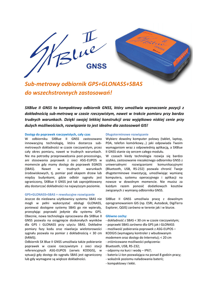 Sub-metrowy odbiornik GPS+GLONASS+SBAS do wszechstronnych zastosowań! SXBlue II GNSS to kompaktowy odbiornik GNSS, który umożliwia wyznaczanie pozycji z dokładnością sub-metrową w czasie rzeczywistym, nawet w trakcie pomiaru przy bardzo trudnych warunkach. Dzięki swojej lekkiej konstrukcji oraz wyjątkowo niskiej cenie przy dużych możliwościach, rozwiązanie to jest idealne dla zastosowań GIS! Dostęp do poprawek rzeczywistych, cały czas W odbiorniku SXBlue II GNSS zastosowano innowacyjną technologię, która dostarcza submetrowych dokładności w czasie rzeczywistym, przez cały okres pomiaru, nawet w trudnych warunkach. Nie ma potrzeby przeprowadzania post-processingu, ani stosowania poprawek z sieci ASG-EUPOS w momencie gdy mamy dostęp do poprawek EGNOS (SBAS). Nawet w trudnych warunkach środowiskowych, tj. pomiar pod okapem drzew lub między budynkami, gdzie odbiór sygnału jest ograniczony, SXBlue II GNSS jest tak zaprojektowany aby dostarczać dokładności na najwyższym poziomie. GPS+GLONASS+SBAS = rewolucyjne rozwiązanie Jeszcze do niedawna użytkownicy systemu SBAS nie mogli w pełni wykorzystać obsługi GLONASS, ponieważ dostępne systemy SBAS go nie wpierały, przesyłając poprawki jedynie dla systemu GPS. Obecnie, nowa technologia opracowana dla SXBlue II GNSS pozwala na osiągnięcie doskonałych wyników dla GPS i GLONASS przy użyciu SBAS. Dokładne pomiary fazy kodu oraz niwelacja wielotorowości sygnału pozwala na pomiar z dokładnością < 30 cm (hRMS). Odbiornik SX Blue II GNSS umożliwia także pobieranie poprawek w czasie rzeczywistym z sieci stacji referencyjnych ASG-EUPOS (serwis KODGIS), w sytuacji gdy dostęp do sygnału SBAS jest ograniczony lub gdy wymagane są większe dokładności. Długoterminowe rozwiązanie Wybierz dowolny komputer polowy (tablet, laptop, PDA, telefon komórkowy…) jaki odpowiada Twoim wymaganiom wraz z odpowiednią aplikacją, a SXBlue II GNSS stanie się sercem całego modułu. W czasach kiedy technologia rozwija się bardzo szybko, zastosowanie niezależnego odbiornika GNSS z uniwersalnymi rozwiązaniami komunikacyjnymi (Bluetooth, USB, RS-232) pozwala chronić Twoje długoterminowe inwestycję, umożliwiając wymianę komputera, systemu operacyjnego i aplikacji na nowsze w dowolnym momencie. Nie musisz za każdym razem ponosić dodatkowych kosztów związanych z wymianą odbiornika GNSS. SXBlue II GNSS umożliwia pracę z dowolnym oprogramowaniem GIS (np. ESRI, Autodesk, DigiTerra Explorer, QGIS) zarówno w terenie jak i w biurze. Główne cechy: - dokładność z SBAS < 30 cm w czasie rzeczywistym; - poprawki SBAS zarówno dla GPS jak i GLONASS - możliwość pobierania poprawek z ASG-EUPOS – KODGIS (wymagany kontroler z wbudowanym modemem oraz dostęp do Internetu); < 20 cm - zróżnicowane możliwości połączenia: Bluetooth, USB, RS-232; - odporny na kurz i wodę – IP67; - bateria Li-Ion pozwalająca na ponad 8 godzin pracy; - wskaźnik poziomu naładowania baterii; - kompaktowy i lekki. Jak to działa? Urządzenia SXBlue są niewielkie i pancerne, dzięki czemu zapewniają wygodę użytkowania. Odbiornik nosi się w wygodnym etui przy pasku, antenę montuje się w specjalnie przygotowanej czapce. Połączenie odbiornika z komputerem jest bezprzewodowe za pomocą Bluetooth. Wszelkie potrzebne akcesoria załączone są w zestawie. Opcjonalnie do zestawu można dokupić specjalny plecak. W plecaku znajduje się tyczka (zintegrowana z plecakiem) na której instalujemy antenę. Tyczka posiada możliwość regulacji wysokości. Antena posiada magnes który umożliwia jej umieszczenie np. na dachu samochodu. Cały zestaw (odbiornik + antena) jest bardzo lekki i umożliwia swobodną pracę w terenie. Mocna bateria wystarcza na 10 godzin pracy bez konieczności ładowania, a diody LED umieszczone w obudowie odbiornika pozwalają w pełni kontrolować jakość sygnału GPS oraz stan baterii. Należy podkreślić, że odbiornik SXBlue II GNSS nawet bez pobierania poprawek z serwisu ASG-EUPOS (KODGIS) zapewnia pomiar z dokładnością < 30 cm przy użyciu jedynie satelitarnych poprawek EGNOS (SBAS)! Specyfikacja odbiornika SXBlue II GNSS Odbiornik GNSS ------------------------------------- Środowisko ------------------------------------------ Typ odbiornika: Temperatura pracy: Temperatura przechowywania: Wilgotność: Normy: Kanały: Wsparcie SBAS: Częstotliwość odświeżania: Dokładność SBAS: Dokładność DGNSS: (z SBAS) Dokładność pozioma: (autonomiczna) Opcjonalnie RTCM: Opcjonalne L1 RTK Zimny start: Odzyskanie: Maksymalna prędkość: Maksymalna wysokość: L1/G1 GPS+GLONASS, wygładzanie fazowe 36 kanałów, równoległe śledzenie 3 kanały, równoległe śledzenie. EGNOS WAAS, MSAS, GAGAN i kompatybilne z SBAS. Do 10 Hz; opcjonalnie 20 Hz <30 cm HRMS <60 cm 2dRMS; 95% poziom ufności1 (<30 cm HRMS, <25 cm CEP) < 2.5 m 2dRMS, 95% poziom ufności (autonomiczna, bez SA)2 <20 cm 2dRMS, 95% poziom ufności3 1-3 cm + 1 ppm (poziomo) 1 2-6 cm + 1 ppm (pionowo) 1 60 s (bez almanachu lub RTC) <1s 1 850 km/h 18 288 m Właściwości mechaniczne -----------------------Materiał obudowy: Materiał obudowy baterii: Odporność na wodę i kurz: Zanurzenie: Wymiary obudowy: Waga: Złącza danych: Złącze anteny: Zakres częstotliwości: Zyskowność anteny: Napięcie anteny: Oporność anteny: Wymiary anteny: Waga anteny: Komunikacja ----------------------------------------Porty: Transmisjia Bluetooth: Częstotliwość Bluetooth: Rodzaj: Szybkość transmisji: Protokół I/O danych: Odniesienie danych wyjściowych: Bluetooth, RS-232C, USB 2.0 Klasa 1, zasięg typowy 1 250 m4 2.400 – 2.485 GHz Bluetooth 2.0 4800 do 57600 NMEA 183, RTCM 104, binarny Autonomiczne: WGS84 (G1150) SBAS: ITRF-2000 Pomiar surowych danych RAW: Zastrzeżony binarny (darmowe narzędzie RINEX) Protokół I/O poprawek: RTCM SC-104, opcjonalnie format zastrzeżony Status GPS LED - diody: Zasilanie, GNSS, pozycja DGPS, DIFF, połączenie 