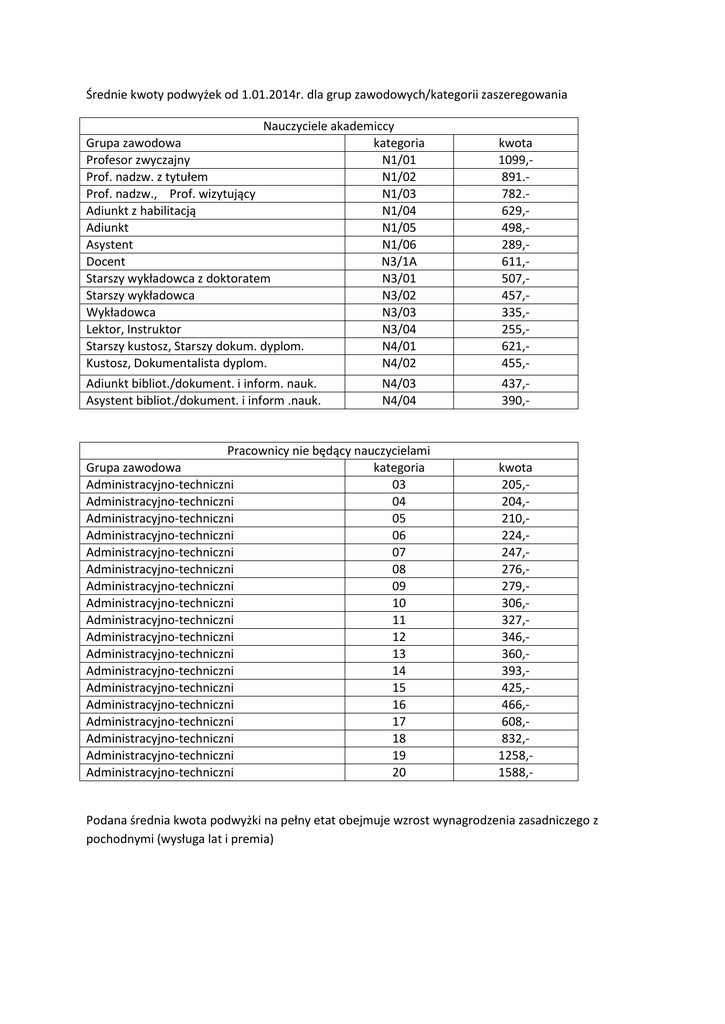 Średnie kwoty podwyżek od 1.01.2014r. dla grup zawodowych/kategorii zaszeregowania Nauczyciele akademiccy Grupa zawodowa kategoria Profesor zwyczajny N1/01 Prof. nadzw. z tytułem N1/02 Prof. nadzw., Prof. wizytujący N1/03 Adiunkt z habilitacją N1/04 Adiunkt N1/05 Asystent N1/06 Docent N3/1A Starszy wykładowca z doktoratem N3/01 Starszy wykładowca N3/02 Wykładowca N3/03 Lektor, Instruktor N3/04 Starszy kustosz, Starszy dokum. dyplom. N4/01 Kustosz, Dokumentalista dyplom. N4/02 kwota 1099,891.782.629,498,289,611,507,457,335,255,621,455,- Adiunkt bibliot./dokument. i inform. nauk. Asystent bibliot./dokument. i inform .nauk. 437,390,- N4/03 N4/04 Pracownicy nie będący nauczycielami Grupa zawodowa kategoria Administracyjno-techniczni 03 Administracyjno-techniczni 04 Administracyjno-techniczni 05 Administracyjno-techniczni 06 Administracyjno-techniczni 07 Administracyjno-techniczni 08 Administracyjno-techniczni 09 Administracyjno-techniczni 10 Administracyjno-techniczni 11 Administracyjno-techniczni 12 Administracyjno-techniczni 13 Administracyjno-techniczni 14 Administracyjno-techniczni 15 Administracyjno-techniczni 16 Administracyjno-techniczni 17 Administracyjno-techniczni 18 Administracyjno-techniczni 19 Administracyjno-techniczni 20 kwota 205,204,210,224,247,276,279,306,327,346,360,393,425,466,608,832,1258,1588,- Podana średnia kwota podwyżki na pełny etat obejmuje wzrost wynagrodzenia zasadniczego z pochodnymi (wysługa lat i premia)