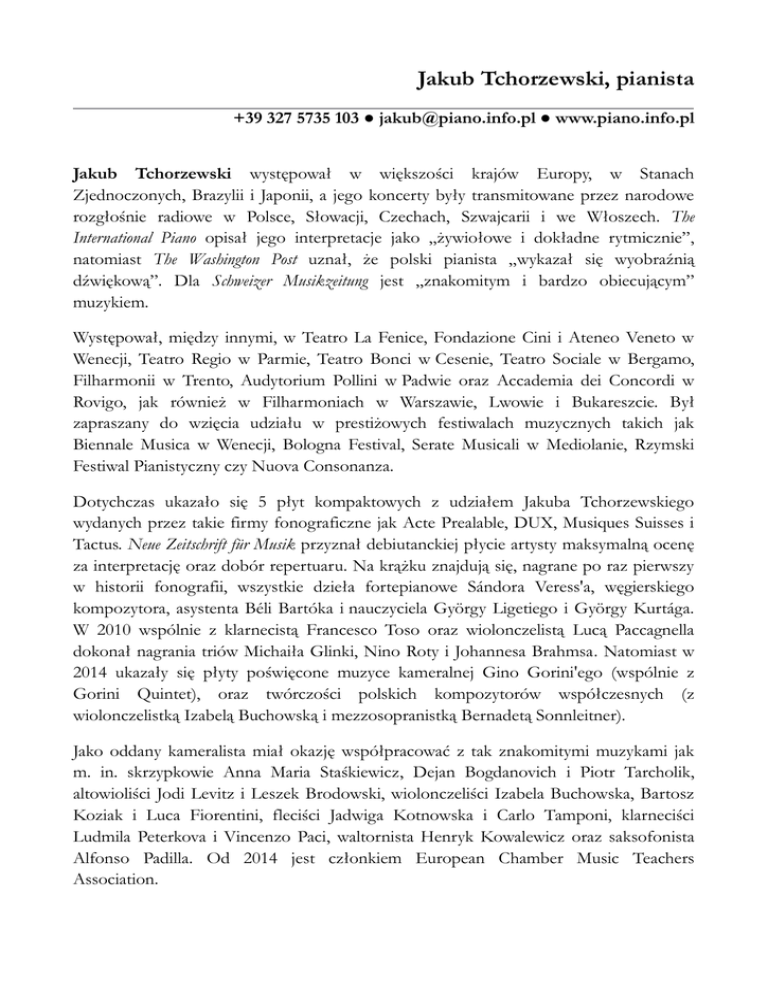 Jakub Tchorzewski, pianista +39 327 5735 103 ● [email protected] ● www.piano.info.pl Jakub Tchorzewski występował w większości krajów Europy, w Stanach Zjednoczonych, Brazylii i Japonii, a jego koncerty były transmitowane przez narodowe rozgłośnie radiowe w Polsce, Słowacji, Czechach, Szwajcarii i we Włoszech. The International Piano opisał jego interpretacje jako „żywiołowe i dokładne rytmicznie”, natomiast The Washington Post uznał, że polski pianista „wykazał się wyobraźnią dźwiękową”. Dla Schweizer Musikzeitung jest „znakomitym i bardzo obiecującym” muzykiem. Występował, między innymi, w Teatro La Fenice, Fondazione Cini i Ateneo Veneto w Wenecji, Teatro Regio w Parmie, Teatro Bonci w Cesenie, Teatro Sociale w Bergamo, Filharmonii w Trento, Audytorium Pollini w Padwie oraz Accademia dei Concordi w Rovigo, jak również w Filharmoniach w Warszawie, Lwowie i Bukareszcie. Był zapraszany do wzięcia udziału w prestiżowych festiwalach muzycznych takich jak Biennale Musica w Wenecji, Bologna Festival, Serate Musicali w Mediolanie, Rzymski Festiwal Pianistyczny czy Nuova Consonanza. Dotychczas ukazało się 5 płyt kompaktowych z udziałem Jakuba Tchorzewskiego wydanych przez takie firmy fonograficzne jak Acte Prealable, DUX, Musiques Suisses i Tactus. Neue Zeitschrift für Musik przyznał debiutanckiej płycie artysty maksymalną ocenę za interpretację oraz dobór repertuaru. Na krążku znajdują się, nagrane po raz pierwszy w historii fonografii, wszystkie dzieła fortepianowe Sándora Veress'a, węgierskiego kompozytora, asystenta Béli Bartóka i nauczyciela György Ligetiego i György Kurtága. W 2010 wspólnie z klarnecistą Francesco Toso oraz wiolonczelistą Lucą Paccagnella dokonał nagrania triów Michaiła Glinki, Nino Roty i Johannesa Brahmsa. Natomiast w 2014 ukazały się płyty poświęcone muzyce kameralnej Gino Gorini'ego (wspólnie z Gorini Quintet), oraz twórczości polskich kompozytorów współczesnych (z wiolonczelistką Izabelą Buchowską i mezzosopranistką Bernadetą Sonnleitner). Jako oddany kameralista miał okazję współpracować z tak znakomitymi muzykami jak m. in. skrzypkowie Anna Maria Staśkiewicz, Dejan Bogdanovich i Piotr Tarcholik, altowioliści Jodi Levitz i Leszek Brodowski, wiolonczeliści Izabela Buchowska, Bartosz Koziak i Luca Fiorentini, fleciści Jadwiga Kotnowska i Carlo Tamponi, klarneciści Ludmila Peterkova i Vincenzo Paci, waltornista Henryk Kowalewicz oraz saksofonista Alfonso Padilla. Od 2014 jest członkiem European Chamber Music Teachers Association.