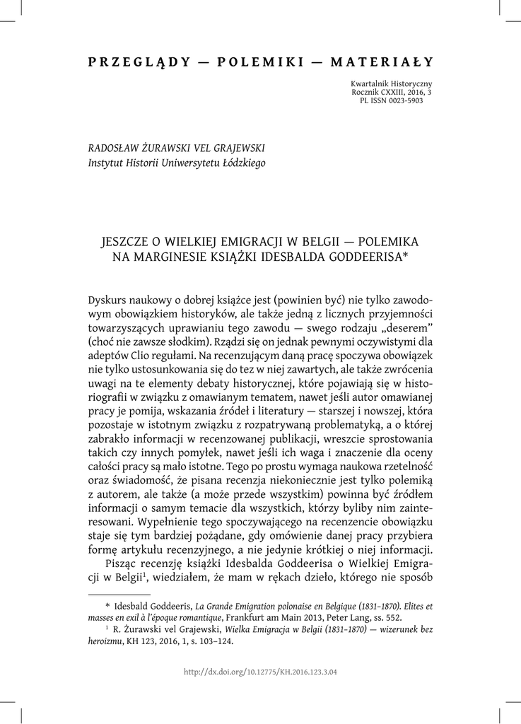 P R Z E G L Ą D Y — P O L E M I K I — M A T E R I A Ł Y Kwartalnik Historyczny Rocznik CXXIII, 2016, 3 PL ISSN 0023-5903 RADOSŁAW ŻURAWSKI VEL GRAJEWSKI Instytut Historii Uniwersytetu Łódzkiego JESZCZE O WIELKIEJ EMIGRACJI W BELGII — POLEMIKA NA MARGINESIE KSIĄŻKI IDESBALDA GODDEERISA* Dyskurs naukowy o dobrej książce jest (powinien być) nie tylko zawodowym obowiązkiem historyków, ale także jedną z licznych przyjemności towarzyszących uprawianiu tego zawodu — swego rodzaju „deserem” (choć nie zawsze słodkim). Rządzi się on jednak pewnymi oczywistymi dla adeptów Clio regułami. Na recenzującym daną pracę spoczywa obowiązek nie tylko ustosunkowania się do tez w niej zawartych, ale także zwrócenia uwagi na te elementy debaty historycznej, które pojawiają się w historiografii w związku z omawianym tematem, nawet jeśli autor omawianej pracy je pomija, wskazania źródeł i literatury — starszej i nowszej, która pozostaje w istotnym związku z rozpatrywaną problematyką, a o której zabrakło informacji w recenzowanej publikacji, wreszcie sprostowania takich czy innych pomyłek, nawet jeśli ich waga i znaczenie dla oceny całości pracy są mało istotne. Tego po prostu wymaga naukowa rzetelność oraz świadomość, że pisana recenzja niekoniecznie jest tylko polemiką z autorem, ale także (a może przede wszystkim) powinna być źródłem informacji o samym temacie dla wszystkich, którzy byliby nim zainteresowani. Wypełnienie tego spoczywającego na recenzencie obowiązku staje się tym bardziej pożądane, gdy omówienie danej pracy przybiera formę artykułu recenzyjnego, a nie jedynie krótkiej o niej informacji. Pisząc recenzję książki Idesbalda Goddeerisa o Wielkiej Emigracji w Belgii1, wiedziałem, że mam w rękach dzieło, którego nie sposób * Idesbald Goddeeris, La Grande Emigration polonaise en Belgique (1831–1870). Elites et masses en exil à l’époque romantique, Frankfurt am Main 2013, Peter Lang, ss. 552. 1 R. Żurawski vel Grajewski, Wielka Emigracja w Belgii (1831–1870) — wizerunek bez heroizmu, KH 123, 2016, 1, s. 103–124. http://dx.doi.org/10.12775/KH.2016.123.3.04 516 Radosław Żurawski vel Grajewski będzie pominąć w badaniach dotyczących historii polskiego wychodźstwa polistopadowego i to nie tylko w jego belgijskiej gałęzi, ale w ogóle. Twierdzenie to jest silnie umotywowane nie jedynie z powodu dogłębnego zbadania i opisania przez Autora tej części polskiej społeczności emigracyjnej, która po klęsce powstania trafiła do tegoż właśnie kraju, sformułowania przez niego istotnych spostrzeżeń i obalenia niektórych błędnych, a od dawna funkcjonujących w historiografii przekonań, lecz także ze względu na wartościową, wymagającą wiele wysiłku badawczego, ale i przynoszącą owocne rezultaty metodologię badań. Wszystkie liczne i wymieniane już przeze mnie poprzednio zalety omawianej książki czynią z niej dzieło o wysokich walorach naukowych, co jednak nie wyklucza zasadnej polemiki z zawartymi w nim kontrowersyjnymi sądami, tudzież wskazania pewnych mankamentów owego opracowania czy też odrzucenia pewnych zawartych w nim interpretacji. Dyskurs naukowy, którego celem jest przecież dochodzenie do bardziej obiektywnego i wszechstronnego wyjaśnienia badanego tematu, polega wszak na sporze. Polemika, którą podjął Autor2 z niektórymi moimi tezami zamieszczonymi w recenzji, wymaga z mojej strony sprecyzowania pewnych sądów lub po prostu wyjaśnienia nieporozumień, wynikających być może z niedokładnego odczytania użytych w mojej recenzji sformułowań. W kolejności podejmowanych przez Autora pracy wątków mogę na jego uwagi odpowiedzieć następująco: Nigdzie nie kwestionuję interpretacji Goddeerisa dotyczącej prowadzenia przez Hotel Lambert polityki czy dyplomacji. Nie czynię tego z prostego powodu. Goddeeris nigdzie w swej książce nie zajmuje się tym problemem, stosując po prostu oba terminy w prowadzonej przez siebie narracji historycznej i w ogóle nie odnosząc się do kontrowersji, jaka powstała w historiografii polskiej wokół używania owych sformułowań — zdaniem głównego polemisty w tym względzie — Jerzego Skowronka — nieuprawnionego. Goddeeris tę kontrowersję całkowicie pomija tak, jakby był nieświadomy jej istnienia. Tymczasem nie chodzi w niej przecież o spór o to, czy należy mówić o „dyplomacji Hotelu Lambert”, czy też lepiej używać sformułowania „polityka Hotelu Lambert”. To fałszywa alternatywa. Zdaniem J. Skowronka oba sformułowania są niepoprawne i należałoby zastąpić je czymś innym. Nie polemizuję zatem z żadnym twierdzeniem Autora dotyczącym tej kwestii, bo takich twierdzeń w omawianej pracy nie ma. Informuję jedynie czytelnika, że w historiografii 2 I. Goddeeris, Spór o emigrację polską w XIX w. — odpowiedź autora, KH 123, 2016, 2, s. 321–326. Jeszcze o Wielkiej Emigracji w Belgii 517 polskiej istnieje spór wokół niej, że Goddeeris wpisał się — być może bezwiednie — w nurt reprezentowany w historiografii przez takie sławy, jak Marceli Handelsman, Hans H. Hahn czy Marian Kukiel, przechodząc do porządku nad zastrzeżeniami zgłaszanymi pod tym względem przez J. Skowronka lub być może ich nie znając. Szerzej odniosłem się do istoty poruszonego tu problemu w jednej ze swych książek3. Zgadzając się z twierdzeniem, że w i ę k s z o ś ć p o l s k i e g o w y c h o d ź s t w a n i e a n g a ż o w a ł a s i ę w p o l i t y k ę, podtrzymuję opinię, że dla znacznej jego części była ona jednak istotna. Kwestią odrębnych ustaleń może być doprecyzowanie określenia „znaczna część wychodźstwa”. W każdym razie była ona na tyle znacząca, że pozwalała na utworzenie w latach 1831–1862 ponad 40 różnych komitetów, związków i stowarzyszeń politycznych oraz na wydawanie w latach 1831–1863 od 121 do 130 tytułów czasopism 