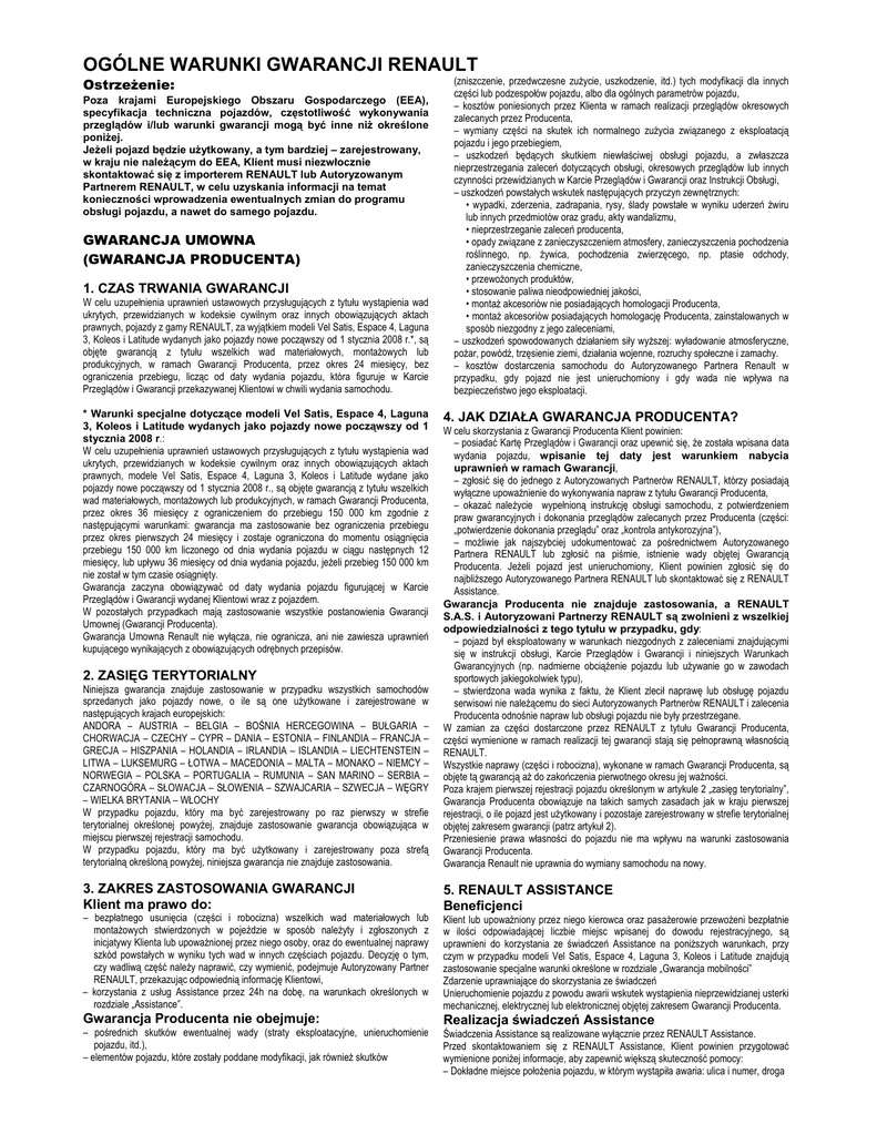 OGÓLNE WARUNKI GWARANCJI RENAULT Ostrzeżenie: Poza krajami Europejskiego Obszaru Gospodarczego (EEA), specyfikacja techniczna pojazdów, częstotliwość wykonywania przeglądów i/lub warunki gwarancji mogą być inne niż określone poniżej. Jeżeli pojazd będzie użytkowany, a tym bardziej – zarejestrowany, w kraju nie należącym do EEA, Klient musi niezwłocznie skontaktować się z importerem RENAULT lub Autoryzowanym Partnerem RENAULT, w celu uzyskania informacji na temat konieczności wprowadzenia ewentualnych zmian do programu obsługi pojazdu, a nawet do samego pojazdu. GWARANCJA UMOWNA (GWARANCJA PRODUCENTA) 1. CZAS TRWANIA GWARANCJI W celu uzupełnienia uprawnień ustawowych przysługujących z tytułu wystąpienia wad ukrytych, przewidzianych w kodeksie cywilnym oraz innych obowiązujących aktach prawnych, pojazdy z gamy RENAULT, za wyjątkiem modeli Vel Satis, Espace 4, Laguna 3, Koleos i Latitude wydanych jako pojazdy nowe począwszy od 1 stycznia 2008 r.*, są objęte gwarancją z tytułu wszelkich wad materiałowych, montażowych lub produkcyjnych, w ramach Gwarancji Producenta, przez okres 24 miesięcy, bez ograniczenia przebiegu, licząc od daty wydania pojazdu, która figuruje w Karcie Przeglądów i Gwarancji przekazywanej Klientowi w chwili wydania samochodu. * Warunki specjalne dotyczące modeli Vel Satis, Espace 4, Laguna 3, Koleos i Latitude wydanych jako pojazdy nowe począwszy od 1 stycznia 2008 r.: W celu uzupełnienia uprawnień ustawowych przysługujących z tytułu wystąpienia wad ukrytych, przewidzianych w kodeksie cywilnym oraz innych obowiązujących aktach prawnych, modele Vel Satis, Espace 4, Laguna 3, Koleos i Latitude wydane jako pojazdy nowe począwszy od 1 stycznia 2008 r., są objęte gwarancją z tytułu wszelkich wad materiałowych, montażowych lub produkcyjnych, w ramach Gwarancji Producenta, przez okres 36 miesięcy z ograniczeniem do przebiegu 150 000 km zgodnie z następującymi warunkami: gwarancja ma zastosowanie bez ograniczenia przebiegu przez okres pierwszych 24 miesięcy i zostaje ograniczona do momentu osiągnięcia przebiegu 150 000 km liczonego od dnia wydania pojazdu w ciągu następnych 12 miesięcy, lub upływu 36 miesięcy od dnia wydania pojazdu, jeżeli przebieg 150 000 km nie został w tym czasie osiągnięty. Gwarancja zaczyna obowiązywać od daty wydania pojazdu figurującej w Karcie Przeglądów i Gwarancji wydanej Klientowi wraz z pojazdem. W pozostałych przypadkach mają zastosowanie wszystkie postanowienia Gwarancji Umownej (Gwarancji Producenta). Gwarancja Umowna Renault nie wyłącza, nie ogranicza, ani nie zawiesza uprawnień kupującego wynikających z obowiązujących odrębnych przepisów. (zniszczenie, przedwczesne zużycie, uszkodzenie, itd.) tych modyfikacji dla innych części lub podzespołów pojazdu, albo dla ogólnych parametrów pojazdu, – kosztów poniesionych przez Klienta w ramach realizacji przeglądów okresowych zalecanych przez Producenta, – wymiany części na skutek ich normalnego zużycia związanego z eksploatacją pojazdu i jego przebiegiem, – uszkodzeń będących skutkiem niewłaściwej obsługi pojazdu, a zwłaszcza nieprzestrzegania zaleceń dotyczących obsługi, okresowych przeglądów lub innych czynności przewidzianych w Karcie Przeglądów i Gwarancji oraz Instrukcji Obsługi, – uszkodzeń powstałych wskutek następujących przyczyn zewnętrznych: • wypadki, zderzenia, zadrapania, rysy, ślady powstałe w wyniku uderzeń żwiru lub innych przedmiotów oraz gradu, akty wandalizmu, • nieprzestrzeganie zaleceń producenta, • opady związane z zanieczyszczeniem atmosfery, zanieczyszczenia pochodzenia roślinnego, np. żywica, pochodzenia zwierzęcego, np. ptasie odchody, zanieczyszczenia chemiczne, • przewożonych produktów, • stosowanie paliwa nieodpowiedniej jakości, • montaż akcesoriów nie posiadających homologacji Producenta, • montaż akcesoriów posiadających homologację Producenta, zainstalowanych w sposób niezgodny z jego zaleceniami, – uszkodzeń spowodowanych działaniem siły wyższej: wyładowanie atmosferyczne, pożar, powódź, trzęsienie ziemi, działania wojenne, rozruchy społeczne i zamachy. – kosztów dostarczenia samochodu do Autoryzowanego Partnera Renault w przypadku, gdy pojazd nie jest unieruchomiony i gdy wada nie wpływa na bezpieczeństwo jego eksploatacji. 4. JAK DZIAŁA GWARANCJA PRODUCENTA? Niniejsza gwarancja znajduje zastosowanie w przypadku wszystkich samochodów sprzedanych jako pojazdy nowe, o ile są one użytkowane i zarejestrowane w następujących krajach europejskich: ANDORA – AUSTRIA – BELGIA – BOŚNIA HERCEGOWINA – BUŁGARIA – CHORWACJA – CZECHY – CYPR – DANIA – ESTONIA – FINLANDIA – FRANCJA – GRECJA – HISZPANIA – HOLANDIA – IRLANDIA – ISLANDIA – LIECHTENSTEIN – LITWA – LUKSEMURG – ŁOTWA – MACEDONIA – MALTA – MONAKO – NIEMCY – NORWEGIA – POLSKA – PORTUGALIA – RUMUNIA – SAN MARINO – SERBIA – CZARNOGÓRA – SŁOWACJA – SŁOWENIA – SZWAJCARIA – SZWECJA – WĘGRY – WIELKA BRYTANIA – WŁOCHY W przypadku pojazdu, który ma być zarejestrowany po raz pierwszy w strefie terytorialnej określonej powyżej, znajduje zastosowanie gwarancja obowiązująca w miejscu pierwszej rejestracji samochodu. W przypadku pojazdu, który ma być użytkowany i zarejestrowany poza strefą terytorialną określoną powyżej, niniejsza gwarancja nie znajduje zastosowania. W celu skorzystania z Gwarancji Producenta Klient powinien: – posiadać Kartę Przeglądów i Gwarancji oraz upewnić się, że została wpisana data wydania pojazdu, wpisanie tej daty jest warunkiem nabycia uprawnień w ramach Gwarancji, – zgłosić się do jednego z Autoryzowanych Partnerów RENAULT, którzy posiadają wyłączne upoważnienie do wykonywania napraw z tytułu Gwarancji Producenta, – okazać należycie wypełnioną instrukcję obsługi samochodu, z potwierdzeniem p