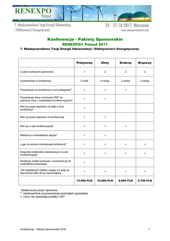 Konferencje - Pakiety Sponsorskie RENEXPO® Poland 2017 7. Międzynarodowe Targi Energii Odnawialnej i Efektywności Energetycznej Platynowy Złoty Srebrny Brązowy 1 2 2 2 5 osób 4 osoby 3 osoby 2 osoby Prezentacja na konferencji w roli prelegenta** + + + Prezentacja firmy w formacie PDF do pobrania wraz z materiałami konferencyjnymi* + + Roll up przed wejściem na targi w dniu konferencji* + Roll up przed wejściem na konferencje + + Roll up w sali konferencyjnej* + + Reklama w newsletterze targów* + + Logo na stronie internetowej konferencji* + + + + Kolportaż materiałów reklamowych na sali konferencyjnej* + + + + Redakcja notatki prasowej i rozesłanie jej do rozdzielnika prasowego + 100 bezpłatnych biletów wstępu na targi ze Sponsorem jako firmą zapraszającą + + + + 13.000 PLN 10.800 PLN 8.000 PLN 5.700 PLN Liczba możliwych sponsorów Uczestnictwo w konferencji + *dostarczone przez sponsora ** niedozwolone są prezentacje pod kątem sprzedaży 1. Ceny nie zawierają podatku VAT Konferencje - Pakiety Sponsorskie 2016 1 Dodatkowe możliwosci sponsoringu Przerwa obiadowa, 2 przerwy kawowe 2 przerwy kawowe Get-Together, spotkanie towarzyskie po konferencji - rozpoznawalność Sponsora poprzez banner, roll up albo plakat w dziale gastronomicznym, logo na serwetkach itp. * - logo na stronie internetowej i w programie konferencji - rozpoznawalność Sponsora poprzez banner, roll up albo plakat w dziale gastronomicznym, logo na serwetkach itp. * - logo na stronie internetowej i w programie konferencji - rozpoznawalność Sponsora poprzez banner, roll up albo plakat w dziale gastronomicznym, logo na serwetkach itp. * - logo na stronie internetowej i w programie konferencji 14.000 PLN 8.000 PLN 9.400 PLN *dostarczone przez sponsora Proszę zakreślić wybrany przez Państwa pakiet sponsorski Platynowy Pakiet Sponsorski 13.000 PLN Złoty Pakiet Sponsorski 10.800 PLN Srebrny Pakiet Sponsorski 9.000 PLN Brązowy Pakiet Sponsorski 5.700 PLN Dodatkowe możliwości Sponsoringu (proszę zakreślić) Przerwa obiadowa, 2 przerwy kawowe 14.000 PLN 2 przerwy kawowe 8.000 PLN Get-Together, spotkanie towarzyskie po konferencji 9.400 PLN Konferencje - Pakiety Sponsorskie 2016 2 Dane kontaktowe: Nazwa Firmy: ........................................................................................................................................... Dział: ........................................................................................................................................................ Ulica/skrytka pocztowa: ......................................................................................................................... Kraj/kod pocztowy/miejscowość: ......................................................................................................... Numer telefonu: ...................................................................................................................................... Fax:........................................................................................................................................................... Email: .............................................@...................................................................................................... Strona internetowa: ................................................................................................................................ NIP: ........................................................................................................................................................... 1. Ceny nie zawierają podatku VAT Dyrektor/Prezes: ..................................................................................................................................... Tel.: .......................................................................................................................................................... Fax: .......................................................................................................................................................... Email: ......................................................@.............................................................................................. Osoba kontaktowa w kwestii sponsoringu: ......................................................................................... Tel.: .......................................................................................................................................................... Numer komórkowy: ................................................................................................................................ Fax: .......................................................................................................................................................... Email: .......................................................@............................................................................................. Proszę przygotować mi indywidualny pakiet sponsorski, w tym celu proszę o kontakt. Niniejszym zamawiam wybrany/e pakiet/y sponsorski/e. Pakiety sponsorskie nie zawierają kosztów produkcji materiałów reklamowych. Przyznanie i wyrażenie ugody na sponsoring następuje po sprawdzeniu możliwości sponsoringu. Odpowiednie warunki handlowe, które są częścią umowy są mi znane i akceptuje je. Aby umowa była ważna wymagana jest zgoda Organizatora. Miejscowość, data: ........................................................... Prawnie wiążący podpis: .......................... Pieczątka: Wypełniony formularz prosze wysłać na adres email [email protected] lub faxem na numer +48 (0)22-379-78-60. Konferencje - Pakiety Sponsorskie 2016 3