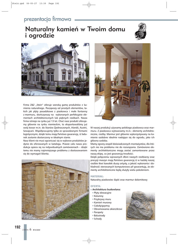 Stein.qxd 06-05-27 13:39 Page 192 prezentacja firmowa Naturalny kamień w Twoim domu i ogrodzie Firma Z&Z „Stein” oferuje szeroką gamę produktów z kamienia naturalnego. Począwszy od prostych elementów, takich jak płyty posadzkowe z piaskowca i małe fontanny z marmuru, skończywszy na wykonanych perfekcyjnie elementach architektonicznych lub pięknych rzeźbach. Nasza firma istnieje na rynku już 13 lat. Choć nasz produkt oferujemy głównie na rynku niemieckim, to eksportowaliśmy już swój towar m.in. do Stanów Zjednoczonych, Irlandii, Austrii, Szwajcarii. Współpracujemy tylko ze sprawdzonymi firmami logistycznymi, dzięki temu mają Państwo gwarancję, iż ładunek zostanie dostarczony w idealnym stanie. Nasz klient nie musi ograniczać się w wyborze produktów jedynie do oferowanych w katalogu. Prawie cała nasza produkcja opiera się na indywidualnych zamówieniach – dzięki temu nie mamy najmniejszego problemu z dostosowaniem się do wymagań klienta. W naszej produkcji używamy polskiego piaskowca oraz marmuru. Z piaskowca wytwarzamy m.in.: elementy architektoniczne, rzeźby. Marmur jest głównie wykorzystywany na kamienie ozdobne idealnie nadające się do ogrodu, jako ich główna ozdoba. Mamy zgrany zespół doświadczonych montażystów, dla których nie ma problemu nie do rozwiązania. Zamówione elementy architektoniczne mogą zostać zamontowane przez naszą ekipę, co jest gwarancją trwałości. Dzięki połączeniu wprawnych dłoni naszych rzeźbiarzy oraz precyzji maszyn mają Państwo gwarancję iż w każdej naszej rzeźbie tkwi kawałek duszy artysty, a jakość wykonania i dokładność sterowanych komputerowo pił gwarantują, że elementy architektoniczne będą służyły wielu pokoleniom. MATERIAŁ: Naturalny piaskowiec śląski oraz marmur dolomitowy OFERTA: Architektura budowlana: Płyty elewacyjne Kolumny Przykrywy muru Kamień murowy Cokoły/gzymsy Obramowania okien/drzwi Parapety Balustrady Schody 192 2006 6 Stein.qxd 06-05-27 13:39 Page 193 Kamienie ozdobne i dekoracyjne: Samorodki dolomitowe Fontanny z dolomitu Otoczaki Rzeźby według wzorów z naszego katalogu lub na Państwa indywidualne zamówienie. Wyposażenie ogrodów: Fontanny Ławki Lampy ogrodowe Kwietniki Donice Poidełka - Kolumny Zapraszamy do odwiedzenia naszej strony, aby poznać szczegółową ofertę, zamówić broszurę wraz z płytą CD, obejrzeć zdjęcia z naszych realizacji oraz wiele innych. FIRMA Z&Z „STEIN” Pisarzowice 155 58-400 Kamienna Góra tel. 075 742 88 00 faks 075 742 88 01 www.stein.pl e-mail:[email protected] 6 2006 193