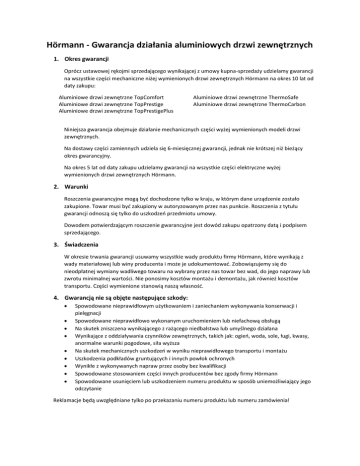 Hörmann - Gwarancja działania aluminiowych drzwi zewnętrznych 1. Okres gwarancji Oprócz ustawowej rękojmi sprzedającego wynikającej z umowy kupna-sprzedaży udzielamy gwarancji na wszystkie części mechaniczne niżej wymienionych drzwi zewnętrznych Hörmann na okres 10 lat od daty zakupu: Aluminiowe drzwi zewnętrzne TopComfort Aluminiowe drzwi zewnętrzne TopPrestige Aluminiowe drzwi zewnętrzne TopPrestigePlus Aluminiowe drzwi zewnętrzne ThermoSafe Aluminiowe drzwi zewnętrzne ThermoCarbon Niniejsza gwarancja obejmuje działanie mechanicznych części wyżej wymienionych modeli drzwi zewnętrznych. Na dostawy części zamiennych udziela się 6-miesięcznej gwarancji, jednak nie krótszej niż bieżący okres gwarancyjny. Na okres 5 lat od daty zakupu udzielamy gwarancji na wszystkie części elektryczne wyżej wymienionych drzwi zewnętrznych Hörmann. 2. Warunki Roszczenia gwarancyjne mogą być dochodzone tylko w kraju, w którym dane urządzenie zostało zakupione. Towar musi być zakupiony w autoryzowanym przez nas punkcie. Roszczenia z tytułu gwarancji odnoszą się tylko do uszkodzeń przedmiotu umowy. Dowodem potwierdzającym roszczenie gwarancyjne jest dowód zakupu opatrzony datą i podpisem sprzedającego. 3. Świadczenia W okresie trwania gwarancji usuwamy wszystkie wady produktu firmy Hörmann, które wynikają z wady materiałowej lub winy producenta i może je udokumentować. Zobowiązujemy się do nieodpłatnej wymiany wadliwego towaru na wybrany przez nas towar bez wad, do jego naprawy lub zwrotu minimalnej wartości. Nie ponosimy kosztów montażu i demontażu, jak również kosztów transportu. Części wymienione stanowią naszą własność. 4. Gwarancją nie są objęte następujące szkody: Spowodowane nieprawidłowym użytkowaniem i zaniechaniem wykonywania konserwacji i pielęgnacji Spowodowane nieprawidłowo wykonanym uruchomieniem lub niefachową obsługą Na skutek zniszczena wynikającego z rażącego niedbalstwa lub umyślnego działana Wynikające z oddziaływania czynników zewnętrznych, takich jak: ogień, woda, sole, ługi, kwasy, anormalne warunki pogodowe, siła wyższa Na skutek mechanicznych uszkodzeń w wyniku nieprawidłowego transportu i montażu Uszkodzenia podkładów gruntujących i innych powłok ochronych Wynikłe z wykonywanych napraw przez osoby bez kwalifikacji Spowodowane stosowaniem części innych producentów bez zgody firmy Hörmann Spowodowane usunięciem lub uszkodzeniem numeru produktu w sposób uniemożliwiający jego odczytanie Reklamacje będą uwzględniane tylko po przekazaniu numeru produktu lub numeru zamówienia!