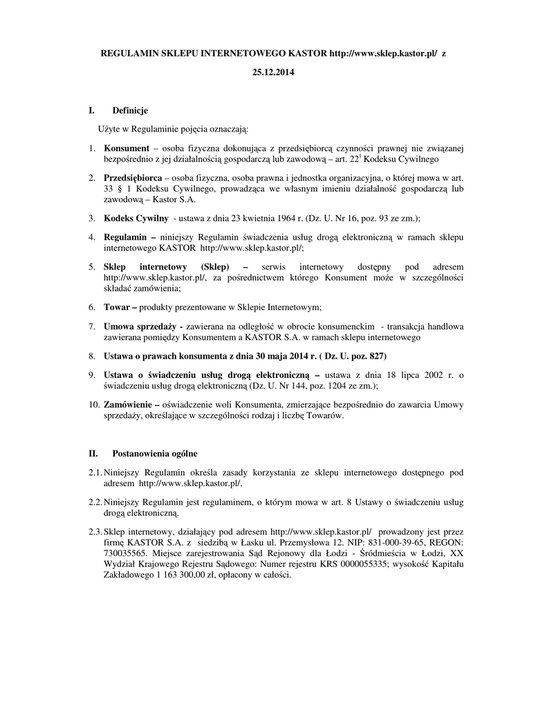 REGULAMIN SKLEPU INTERNETOWEGO KASTOR http://www.sklep.kastor.pl/ z 25.12.2014 I. Definicje U yte w Regulaminie poj cia oznaczaj : 1. Konsument – osoba fizyczna dokonuj ca z przedsi biorc czynno ci prawnej nie zwi zanej bezpo rednio z jej działalno ci gospodarcz lub zawodow – art. 221 Kodeksu Cywilnego 2. Przedsi biorca – osoba fizyczna, osoba prawna i jednostka organizacyjna, o której mowa w art. 33 § 1 Kodeksu Cywilnego, prowadz ca we własnym imieniu działalno gospodarcz lub zawodow – Kastor S.A. 3. Kodeks Cywilny - ustawa z dnia 23 kwietnia 1964 r. (Dz. U. Nr 16, poz. 93 ze zm.); 4. Regulamin – niniejszy Regulamin wiadczenia usług drog elektroniczn w ramach sklepu internetowego KASTOR http://www.sklep.kastor.pl/; 5. Sklep internetowy (Sklep) – serwis internetowy dost pny pod adresem http://www.sklep.kastor.pl/, za po rednictwem którego Konsument mo e w szczególno ci składa zamówienia; 6. Towar – produkty prezentowane w Sklepie Internetowym; 7. Umowa sprzeda y - zawierana na odległo w obrocie konsumenckim - transakcja handlowa zawierana pomi dzy Konsumentem a KASTOR S.A. w ramach sklepu internetowego 8. Ustawa o prawach konsumenta z dnia 30 maja 2014 r. ( Dz. U. poz. 827) 9. Ustawa o wiadczeniu usług drog elektroniczn – ustawa z dnia 18 lipca 2002 r. o wiadczeniu usług drog elektroniczn (Dz. U. Nr 144, poz. 1204 ze zm.); 10. Zamówienie – o wiadczenie woli Konsumenta, zmierzaj ce bezpo rednio do zawarcia Umowy sprzeda y, okre laj ce w szczególno ci rodzaj i liczb Towarów. II. Postanowienia ogólne 2.1. Niniejszy Regulamin okre la zasady korzystania ze sklepu internetowego dost pnego pod adresem http://www.sklep.kastor.pl/. 2.2. Niniejszy Regulamin jest regulaminem, o którym mowa w art. 8 Ustawy o wiadczeniu usług drog elektroniczn . 2.3. Sklep internetowy, działaj cy pod adresem http://www.sklep.kastor.pl/ prowadzony jest przez firm KASTOR S.A. z siedzib w Łasku ul. Przemysłowa 12. NIP: 831-000-39-65, REGON: 730035565. Miejsce zarejestrowania S d Rejonowy dla Łodzi - ródmie cia w Łodzi, XX Wydział Krajowego Rejestru S dowego: Numer rejestru KRS 0000055335; wysoko Kapitału Zakładowego 1 163 300,00 zł, opłacony w cało ci. Dane adresowe/kontaktowe: KASTOR S.A., ul. Przemysłowa 12, 98-100 Łask . Zapytania i reklamacje mog by kierowane na adres [email protected] lub pod numer telefonu 502 796 324 oraz 502 796 328 (opłata wg cennika wła ciwego operatora). 2.4. Niniejszy Regulamin okre la w szczególno ci: a) zasady dokonywania rejestracji i korzystania z konta w ramach sklepu internetowego, b) warunki i zasady składania drog elektroniczn Zamówienia w ramach sklepu internetowego, c) zasady zawierania Umów sprzeda y z wykorzystaniem usług wiadczonych w ramach Sklepu Internetowego, d) tryb post powania reklamacyjnego, e) obowi zki informacyjne okre lone w art. 12 Ustawy o prawach konsumenta z dnia 30 maja 2014 r. 2.5. Konsumenci mog uzyska dost p do niniejszego Regulaminu w ka dym czasie za po rednictwem odsyłacza zamieszczonego na stronie głównej serwisu http://www.sklep.kastor.pl/ oraz pobra go i sporz dzi wydruk. 2.6. Ceny towarów znajduj cych si w sklepie internetowym KASTOR, podane s w złotówkach i zawieraj VAT – s cenami brutto. Cena podana przy ka dym towarze jest wi ca w chwili zło enia zamówienia przez konsumenta. 2.7. Konsumentem sklepu mo e by tylko i wył cznie osoba pełnoletnia, posiadaj ca pełn zdolno do czynno ci prawnych. III. Zasady korzystania ze Sklepu Internetowego 3.1. Warunkiem rozpocz cia korzystania ze sklepu internetowego jest rejestracja w jego ramach. 3.2. Rejestracja nast puje poprzez wypełnienie i zaakceptowanie formularza rejestracyjnego, udost pnionego na jednej ze stron Sklepu. 3.3. Warunkiem rejestracji jest wyra enie zgody na tre Regulaminu, Polityki Prywatno ci, zapoznanie si z wymaganymi prawem informacjami oraz podanie danych osobowych oznaczonych jako obowi zkowe. 3.4. KASTOR mo e pozbawi Konsumenta prawa do korzystania ze Sklepu Internetowego, jak równie mo e ograniczy jego dost p do cz ci lub cało ci zasobów Sklepu Internetowego, ze skutkiem natychmiastowym, w przypadku naruszania przez Konsumenta Regulaminu, a w szczególno ci, gdy Konsument: a) podał w trakcie rejestracji w sklepie internetowym dane niezgodne z prawd , niedokładne lub nieaktualne, wprowadzaj c w bł d lub naruszaj c prawa osób trzecich, b) dopu cił si za po rednictwem sklepu internetowego naruszenia dóbr osobistych osób trzecich, w szczególno ci dóbr osobistych innych konsumentów sklepu internetowego, c) dopu cił si innych zachowa , które zostan uznane przez KASTOR za zachowanie niezgodne z obowi zuj cymi przepisami prawa lub ogólnymi zasadami korzystania z sieci Internetu lub godz ce w dobre imi KASTOR. 3.5. Osoba, która została pozbawiona prawa do korzystania ze sklepu internetowego, nie mo e dokona powtórnej rejestracji bez uprzedniej zgody KASTOR. 3.6. W celu zapewnienia bezpiecze stwa przekazu komunikatów i danych w zwi zku ze wiadczonymi w ramach strony http://www.sklep.kastor.pl/ usługami, Sklep internetowy podejmuje rodki techniczne i organizacyjne odpowiednie do stopnia zagro enia bezpiecze stwa wiadczonych usług, w szczególno ci rodki słu ce zapobieganiu pozyskiwania i modyfikacji przez osoby nieuprawnione danych osobowych przesyłanych w Internecie. 3.7. Konsument zobowi zany jest w szczególno ci do: a) niedostarczania i nieprzekazywania tre ci zabronionych przez przepisy prawa, np. tre ci propaguj cych przemoc, zniesławiaj cych lub naruszaj cych dobra osobiste i inne prawa osób trzecich, b) korzystania ze Sklepu internetowego w sposób nie zakłócaj cy jego funkcjonowania, w szczególno ci poprzez u ycie okre lonego oprogramowania lub urz dze , c) niepodejmowania działa takich jak: rozsyłanie lub umieszczanie w ramach Sklepu internetowego niezamówionej informacji handlowej (spam), d) korzystania ze sklepu internetowego w sposób nieuci liwy dla innych Konsumentów oraz KASTOR, e