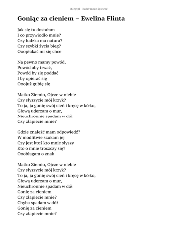 iSing.pl - Każdy może śpiewać! Goniąc za cieniem – Ewelina Flinta Jak się tu dostałam I co przywiodło mnie? Czy ludzka ma natura? Czy szybki życia bieg? Ooopłakać mi się chce Na pewno mamy powód, Powód aby trwać, Powód by się poddać I by opierać się Ooojuż gubię się Matko Ziemio, Ojcze w niebie Czy słyszycie mój krzyk? To ja, ja gonię swój cień i kręcę w kółko, Głową uderzam o mur, Nieuchronnie spadam w dół Czy złapiecie mnie? Gdzie znaleźć mam odpowiedź? W modlitwie szukam jej Czy jest ktoś kto mnie słyszy Kto o mnie troszczy się? Ooobłagam o znak Matko Ziemio, Ojcze w niebie Czy słyszycie mój krzyk? To ja, ja gonię swój cień i kręcę w kółko, Głową uderzam o mur, Nieuchronnie spadam w dół Gonię za cieniem Czy złapiecie mnie? Chyba spadam w dół Gonię za cieniem Czy złapiecie mnie? Próbuję czuć się dobrze I każdą chwilą żyć, By stąpać móc po wodzie Zbyt cenny jest nasz czas Pamiętam to co było, Lecz nie chcę wracać, by Gonić cienie, gonić cienie Matko Ziemio, Ojcze w niebie Czy słyszycie mój krzyk? To ja, ja gonię swój cień i kręcę w kółko, Głową uderzam o mur, Nieuchronnie spadam w dół Gonię za cieniem Czy złapiecie mnie? Chyba spadam w dół Gonie za cieniem Czy złapiecie mnie? Słowa: brak danych Muzyka: brak danych Rok wydania: brak danych Płyta: brak danych