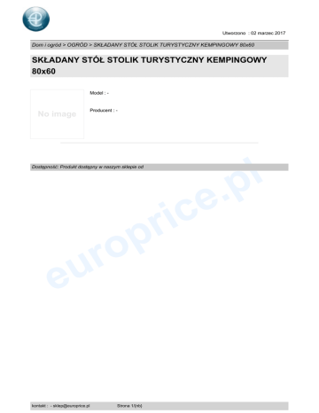 Utworzono : 02 marzec 2017 Dom i ogród > OGRÓD > SKŁADANY STÓŁ STOLIK TURYSTYCZNY KEMPINGOWY 80x60 SKŁADANY STÓŁ STOLIK TURYSTYCZNY KEMPINGOWY 80x60 Model : - No image Producent : - l .p Dostępność: Produkt dostępny w naszym sklepie od o r u e kontakt : - [email protected] r p e ic Strona 1/{nb}
