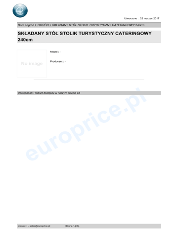 Utworzono : 02 marzec 2017 Dom i ogród > OGRÓD > SKŁADANY STÓŁ STOLIK TURYSTYCZNY CATERINGOWY 240cm SKŁADANY STÓŁ STOLIK TURYSTYCZNY CATERINGOWY 240cm Model : - No image Producent : - l .p Dostępność: Produkt dostępny w naszym sklepie od o r u e kontakt : - [email protected] r p e ic Strona 1/{nb}