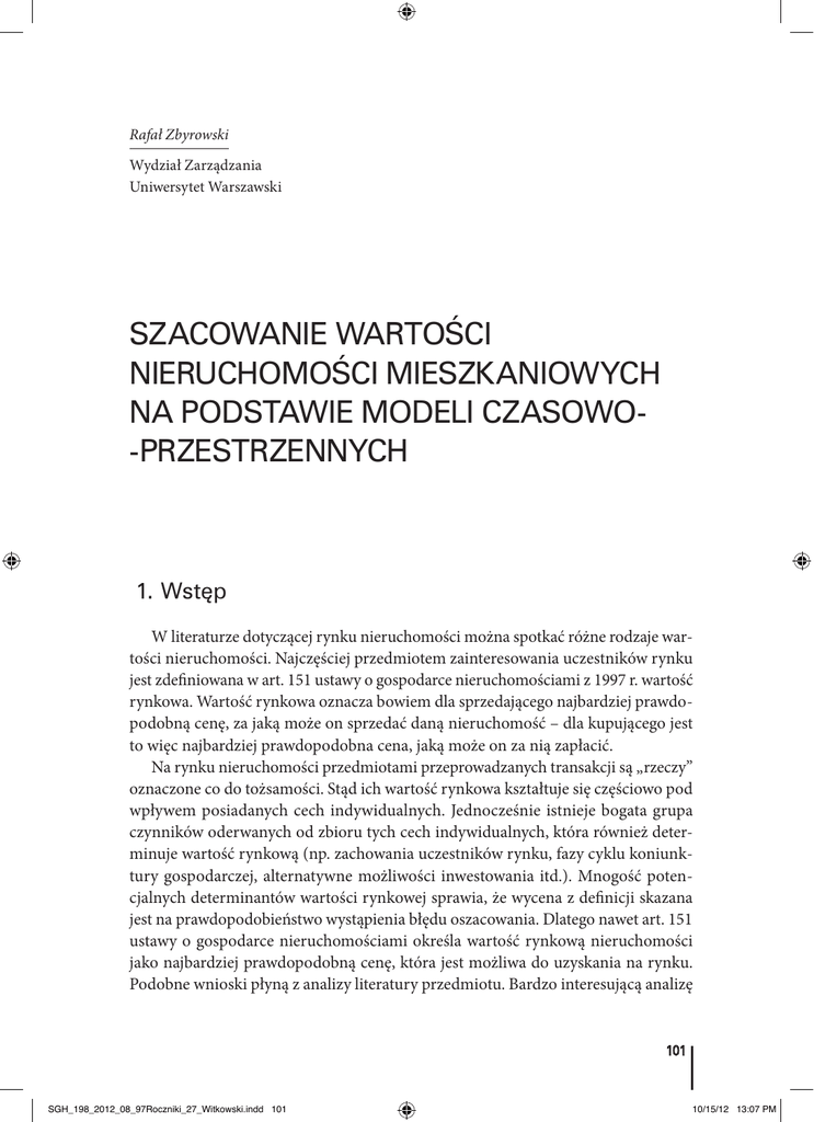 Rafał Zbyrowski Wydział Zarządzania Uniwersytet Warszawski SZACOWANIE WARTOŚCI NIERUCHOMOŚCI MIESZKANIOWYCH NA PODSTAWIE MODELI CZASOWO ‑PRZESTRZENNYCH 1. Wstęp W literaturze dotyczącej rynku nieruchomości można spotkać różne rodzaje war‑ tości nieruchomości. Najczęściej przedmiotem zainteresowania uczestników rynku jest zdefiniowana w art. 151 ustawy o gospodarce nieruchomościami z 1997 r. wartość rynkowa. Wartość rynkowa oznacza bowiem dla sprzedającego najbardziej prawdo‑ podobną cenę, za jaką może on sprzedać daną nieruchomość – dla kupującego jest to więc najbardziej prawdopodobna cena, jaką może on za nią zapłacić. Na rynku nieruchomości przedmiotami przeprowadzanych transakcji są „rzeczy” oznaczone co do tożsamości. Stąd ich wartość rynkowa kształtuje się częściowo pod wpływem posiadanych cech indywidualnych. Jednocześnie istnieje bogata grupa czynników oderwanych od zbioru tych cech indywidualnych, która również deter‑ minuje wartość rynkową (np. zachowania uczestników rynku, fazy cyklu koniunk‑ tury gospodarczej, alternatywne możliwości inwestowania itd.). Mnogość poten‑ cjalnych determinantów wartości rynkowej sprawia, że wycena z definicji skazana jest na prawdopodobieństwo wystąpienia błędu oszacowania. Dlatego nawet art. 151 ustawy o gospodarce nieruchomościami określa wartość rynkową nieruchomości jako najbardziej prawdopodobną cenę, która jest możliwa do uzyskania na rynku. Podobne wnioski płyną z analizy literatury przedmiotu. Bardzo interesującą analizę 101 SGH_198_2012_08_97Roczniki_27_Witkowski.indd 101 10/15/12 13:07 PM Rafał Zbyrowski można przeprowadzić na podstawie artykułów W. Nurka1, w których autor wskazuje na niespójność funkcjonujących w tej dziedzinie przepisów. Otóż rozważając kwestię wyceny nieruchomości w świetle obowiązującego w Polsce prawa, nie zawsze można dostrzec fakt, że słowo „szacowanie” w oczywisty sposób wskazuje na wycenę jako na proces ustalania najbardziej prawdopodobnej ceny nieruchomości. Stosowane w krajach zachodniej Europy zautomatyzowane programy lub narzę‑ dzia z dziedziny metod ilościowych pozwalają uzyskać informację, która może być pomocna przy podejmowaniu decyzji związanych z kupnem lub sprzedażą mieszka‑ nia. Wycena nieruchomości w Polsce w znakomitej większości opiera się wyłącznie na wiedzy i doświadczeniu wykwalifikowanego rzeczoznawcy majątkowego. W celu szczegółowego określenia wartości nieruchomości nieuniknione jest skorzystanie z usług rzeczoznawcy majątkowego posiadającego uprawnienia zawodowe w zakresie szacowania nieruchomości, nadane w trybie ustawy o gospodarce nieruchomościami z dnia 21 sierpnia 1997 r.2 Stąd też wynik obliczeń orientacyjnej ceny transakcyjnej otrzymany z zastosowaniem różnego rodzaju narzędzi ilościowych lub programów nie jest wyceną nieruchomości i nie stanowi o wartości nieruchomości w rozumie‑ niu wspomnianej ustawy. Tymczasem narzędzia ilościowe mogą być wykorzystywane w praktyce przez banki, rzeczoznawców, inwestorów i osoby prywatne do orientacyjnego szacowania wartości domów i mieszkań. Interesującą kwestią jest możliwość wyłonienia obiek‑ tywnych czynników, które determinują wartość rynkową nieruchomości. Wyodręb‑ nienie charakterystyk o kluczowym w tym zakresie znaczeniu możne nastąpić dzięki poddaniu rynku analizie ilościowej. Głównym celem niniejszego artykułu jest wskazanie możliwości zastosowania modelowania ekonometrycznego jako wsparcia procesu wyceny wstępnej nierucho‑ mości mieszkaniowych w Warszawie. W kontekście powyższego celu sformułowano następujące hipotezy badawcze: zz wartość rynkowa nieruchomości mieszkaniowej w przeważającej mierze jest zde‑ terminowana zbiorem obiektywnych czynników; zz pozwala to na stworzenie instrumentu stanowiącego istotne wsparcie działalno‑ ści ekspertów szacujących wartość nieruchomości, samorządów i instytucji po‑ datkowych. 1 W. Nurek, (112). Prawdopodobieństwo i niepewność wyceny nieruchomości, „Nieruchomości” 2007, nr 12 2 Tekst jednolity Dz.U. z 2004 r. Nr 261 poz. 2603 z późn. zm. 102 SGH_198_2012_08_97Roczniki_27_Witkowski.indd 102 10/15/12 13:07 PM Szacowanie wartości nieruchomości mieszkaniowych na podstawie modeli czasowo‑przestrzennych 2. Badanie empiryczne zmienności cen nieruchomości mieszkaniowych w Warszawie w okresie kryzysu Punktem wyjścia prowadzonych rozważań jest zdefiniowanie danych łączących wymiary przekrojowy i czasowy. Dane te można podzielić na dwie podstawowe grupy3: zz dane panelowe (Panel data, dominacja przekrojowa) – zbiór danych, tj. infor‑ macji, o tych samych jednostkach (informacje przekrojowe) w kilku, zwykle ko‑ lejnych okresach; charakteryzują się większą liczbą obiektów N w stosunku do liczby okresów T; zz dane przekrojowo‑czasowe (TSCS – Time Series Cross‑Sectional, dominacja cza‑ sowa) – zbiór danych o tych samych jednostkach w kilku okresach; charaktery‑ zują się większą liczbą okresów T w stosunku do liczby obiektów N. Zastosowanie modelowania czasowo‑przestrzennego w dziedzinie wyceny lokali mieszkalnych pozwala połączyć oba wymiary zmienności badanego zjawiska za po‑ mocą spójnego układu równań. W badaniu zastosowano model z efektami ustalo‑ średnich zmiennej endoge wartościachśrednich nymi (fixed effects), który pozwala odzwierciedlić różnice w wartościach przekrojowych. Średnie ceny mieszkań zmiennej endogenicznej poszczególnych jednostek przekrojowych. Średnie ceny warto ściach średnichdlazmiennej endogenicznej dla poszczególnych jednostek zróżnicowaniem w przekroju dzielnicow przekrojowych. Średnie ceny ń w zróżnicowaniem stolicy odznaczają w przekroju się znacznym mieszkań w stolicy odznaczają się mieszka znacznym dzielni‑ zróżnicowanych zjawiska na po