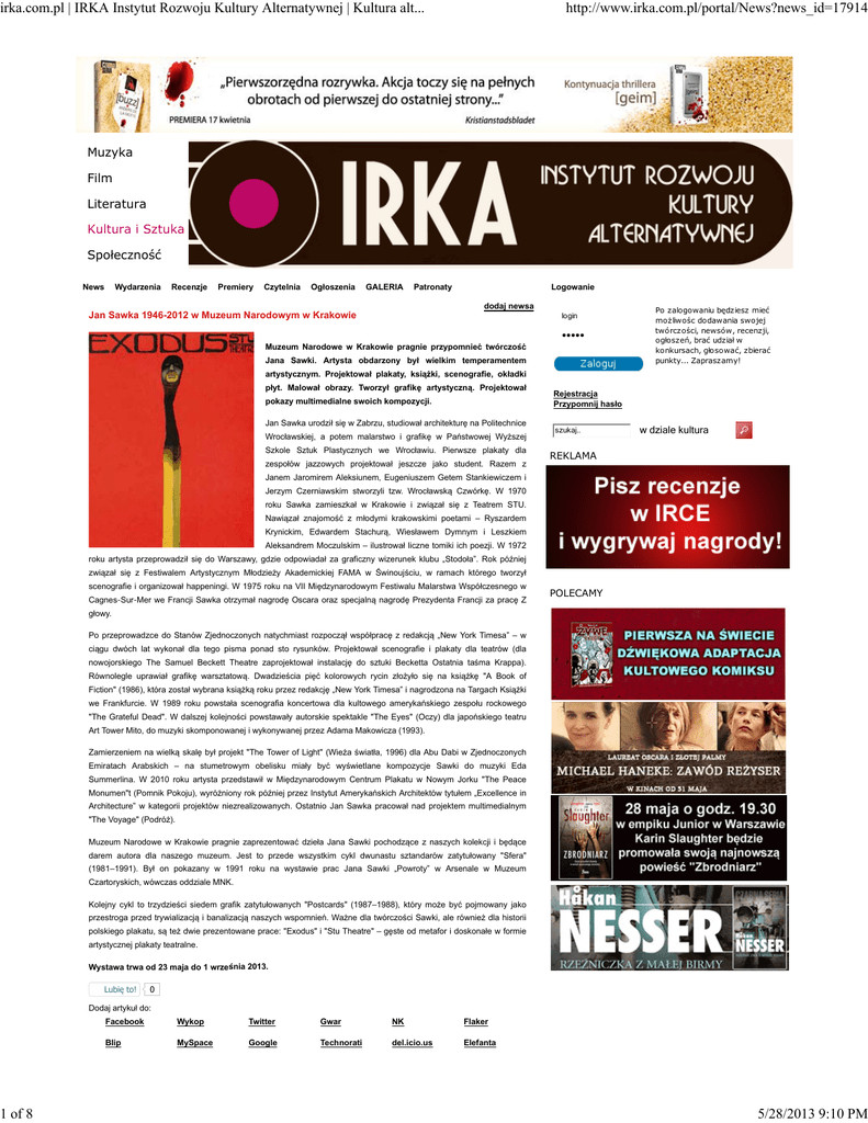 irka.com.pl | IRKA Instytut Rozwoju Kultury Alternatywnej | Kultura alt... 1 of 8 http://www.irka.com.pl/portal/News?news_id=17914 Muzyka Film Literatura Kultura i Sztuka Społeczność News Wydarzenia Recenzje Premiery Czytelnia Ogłoszenia GALERIA Patronaty Logowanie dodaj newsa Jan Sawka 1946-2012 w Muzeum Narodowym w Krakowie login ●●●●● Muzeum Narodowe w Krakowie pragnie przypomnieć twórczość Jana Sawki. Artysta obdarzony był wielkim temperamentem Po zalogowaniu będziesz mieć możliwośc dodawania swojej twórczości, newsów, recenzji, ogłoszeń, brać udział w konkursach, głosować, zbierać punkty... Zapraszamy! artystycznym. Projektował plakaty, książki, scenografie, okładki płyt. Malował obrazy. Tworzył grafikę artystyczną. Projektował pokazy multimedialne swoich kompozycji. Jan Sawka urodził się w Zabrzu, studiował architekturę na Politechnice Wrocławskiej, a potem malarstwo i grafikę w Państwowej Wyższej Szkole Sztuk Plastycznych we Wrocławiu. Pierwsze plakaty dla zespołów jazzowych projektował jeszcze jako student. Razem z Rejestracja Przypomnij hasło szukaj.. w dziale kultura REKLAMA Janem Jaromirem Aleksiunem, Eugeniuszem Getem Stankiewiczem i Jerzym Czerniawskim stworzyli tzw. Wrocławską Czwórkę. W 1970 roku Sawka zamieszkał w Krakowie i związał się z Teatrem STU. Nawiązał znajomość z młodymi krakowskimi poetami – Ryszardem Krynickim, Edwardem Stachurą, Wiesławem Dymnym i Leszkiem Aleksandrem Moczulskim – ilustrował liczne tomiki ich poezji. W 1972 roku artysta przeprowadził się do Warszawy, gdzie odpowiadał za graficzny wizerunek klubu „Stodoła”. Rok później związał się z Festiwalem Artystycznym Młodzieży Akademickiej FAMA w Świnoujściu, w ramach którego tworzył scenografie i organizował happeningi. W 1975 roku na VII Międzynarodowym Festiwalu Malarstwa Współczesnego w Cagnes‑Sur‑Mer we Francji Sawka otrzymał nagrodę Oscara oraz specjalną nagrodę Prezydenta Francji za pracę Z POLECAMY głowy. Po przeprowadzce do Stanów Zjednoczonych natychmiast rozpoczął współpracę z redakcją „New York Timesa” – w ciągu dwóch lat wykonał dla tego pisma ponad sto rysunków. Projektował scenografie i plakaty dla teatrów (dla nowojorskiego The Samuel Beckett Theatre zaprojektował instalację do sztuki Becketta Ostatnia taśma Krappa). Równolegle uprawiał grafikę warsztatową. Dwadzieścia pięć kolorowych rycin złożyło się na książkę "A Book of Fiction" (1986), która został wybrana książką roku przez redakcję „New York Timesa” i nagrodzona na Targach Książki we Frankfurcie. W 1989 roku powstała scenografia koncertowa dla kultowego amerykańskiego zespołu rockowego "The Grateful Dead". W dalszej kolejności powstawały autorskie spektakle "The Eyes" (Oczy) dla japońskiego teatru Art Tower Mito, do muzyki skomponowanej i wykonywanej przez Adama Makowicza (1993). Zamierzeniem na wielką skalę był projekt "The Tower of Light" (Wieża światła, 1996) dla Abu Dabi w Zjednoczonych Emiratach Arabskich – na stumetrowym obelisku miały być wyświetlane kompozycje Sawki do muzyki Eda Summerlina. W 2010 roku artysta przedstawił w Międzynarodowym Centrum Plakatu w Nowym Jorku "The Peace Monumen"t (Pomnik Pokoju), wyróżniony rok później przez Instytut Amerykańskich Architektów tytułem „Excellence in Architecture” w kategorii projektów niezrealizowanych. Ostatnio Jan Sawka pracował nad projektem multimedialnym "The Voyage" (Podróż). Muzeum Narodowe w Krakowie pragnie zaprezentować dzieła Jana Sawki pochodzące z naszych kolekcji i będące darem autora dla naszego muzeum. Jest to przede wszystkim cykl dwunastu sztandarów zatytułowany "Sfera" (1981–1991). Był on pokazany w 1991 roku na wystawie prac Jana Sawki „Powroty” w Arsenale w Muzeum Czartoryskich, wówczas oddziale MNK. Kolejny cykl to trzydzieści siedem grafik zatytułowanych "Postcards" (1987–1988), który może być pojmowany jako przestroga przed trywializacją i banalizacją naszych wspomnień. Ważne dla twórczości Sawki, ale również dla historii polskiego plakatu, są też dwie prezentowane prace: "Exodus" i "Stu Theatre" – gęste od metafor i doskonałe w formie artystycznej plakaty teatralne. Wystawa trwa od 23 maja do 1 września 2013. Lubię to! 0 Dodaj artykuł do: Facebook Wykop Twitter Gwar NK Flaker Blip MySpace Google Technorati del.icio.us Elefanta 5/28/2013 9:10 PM irka.com.pl | IRKA Instytut Rozwoju Kultury Alternatywnej | Kultura alt... 2 of 8 (dodano 30.04.13, autor: paulinaedguy) http://www.irka.com.pl/portal/News?news_id=17914 Dział kultura i sztuka Tagi: Jan Sawka, Muzeum Narodowe w Krakowie zgłoś nadużycie KOMENTARZE: Aby dodać komentarz musisz się zalogować 5/28/2013 9:10 PM irka.com.pl | IRKA Instytut Rozwoju Kultury Alternatywnej | Kultura alt... 3 of 8 http://www.irka.com.pl/portal/News?news_id=17914 5/28/2013 9:10 PM irka.com.pl | IRKA Instytut Rozwoju Kultury Alternatywnej | Kultura alt... 4 of 8 http://www.irka.com.pl/portal/News?news_id=17914 5/28/2013 9:10 PM irka.com.pl | IRKA Instytut Rozwoju Kultury Alternatywnej | Kultura alt... 5 of 8 http://www.irka.com.pl/portal/News?news_id=17914 Oferty pracy SPOŁECZNOŚĆ ARTYSTYCZNIE ZAKRĘCONA Instytut Rozwoju Kultury Alternatywnej IRKA Like 2,770 people like Instytut Rozwoju Kultury Alternatywnej IRKA. Facebook social plugin NEWSLETTER Pomóż nam rozwijać IRKĘ i zaprenumeruj nieinwazyjny (wysyłany raz w miesiącu) i bezpłatny e-magazyn. Jeśli chcesz otrzymywać newsletter, zarejestruj się w IRCE i zaznacz opcję "Chcę otrzymywać newsletter" lub wyślij maila o temacie "NEWSLETTER" na adres: irka(at)irka.com.pl UTWORY OSTATNIO DODANE Muzyka Film Literatura Kultura i sztuka Utwór Od 1. Sprzymierzeniec blackrose 5/28/2013 9:10 PM irka.com.pl | IRKA Instytut Rozwoju Kultury Alternatywnej | Kultura alt... 6 of 8 2. Podaruję Ci litwin 3. test gif amigo 4. Primavera_AW annapolis 