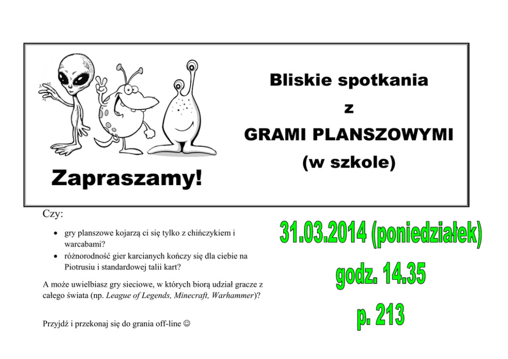 Bliskie spotkania z GRAMI PLANSZOWYMI Zapraszamy! Czy: gry planszowe kojarzą ci się tylko z chińczykiem i warcabami? różnorodność gier karcianych kończy się dla ciebie na Piotrusiu i standardowej talii kart? A może uwielbiasz gry sieciowe, w których biorą udział gracze z całego świata (np. League of Legends, Minecraft, Warhammer)? Przyjdź i przekonaj się do grania off-line (w szkole) Bliskie spotkania z GRAMI PLANSZOWYMI Zapraszamy! Jeżeli: lubisz spędzać czas w towarzystwie, ale nie znosisz niezręcznej ciszy, chcesz poznać nowe osoby od zupełnie innej strony, A może uwielbiasz gry planszowe, ale zawsze brakowało ci większej ekipy do rozgrywki? Nadarza się świetna okazja żeby to zmienić! (w szkole) Bliskie spotkania z GRAMI PLANSZOWYMI Zapraszamy! Jeżeli: lubisz Scrabble i Twistera, ale chcesz poznać coś nowego, chętnie grasz w gry komputerowe i on-line, ale wirtualna interakcja z innymi użytkownikami przestaje ci wystarczać, Zobacz co tzw. planszówki i karcianki mogą Ci zaoferować podczas pierwszych BLISKICH SPOTKAŃ Z GRAMI PLANSZOWYMI w naszym gimnazjum. Mile widziane osoby, które przyniosą swoje gry (w szkole)